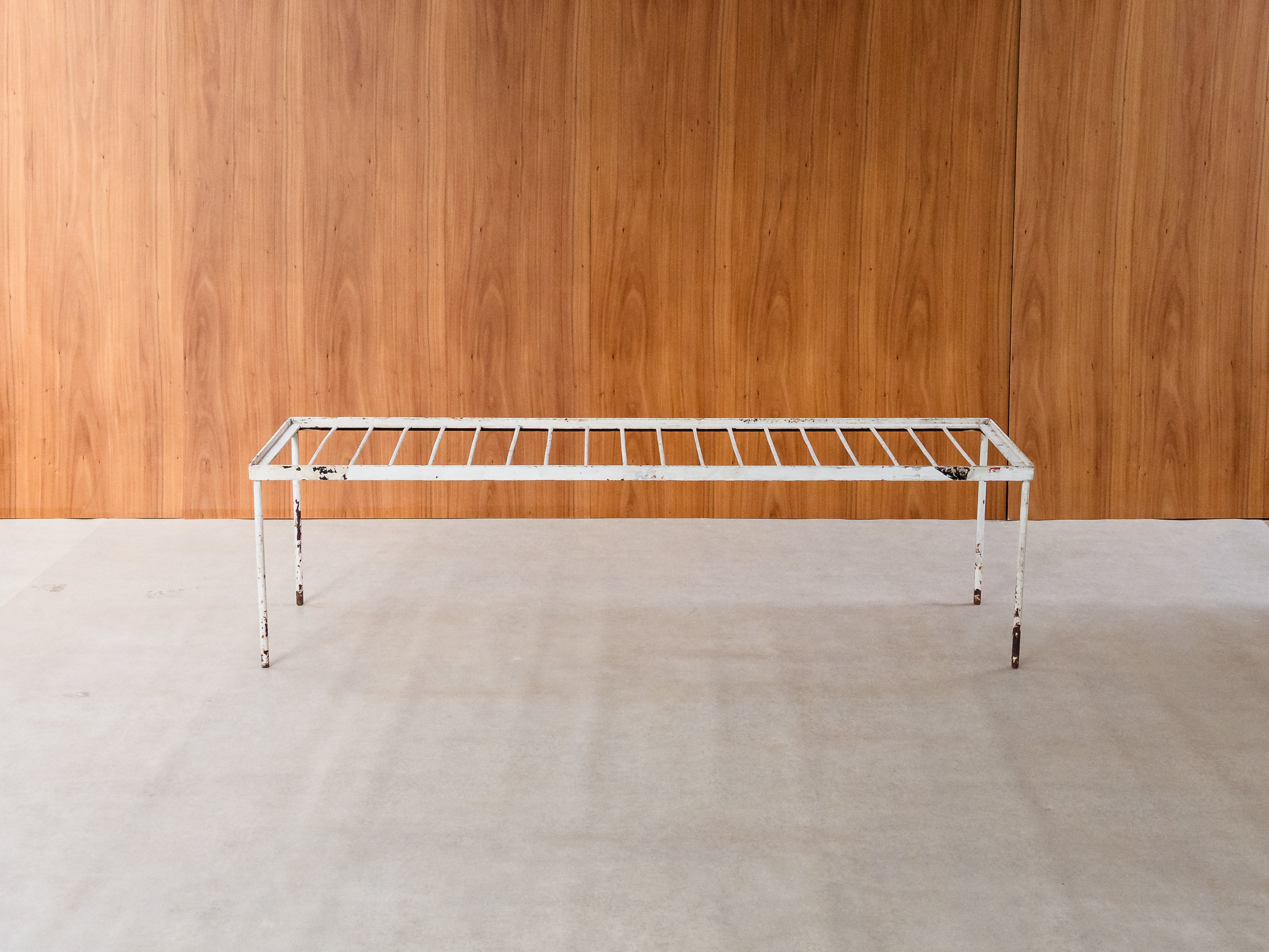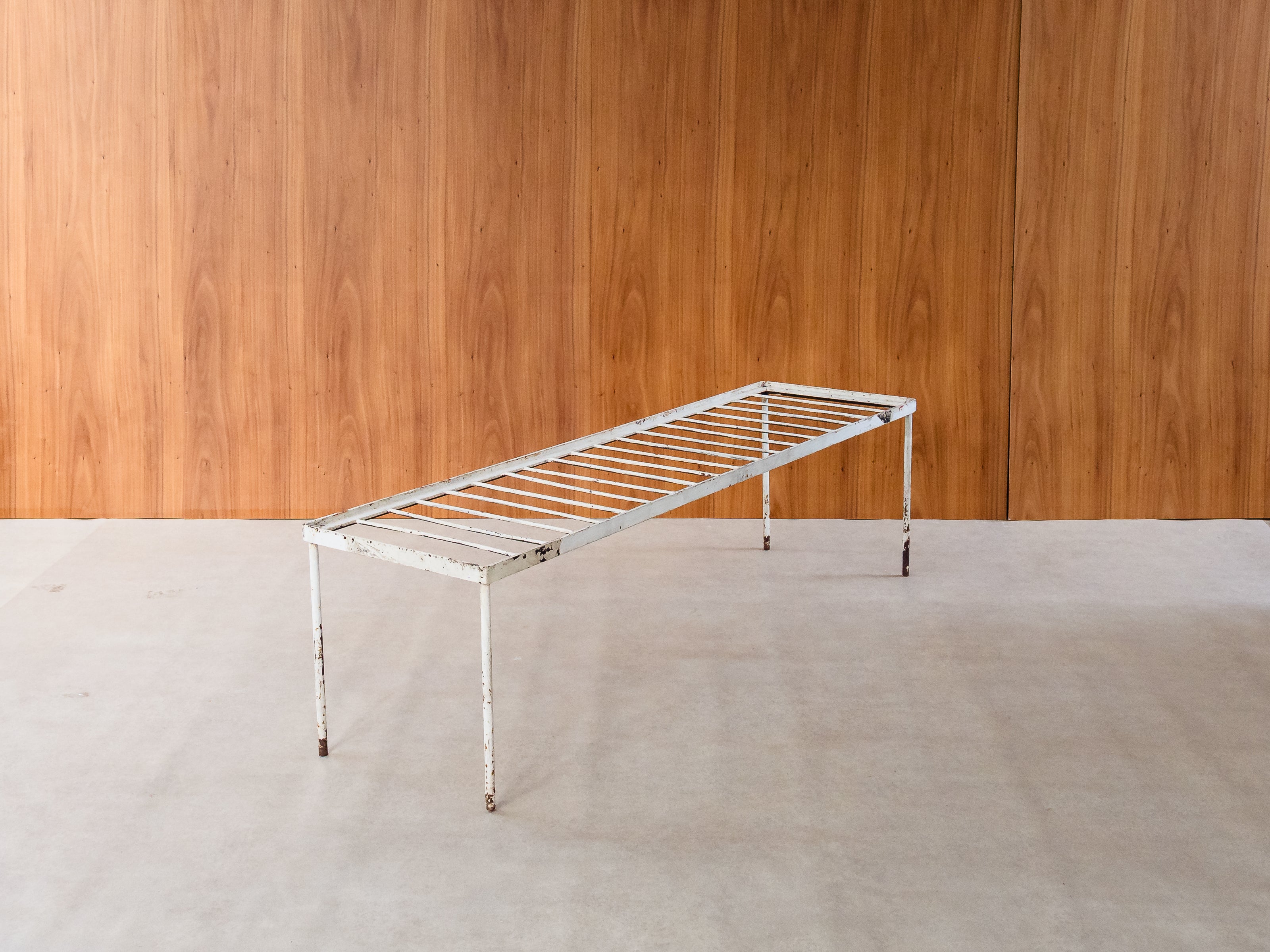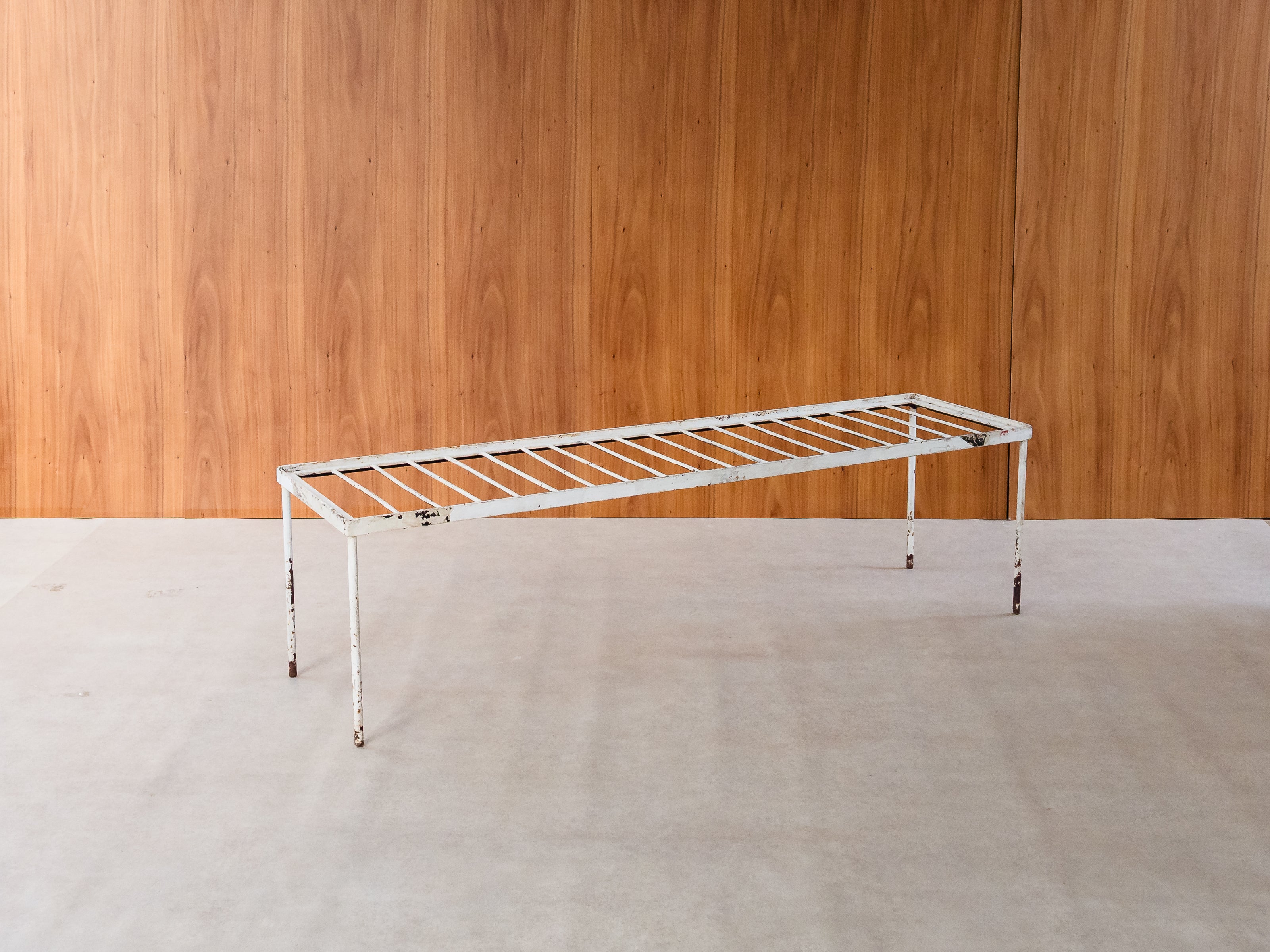 Banco retangular em ferro pintado, com quatro pés e base em gradil de barras paralelas. Peça fotografada no estado atual, prevê restauro completo.