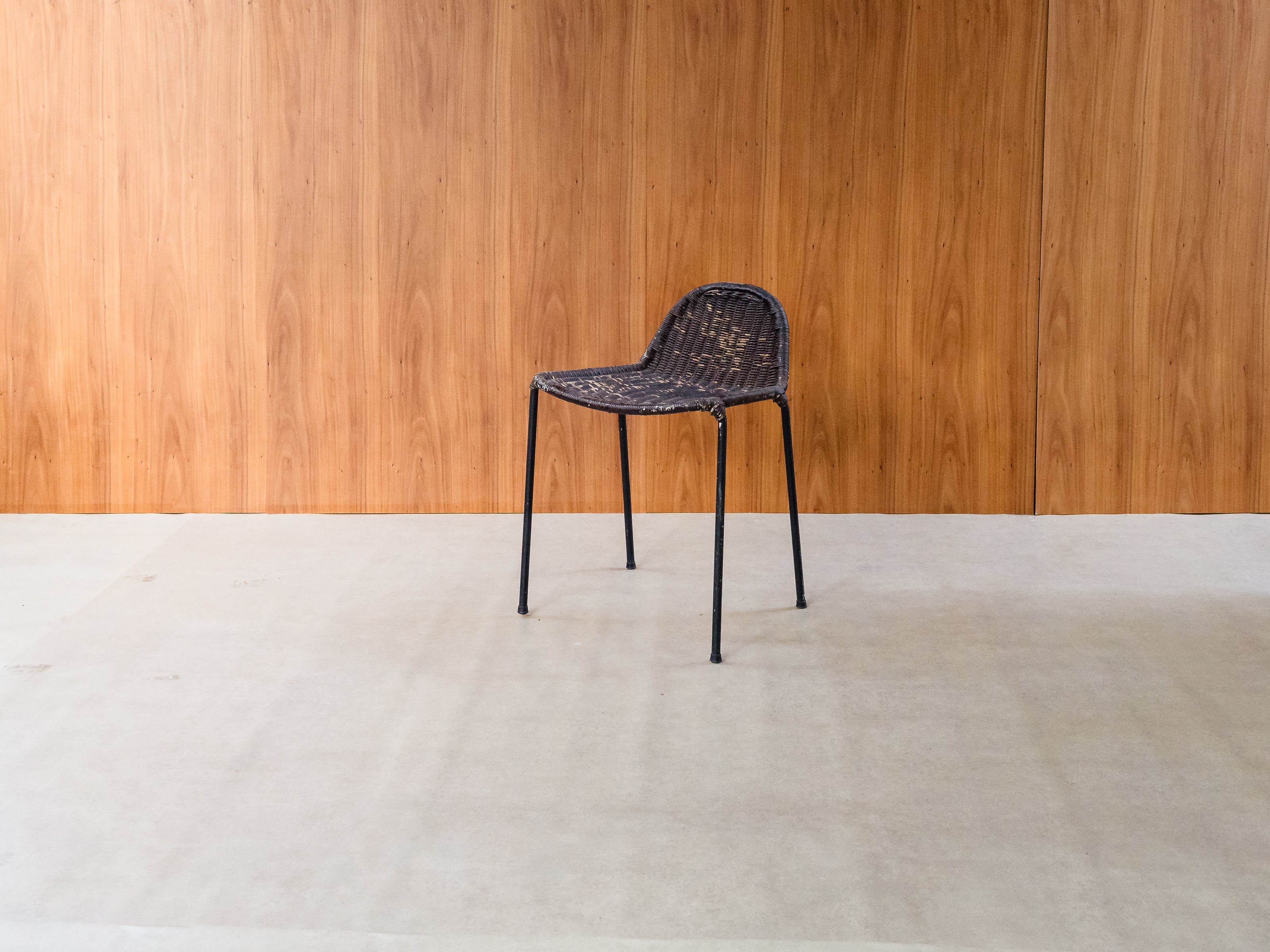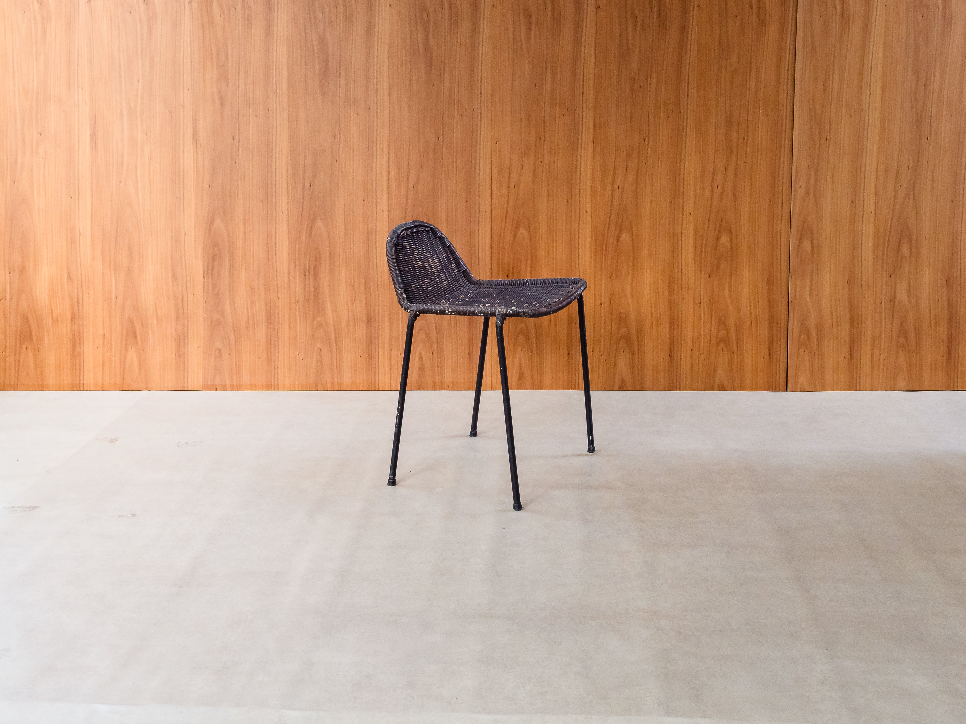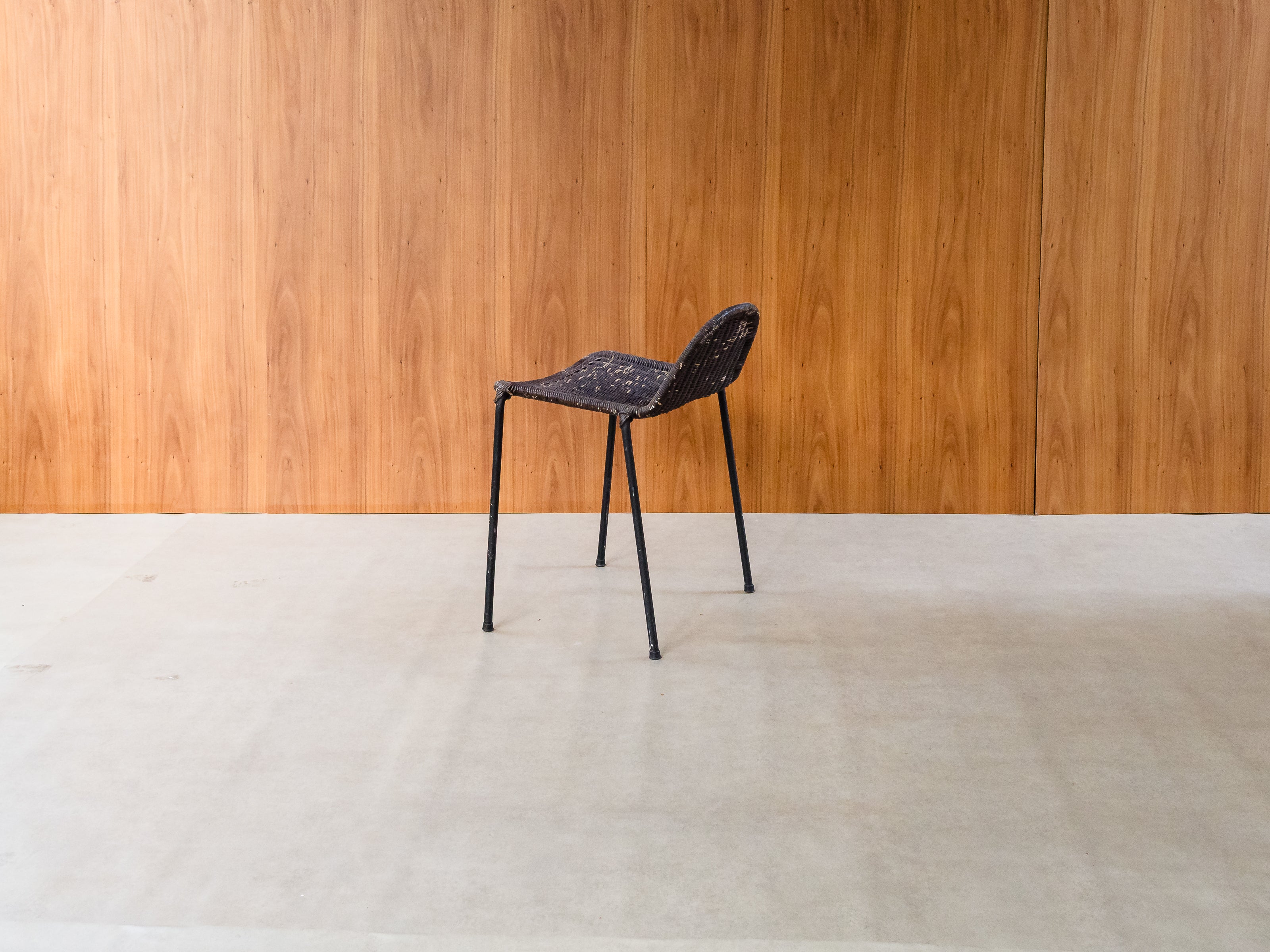 Banqueta em ferro com assento trançado em junco. Peça fotografada no estado original, prevê restauro dos acabamentos. Três unidades disponíveis, valor unitário.