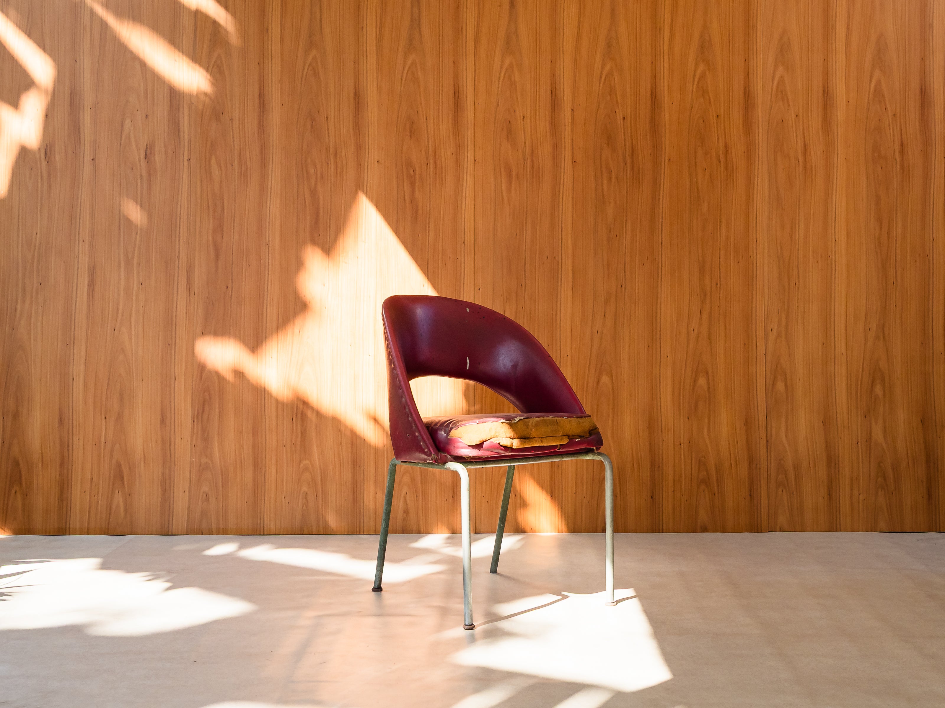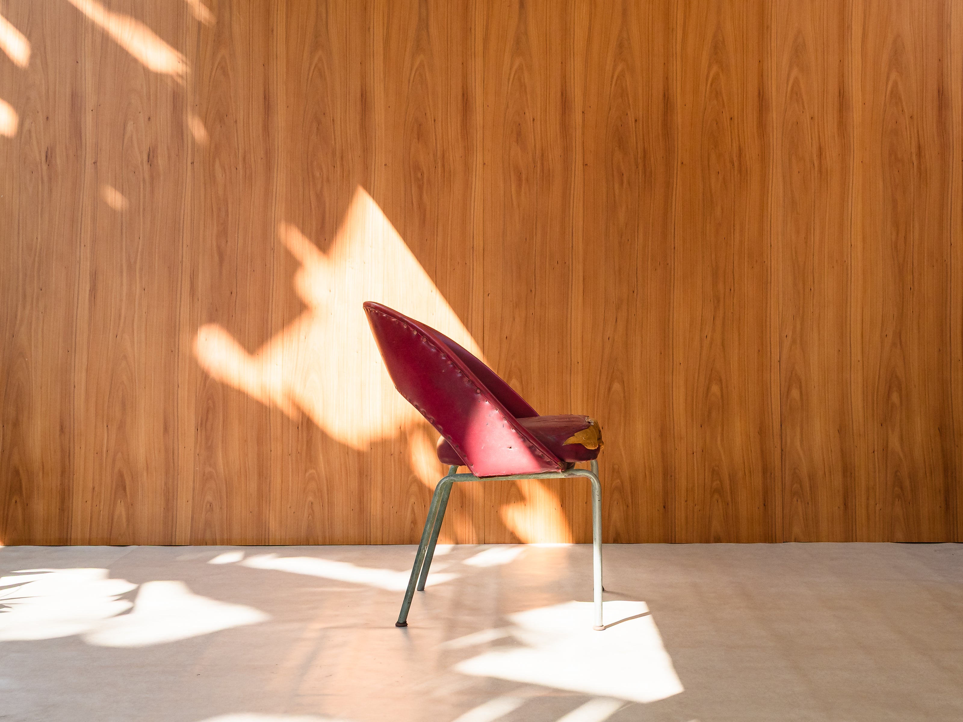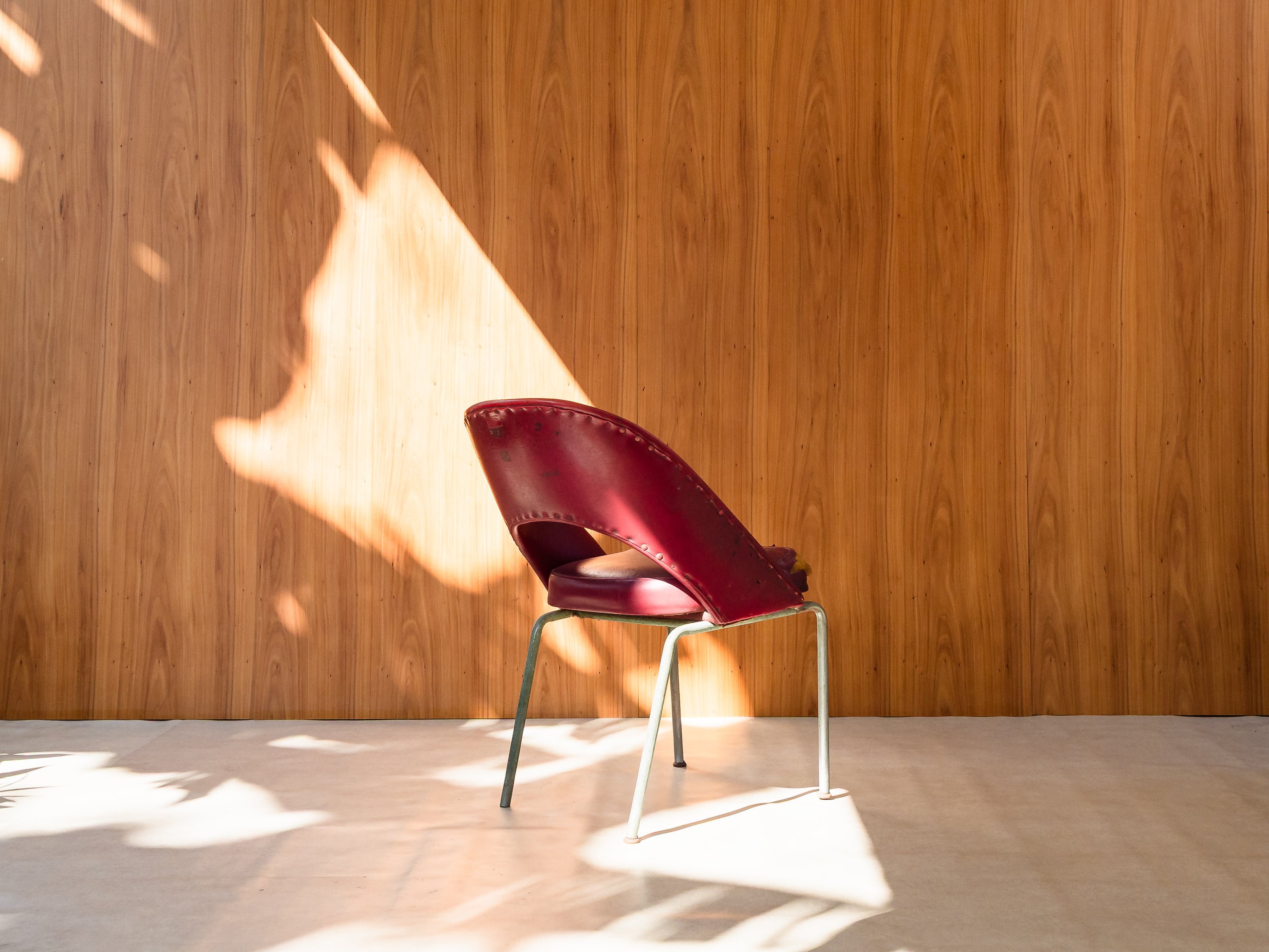 Cadeira estofada com encosto arqueado e base em metal cromado. Peça fotografada no estado atual, com desgastes na cromagem. Valor inclui novo estofamento com tecido fornecido pelo cliente. Quatro unidades disponíveis, valor unitário.