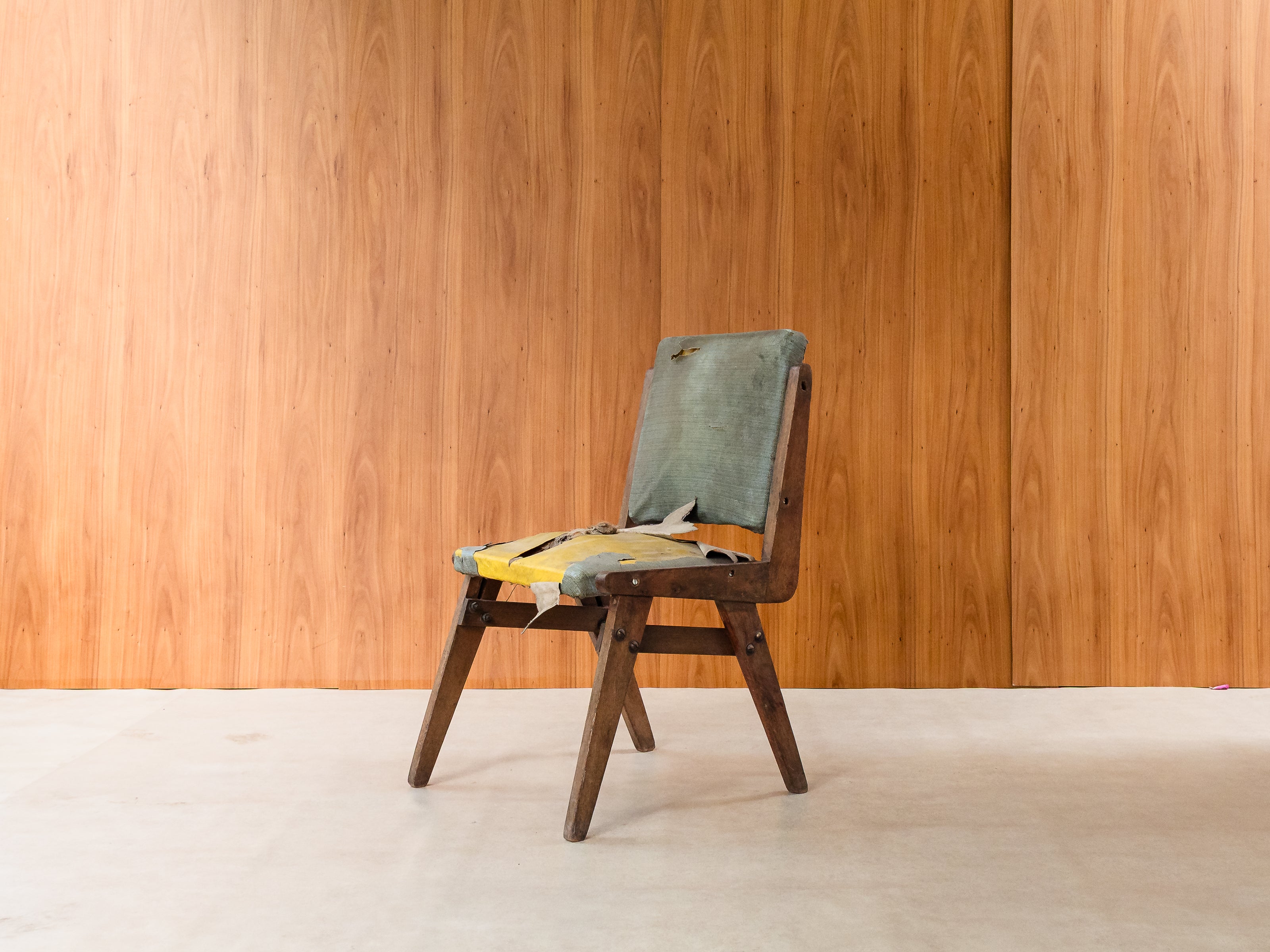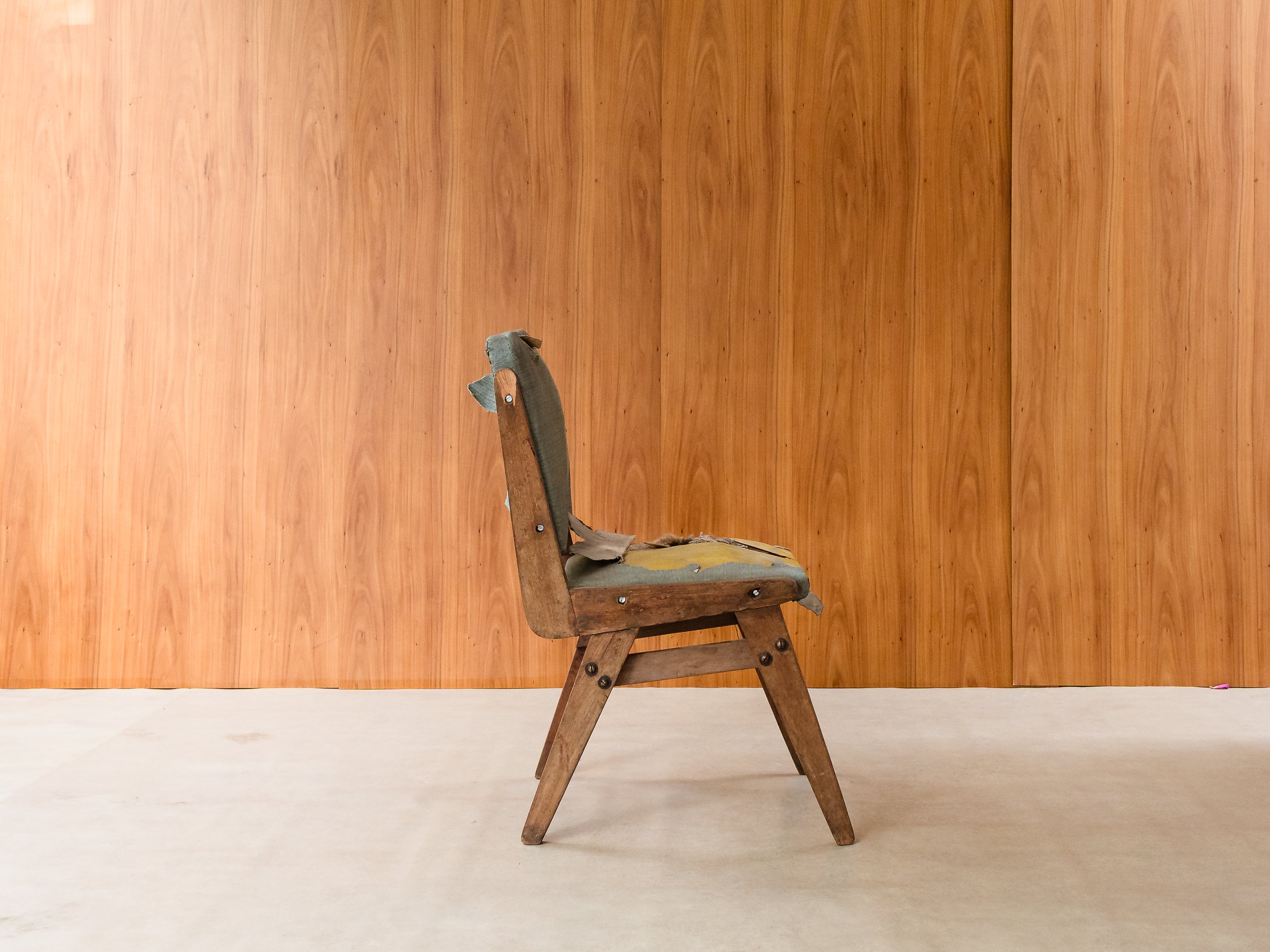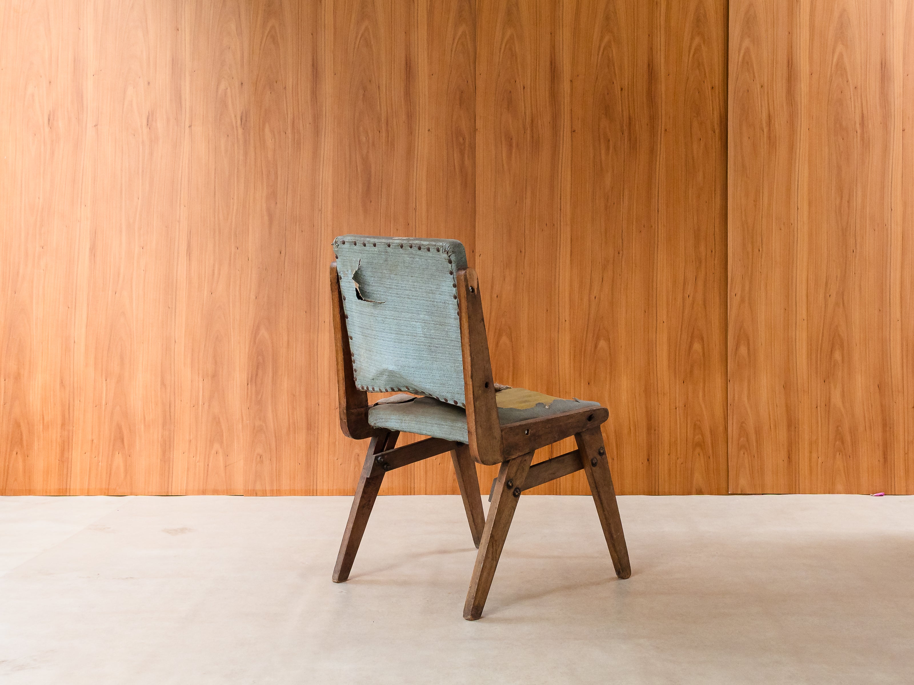 Cadeira com assento e encosto estofados, com estrutura em madeira clara e acabamentos de botões arredondados nas laterais. Peça fotografada no estado atual, prevê restauro completo com novo estofamento (tecido fornecido pelo cliente).