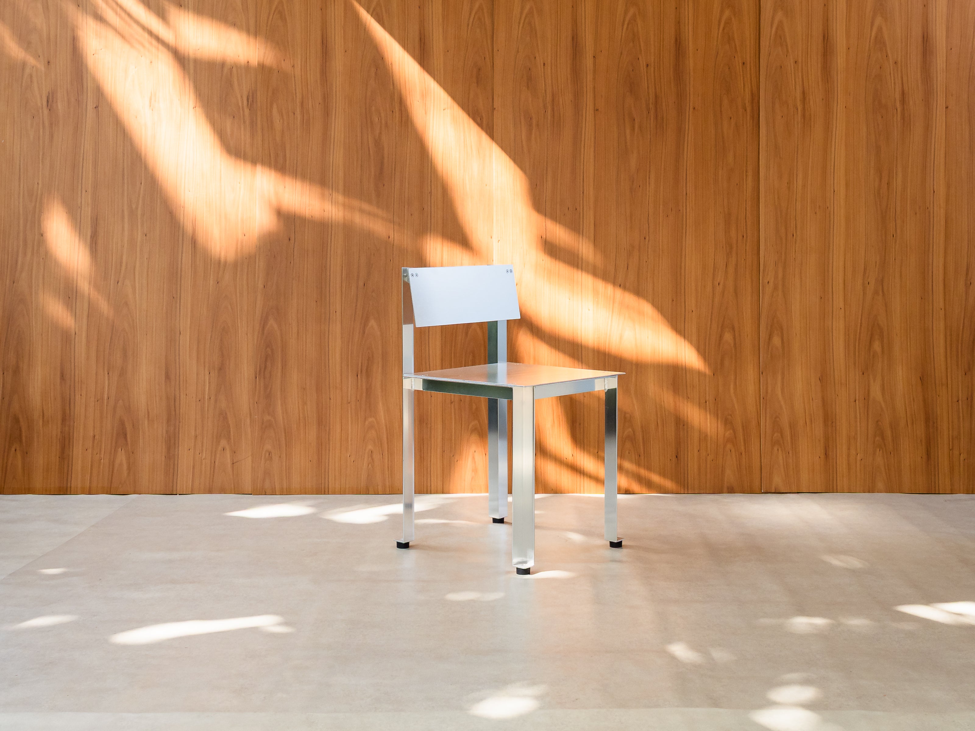 Cadeira em chapa e cantoneiras de alumínio anodizadas, ponteiras em disco de borracha maciça e parafusos em inox. Peça produzida sob-encomenda, consulte o prazo de produção.