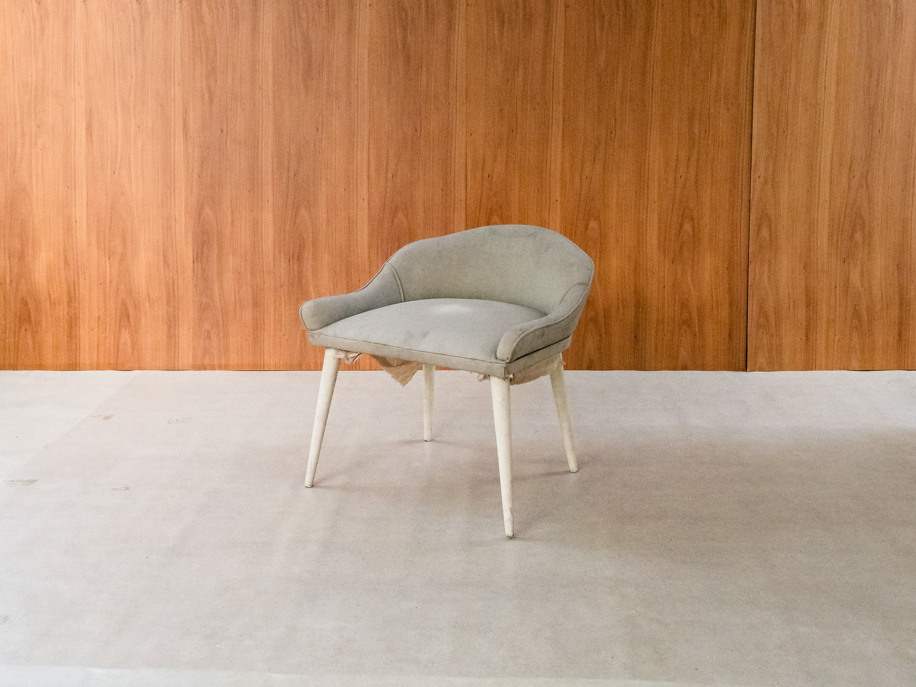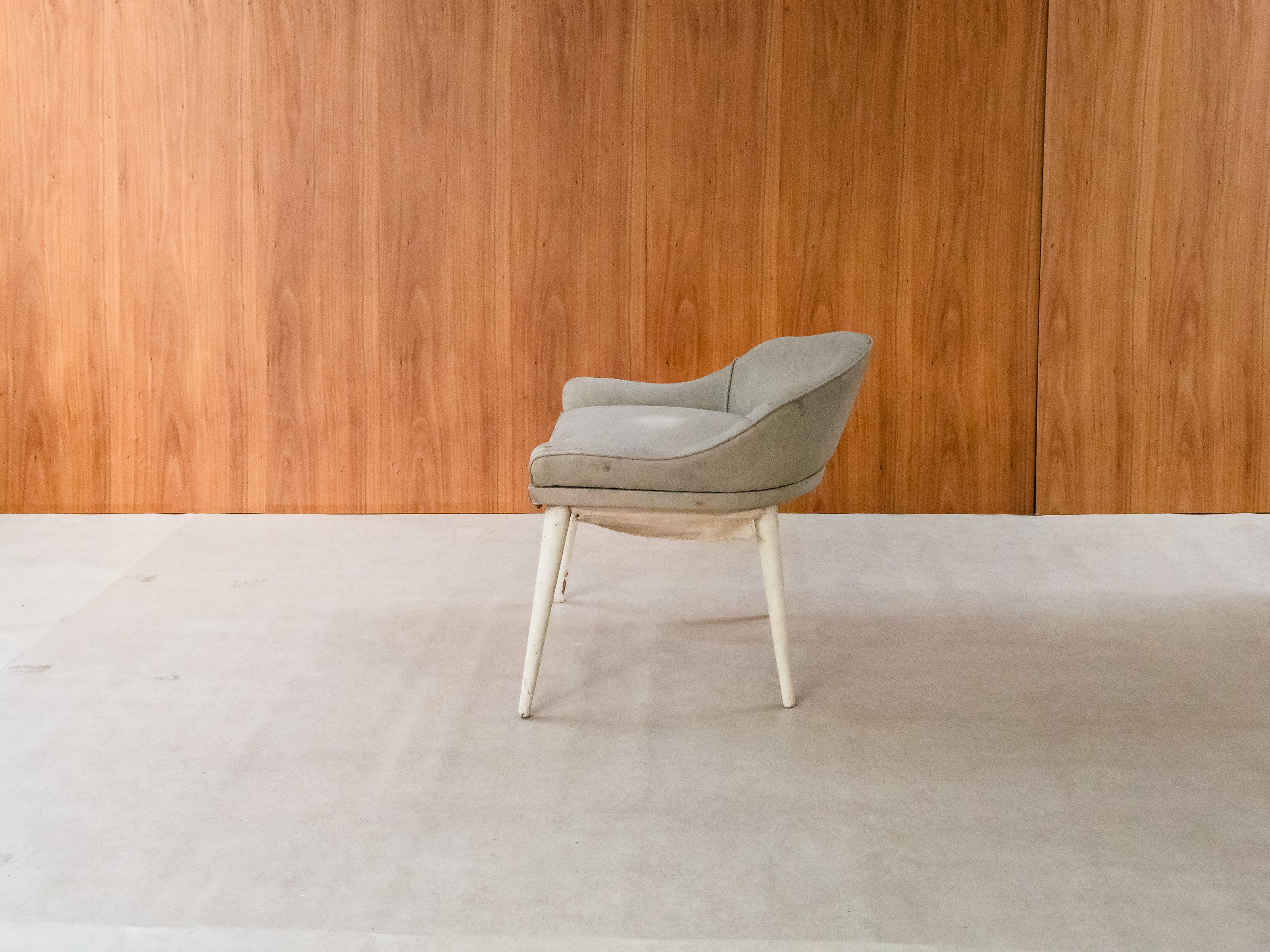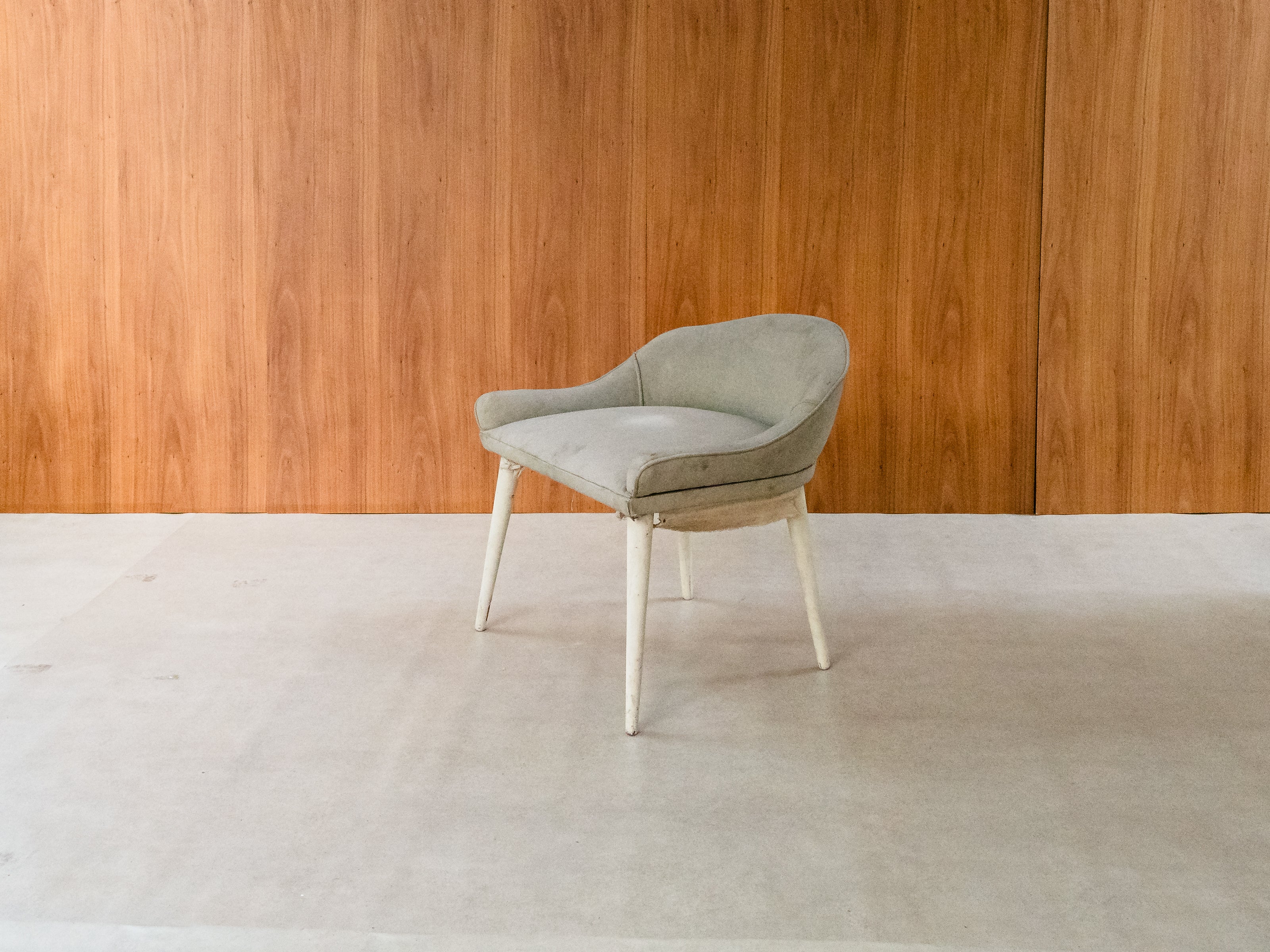 Poltrona de penteadeira com pés palito em madeira maciça pintada, com assento estofado. Peça fotografada no estado atal, prevê restauro completo com novo estofamento (tecido fornecido pelo cliente).
