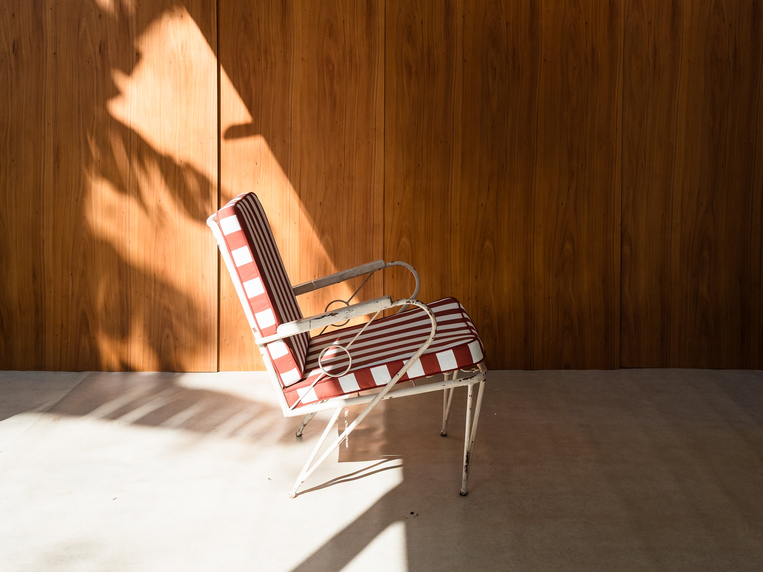 Poltrona de área externa em ferro, assento em molas com almofadas soltas e ponteiras em latão. Peça fotografada no estado atual, valor inclui restauro completo com tecido fornecido pelo cliente. Temos 4 unidades disponíveis, valor unitário.