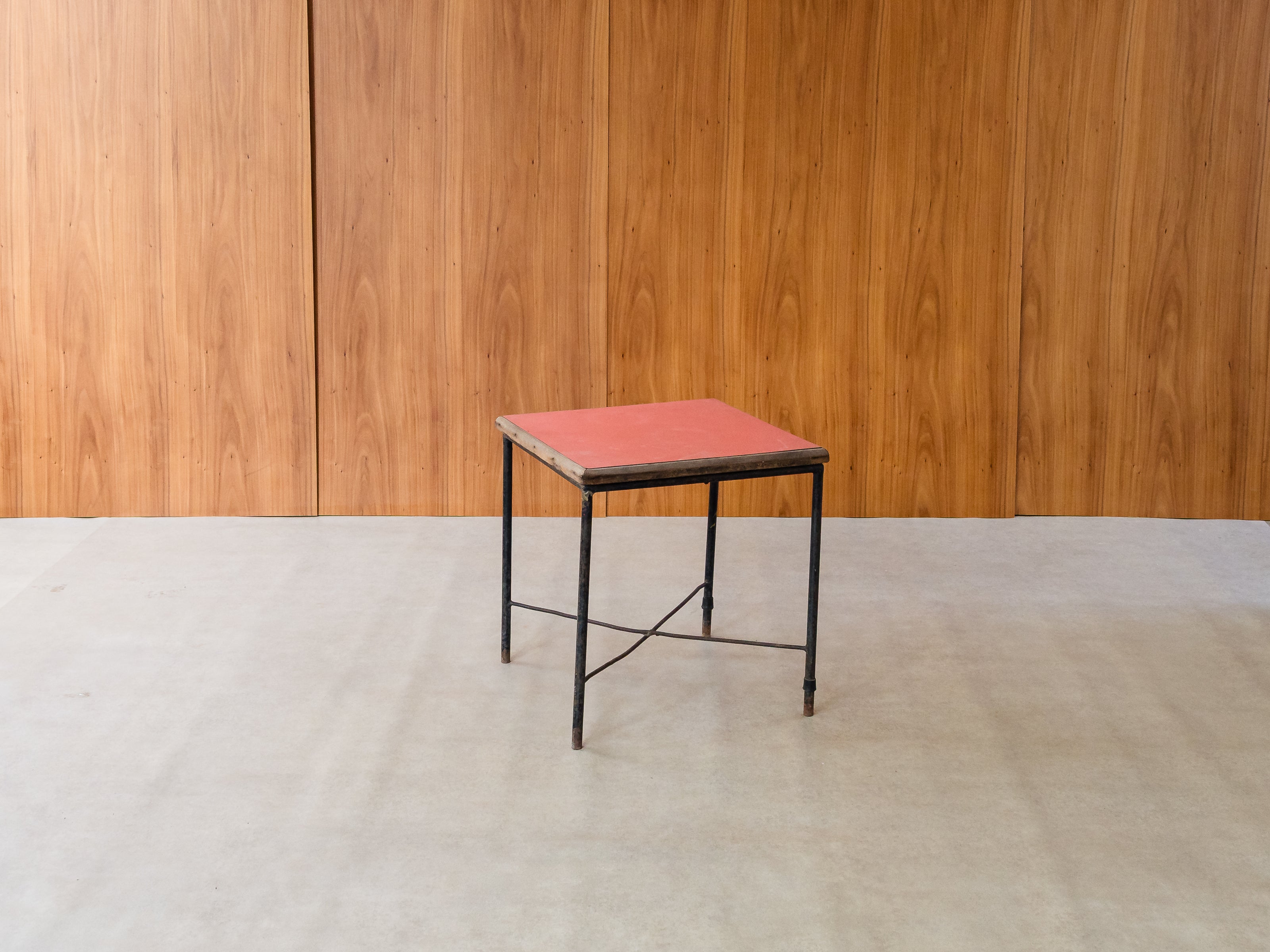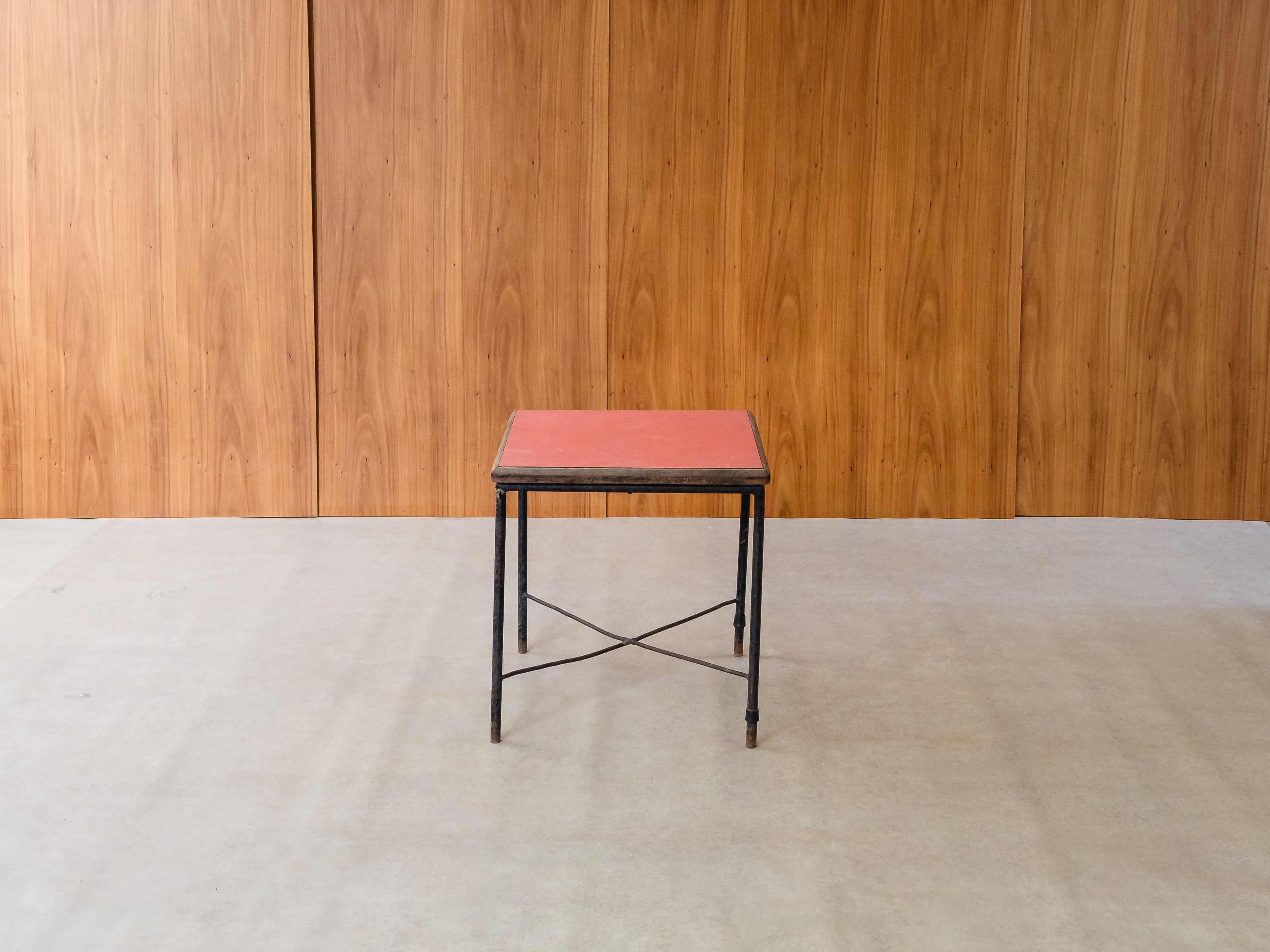 Mesa em ferro com acabamento em cruz na base, tampo em madeira e formica. Peça produzida pela Unilabor nos anos 1950, com desenho de Geraldo de Barros. Fotografada no estado atual.