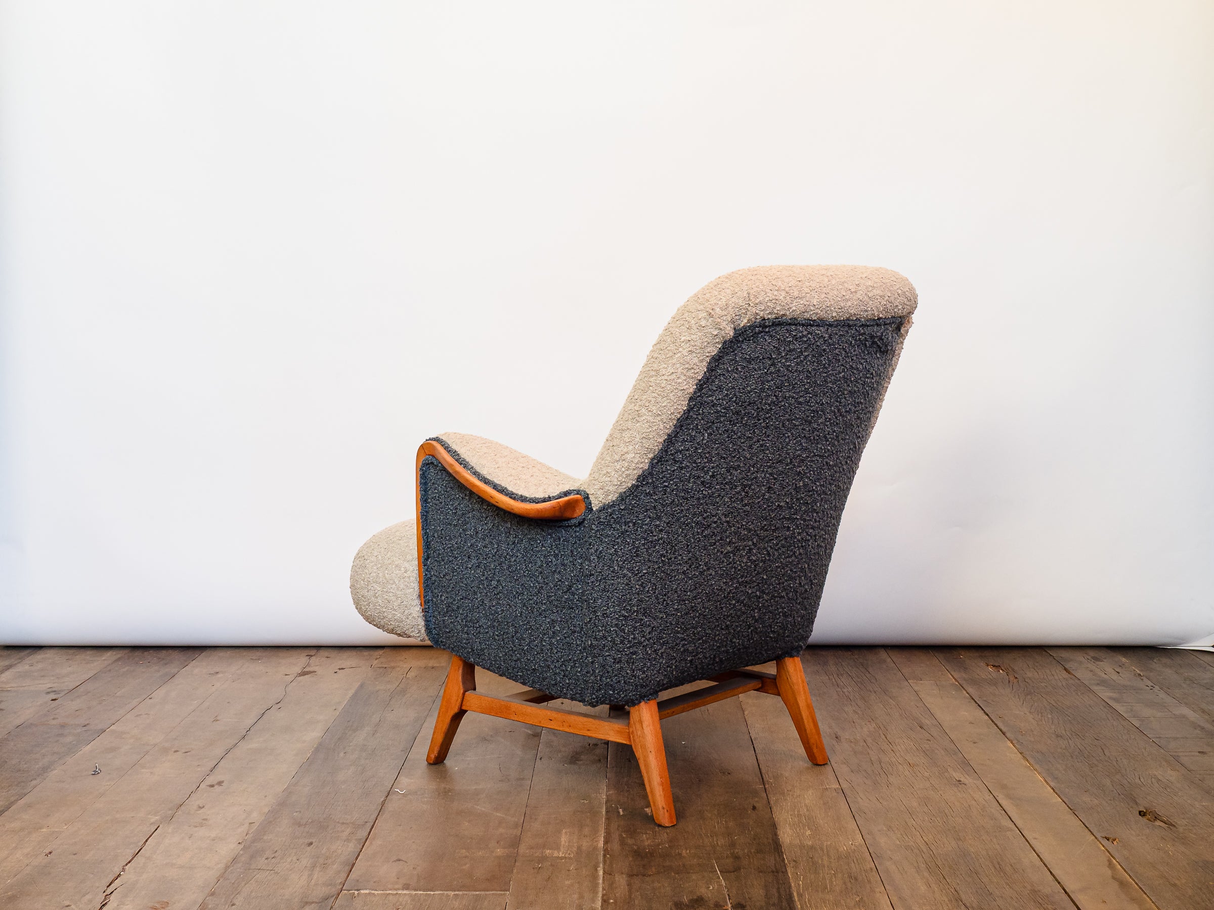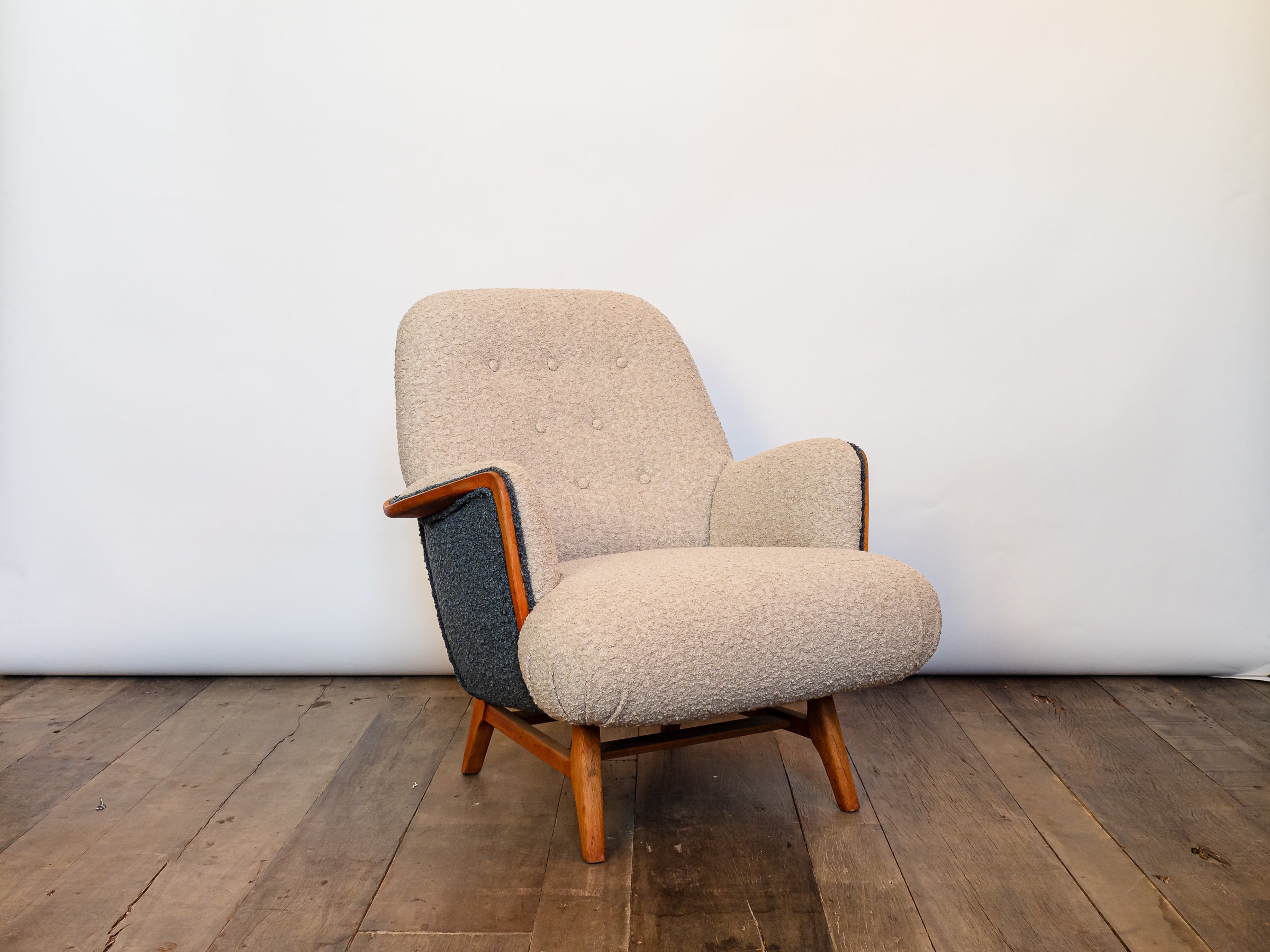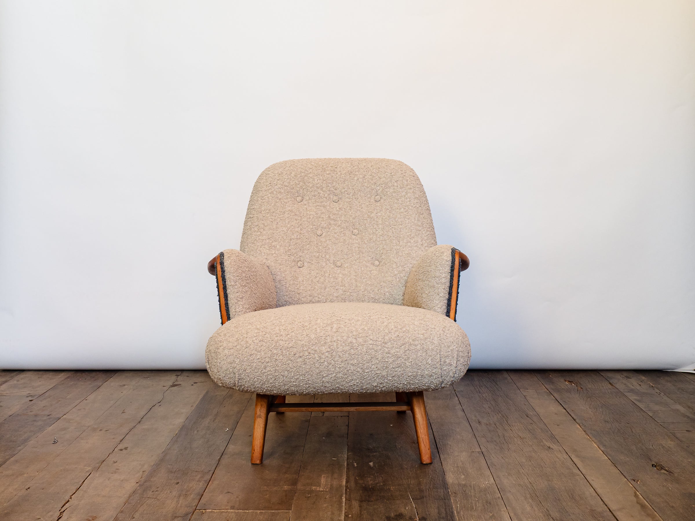 Poltrona estofada com espaldar alto, estrutura em madeira com destaque especial para o contorno dos braços.