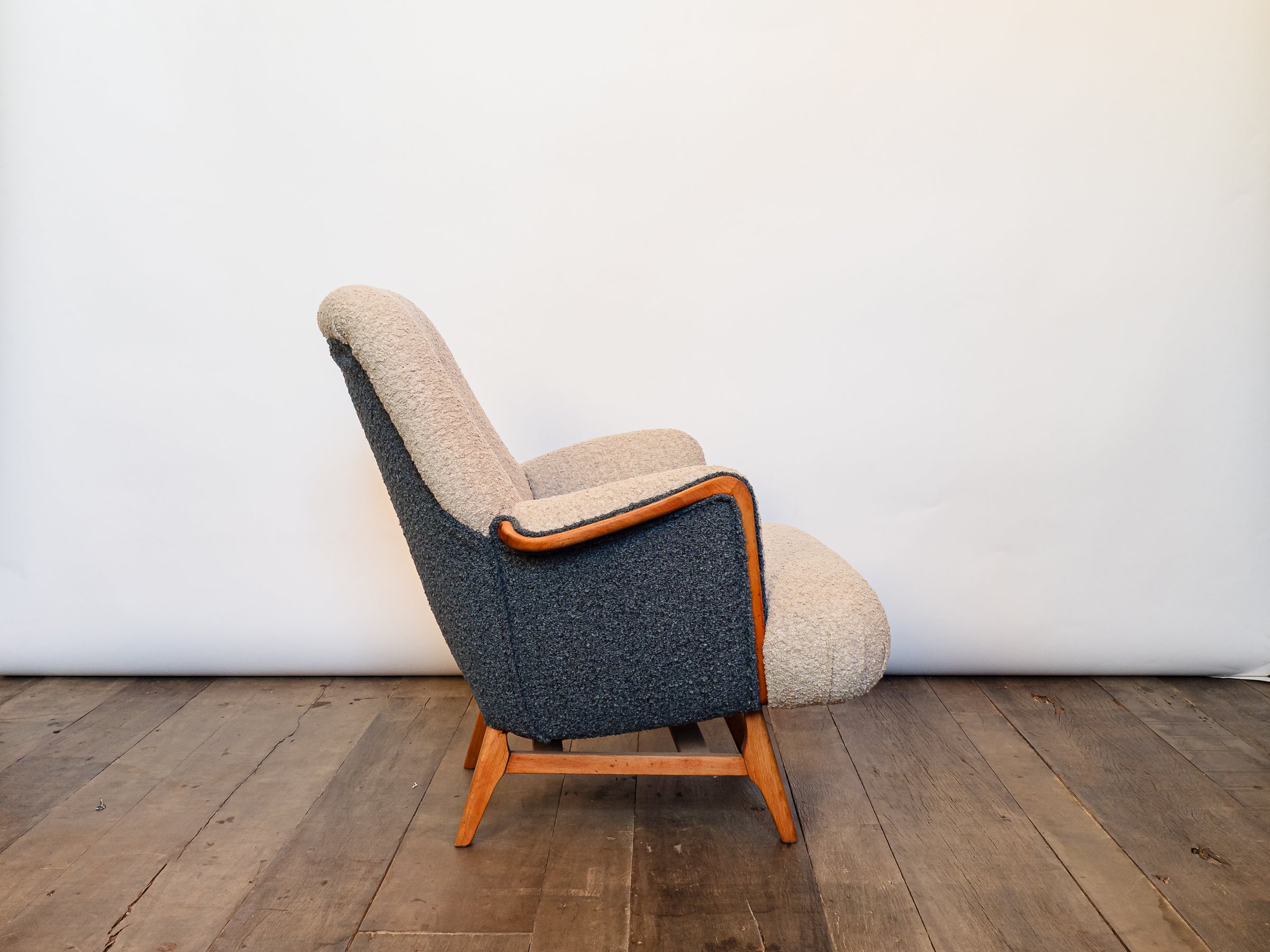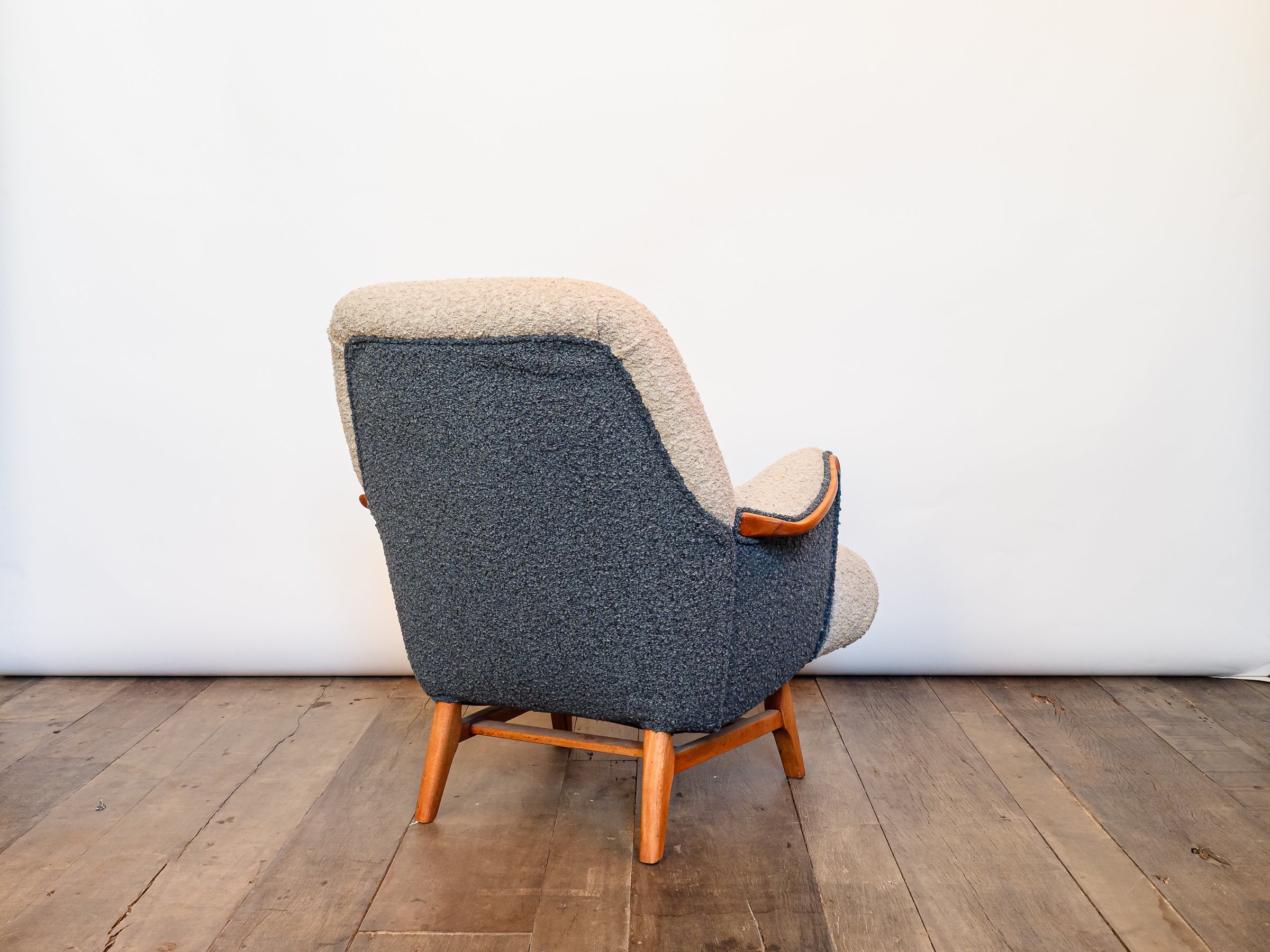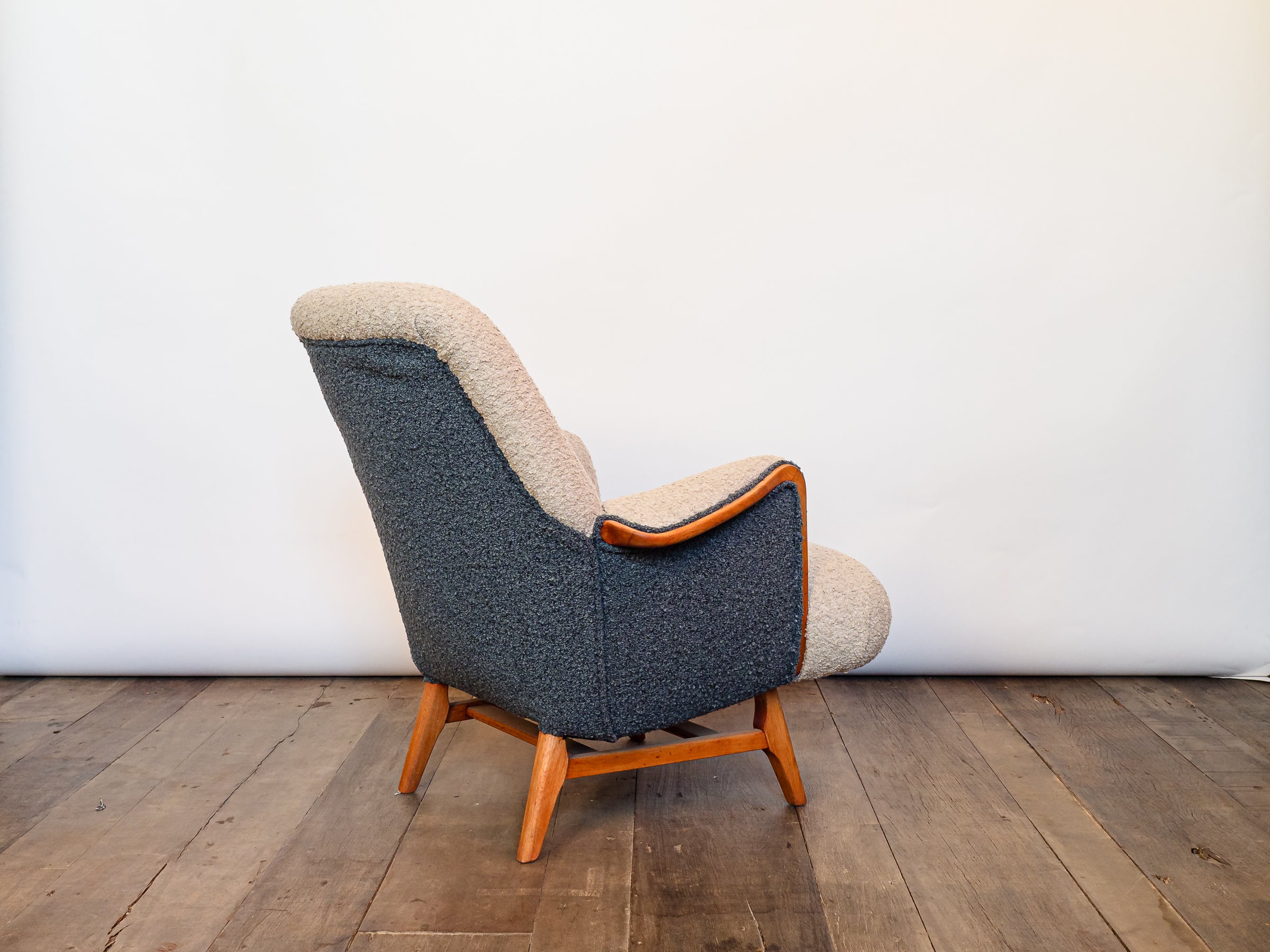 Poltrona estofada com espaldar alto, estrutura em madeira com destaque especial para o contorno dos braços.