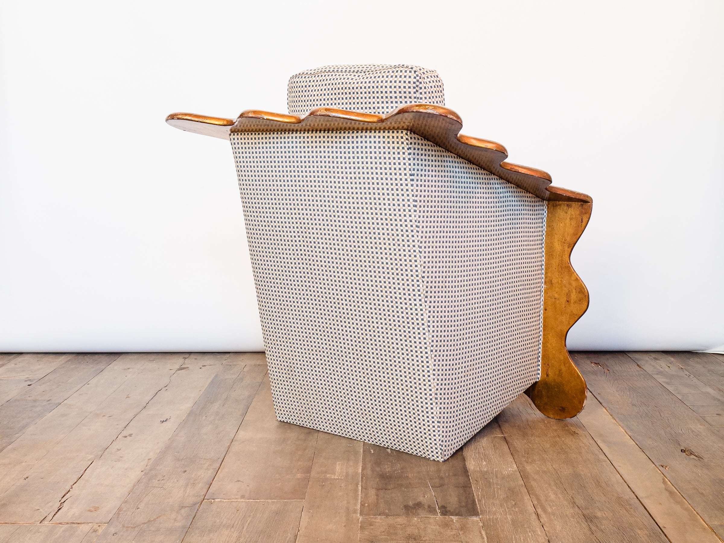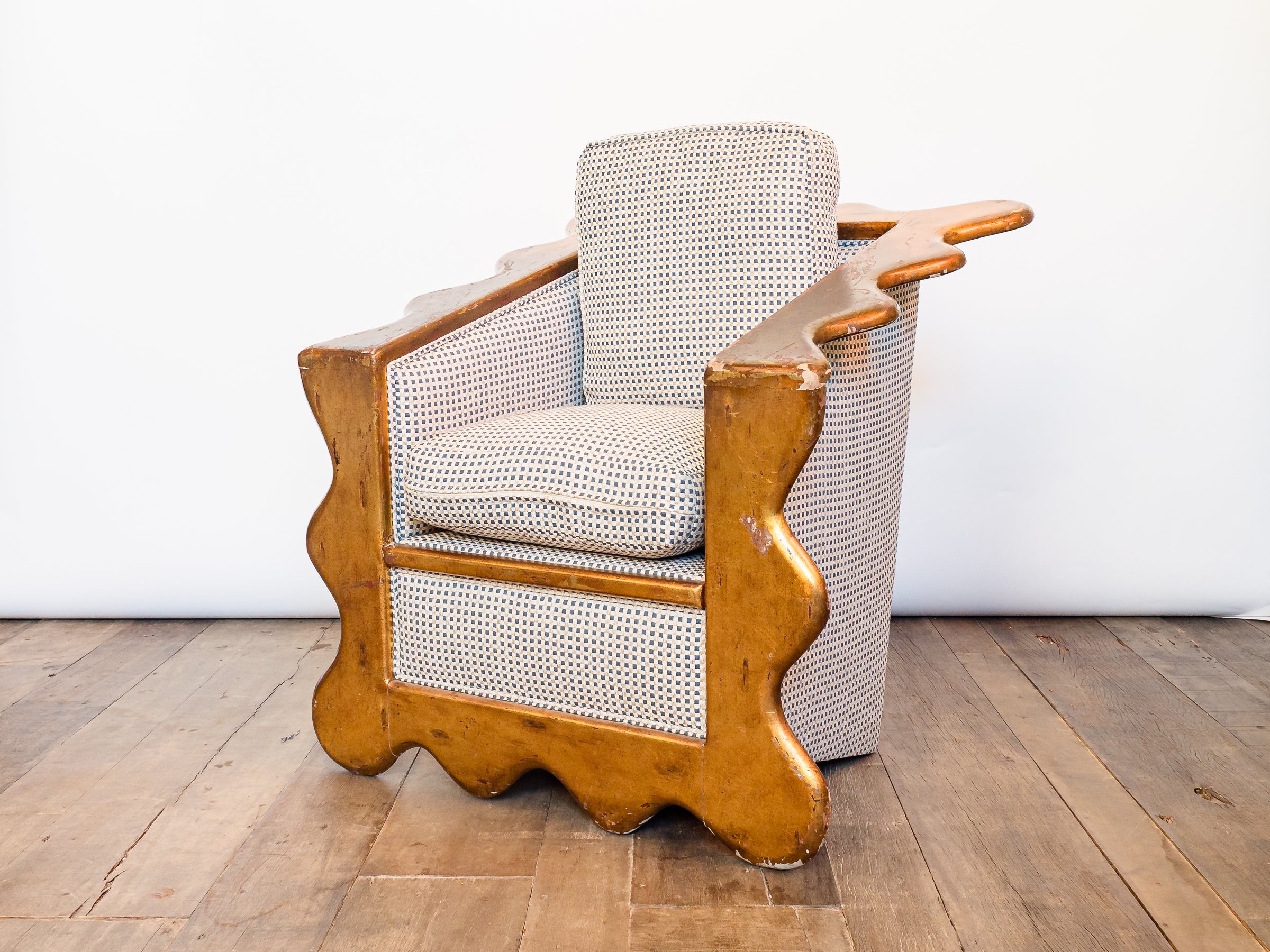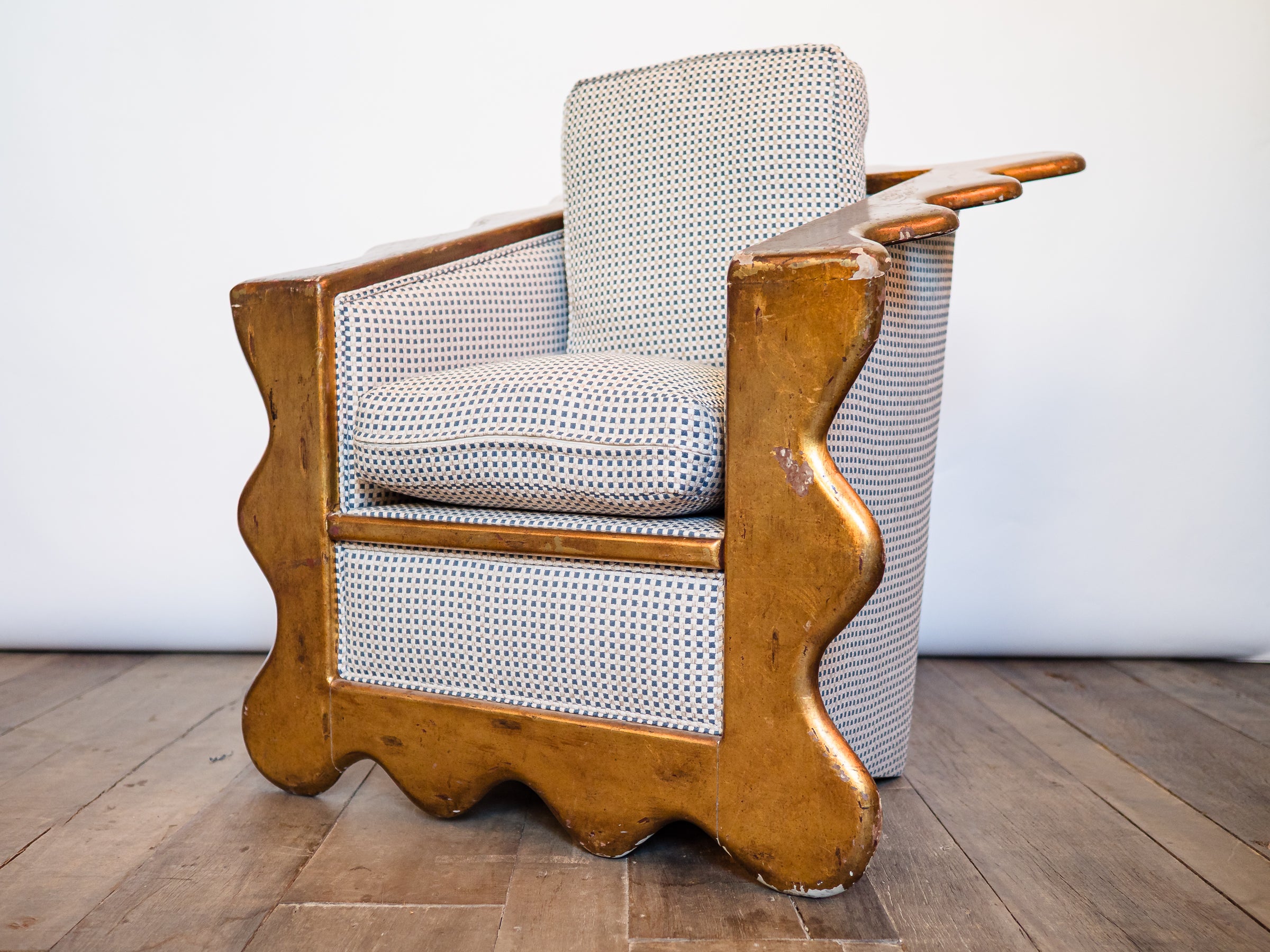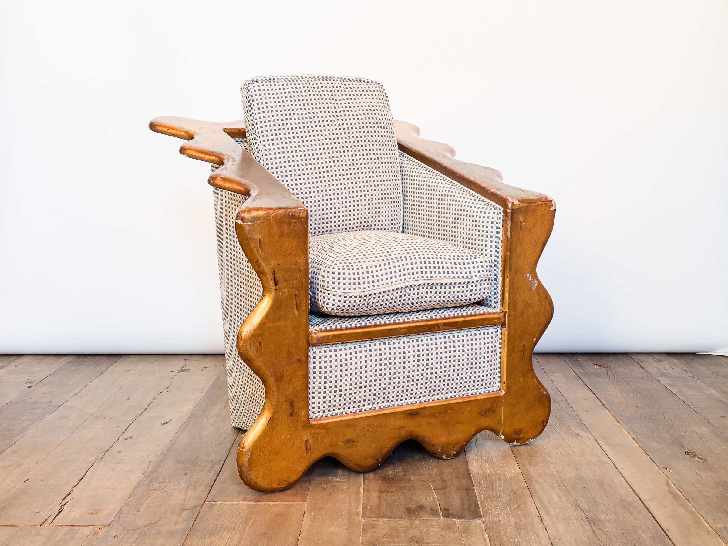 Grande poltrona estofada, com acabamento em madeira contornando seu perímetro frontal, desenho ondulado finalizado com a aplicação de folhas de ouro.