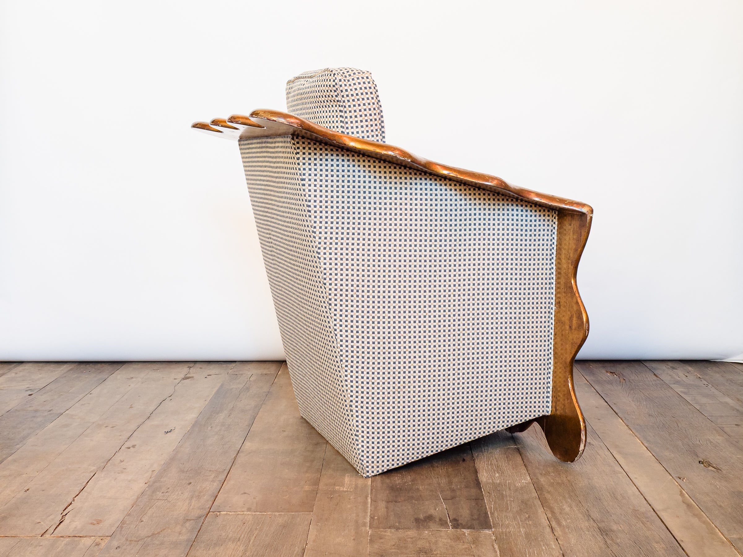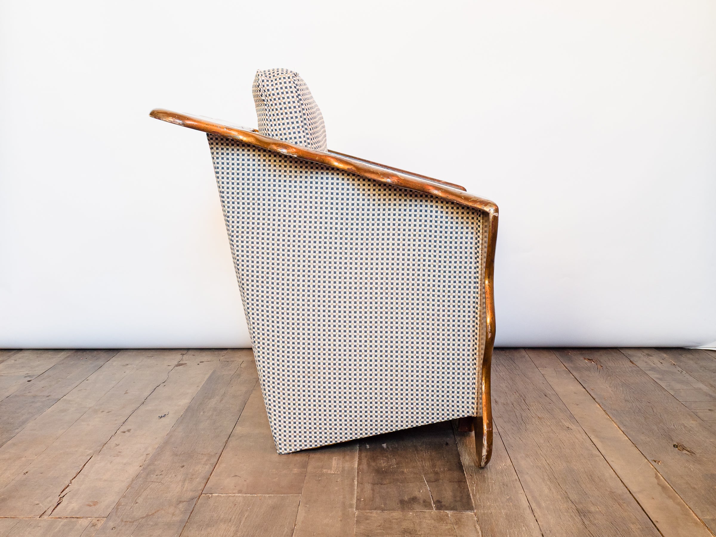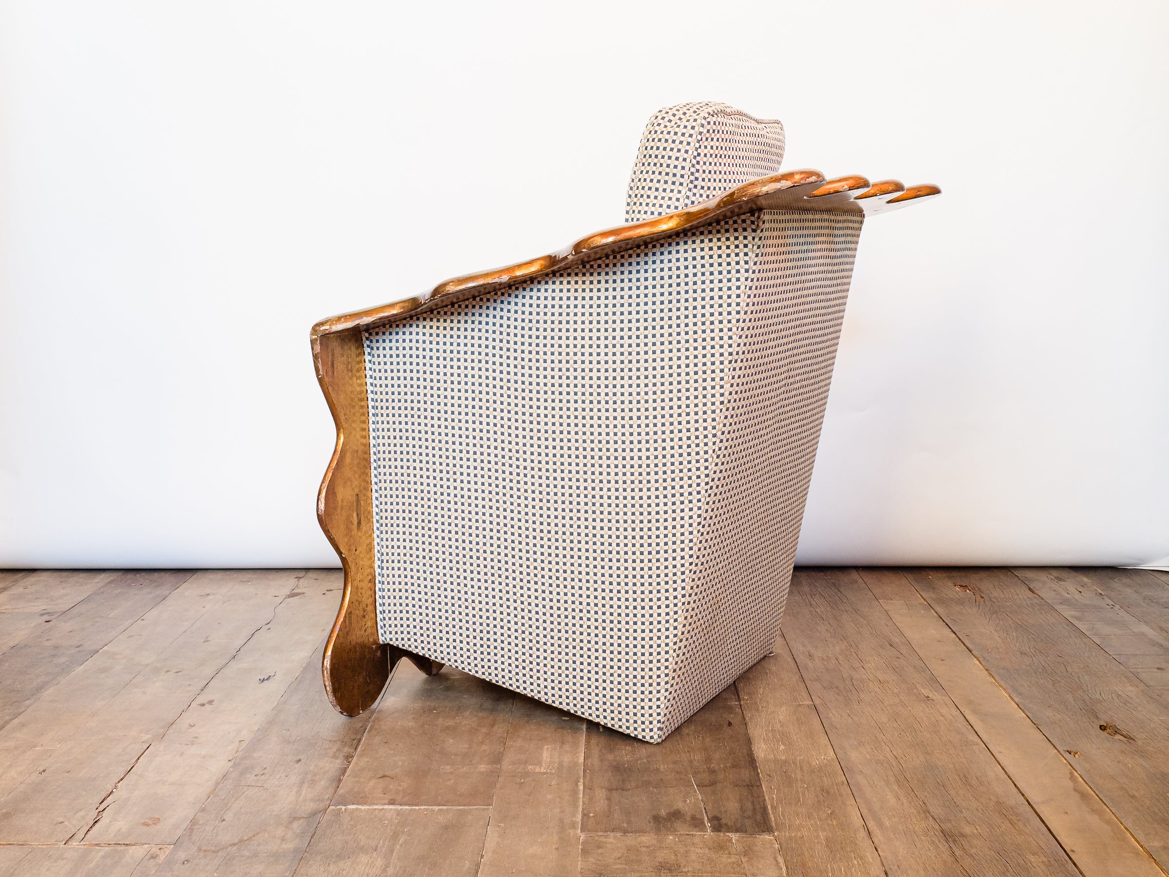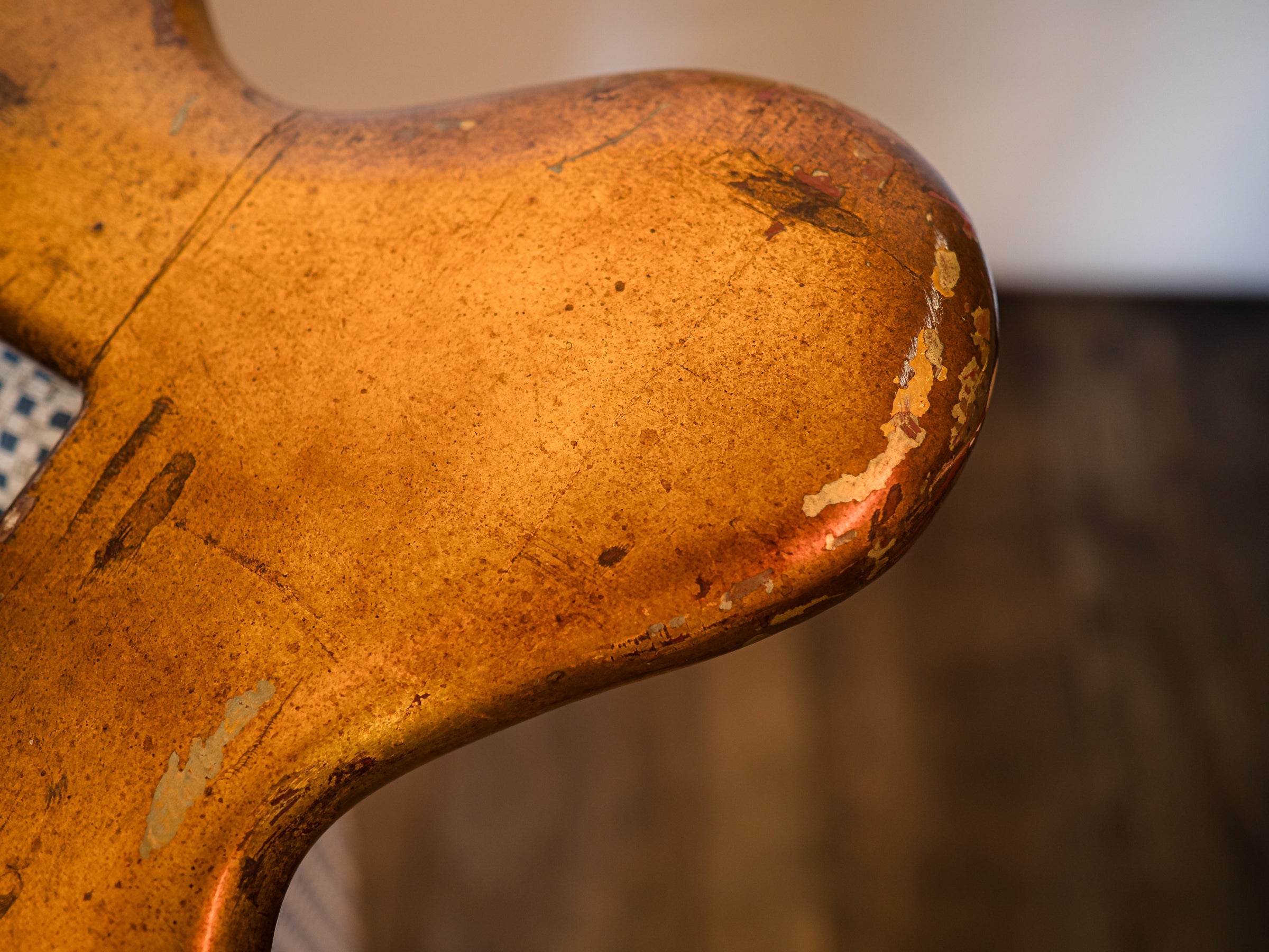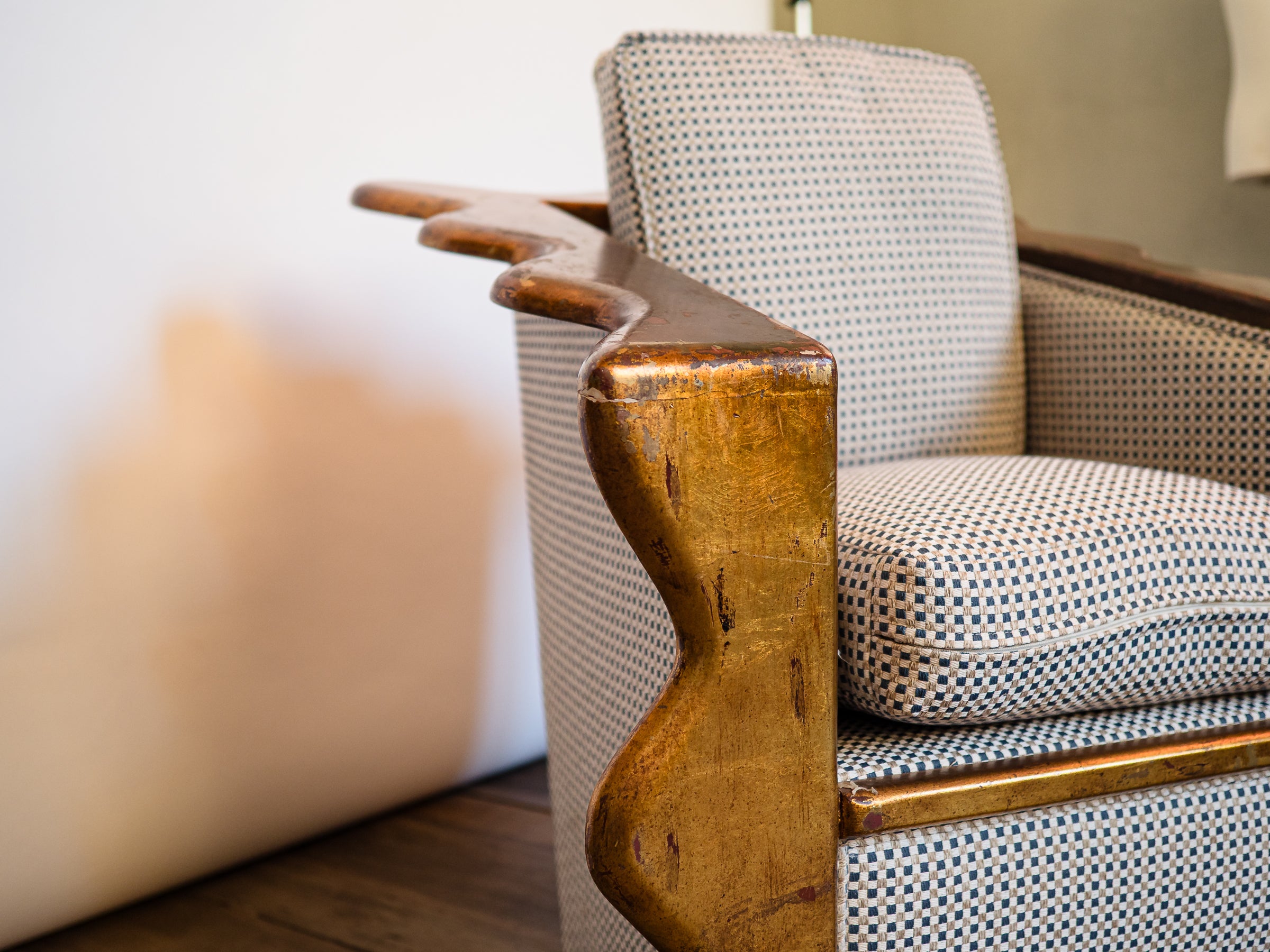 Grande poltrona estofada, com acabamento em madeira contornando seu perímetro frontal, desenho ondulado finalizado com a aplicação de folhas de ouro.