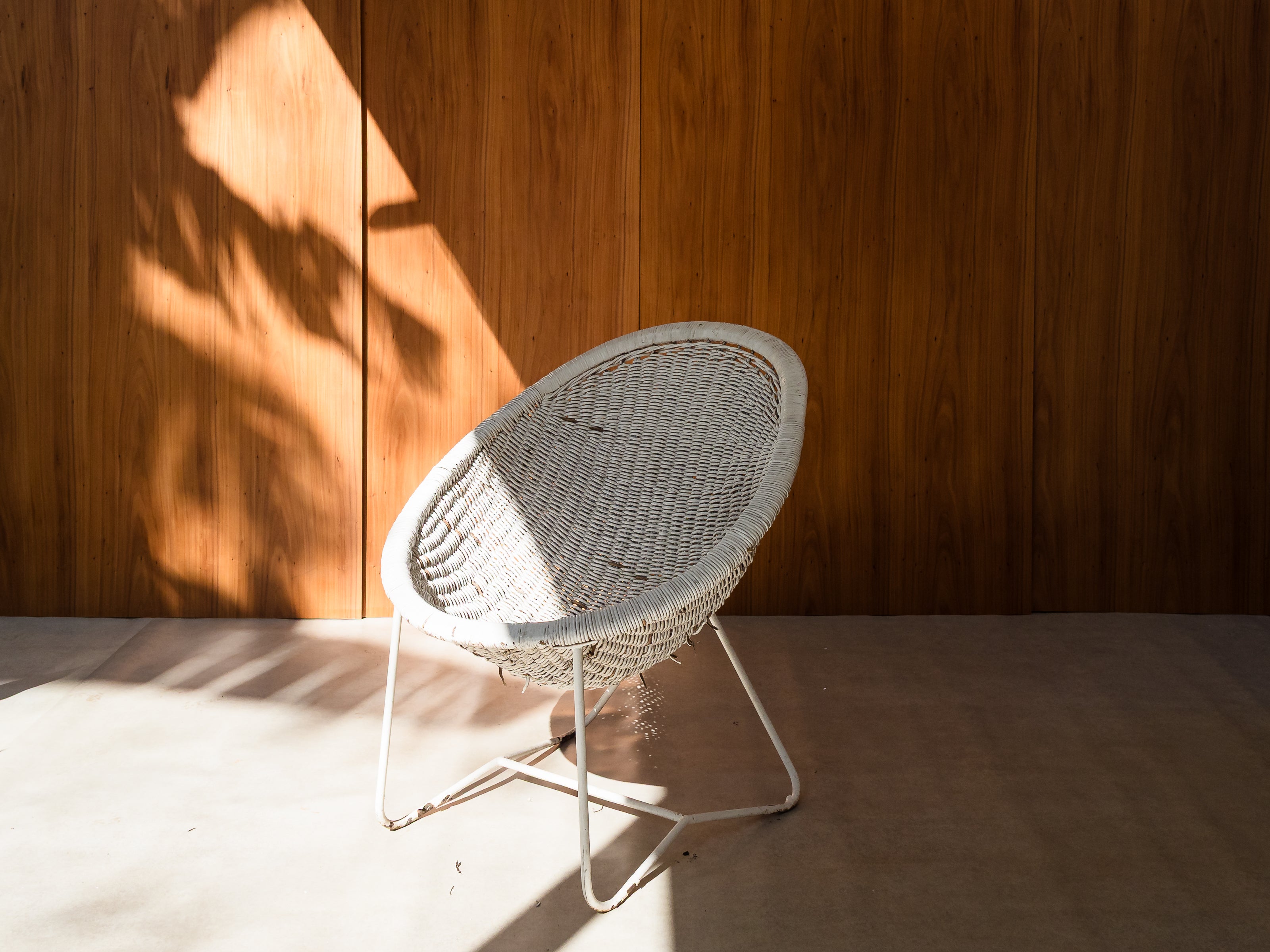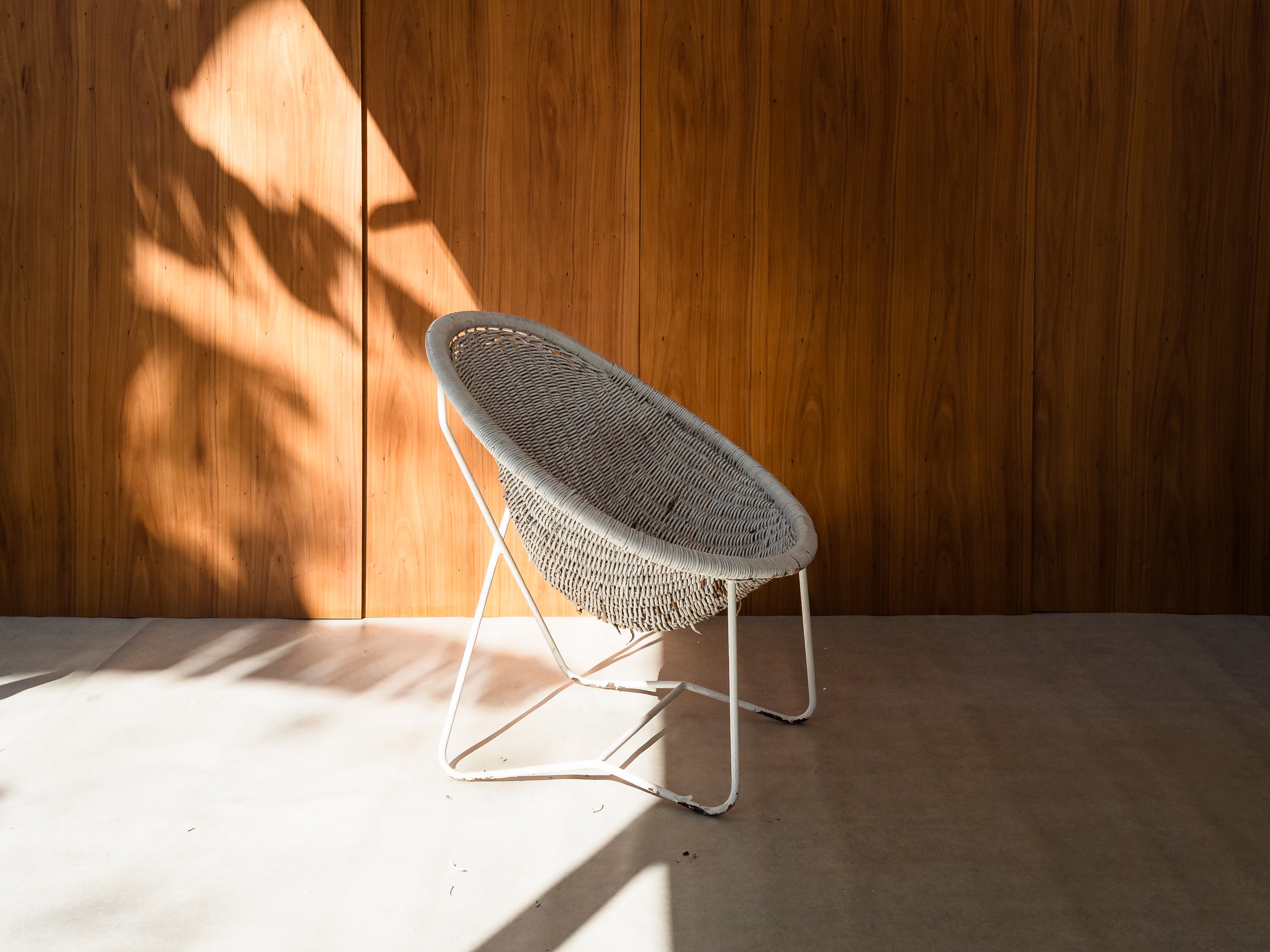 Poltrona com estrutura em ferro e concha em junco natural, desenhada por Carlo Hauner. Peça fotografada no estado atual, valor prevê restauro completo.