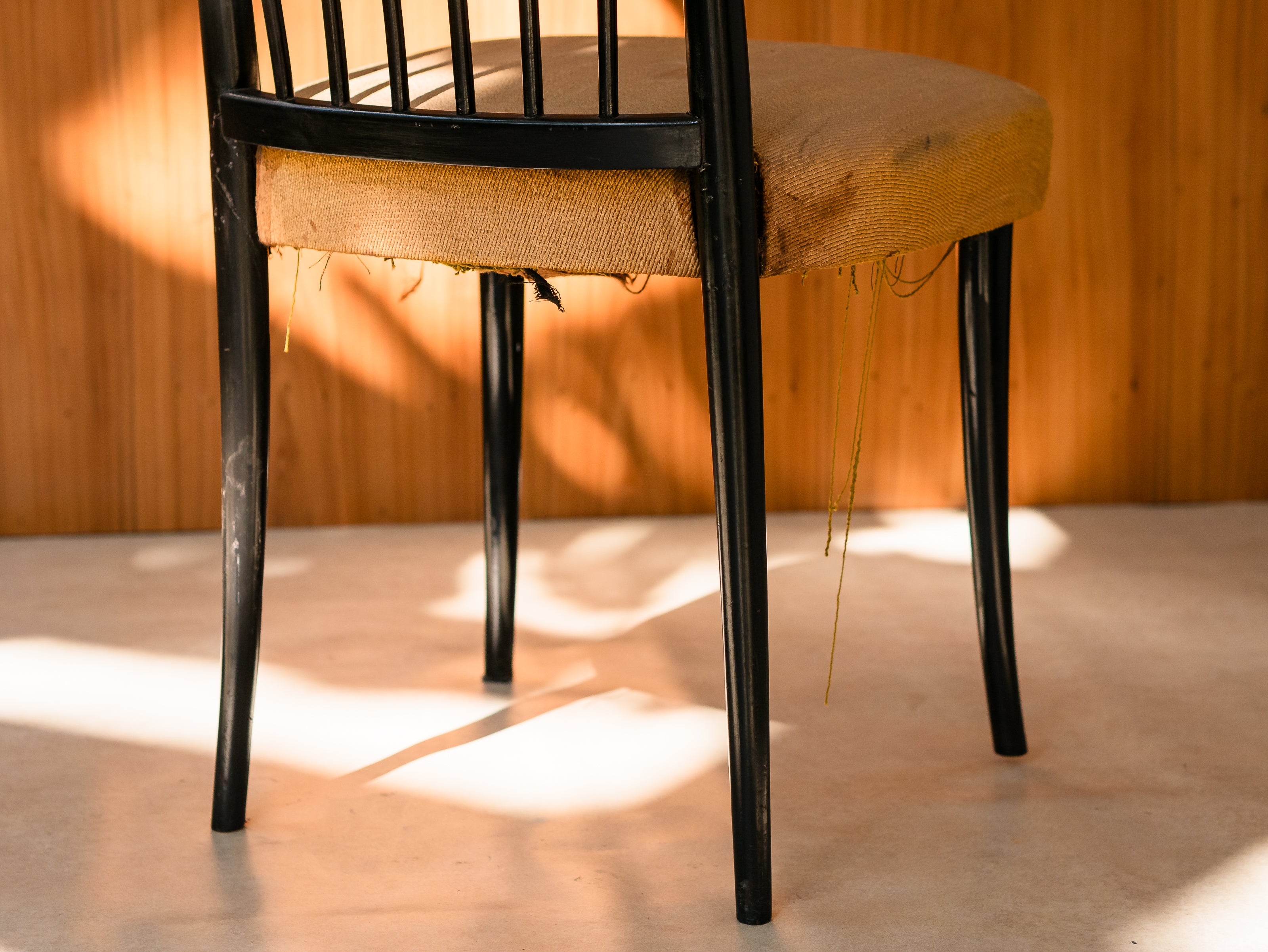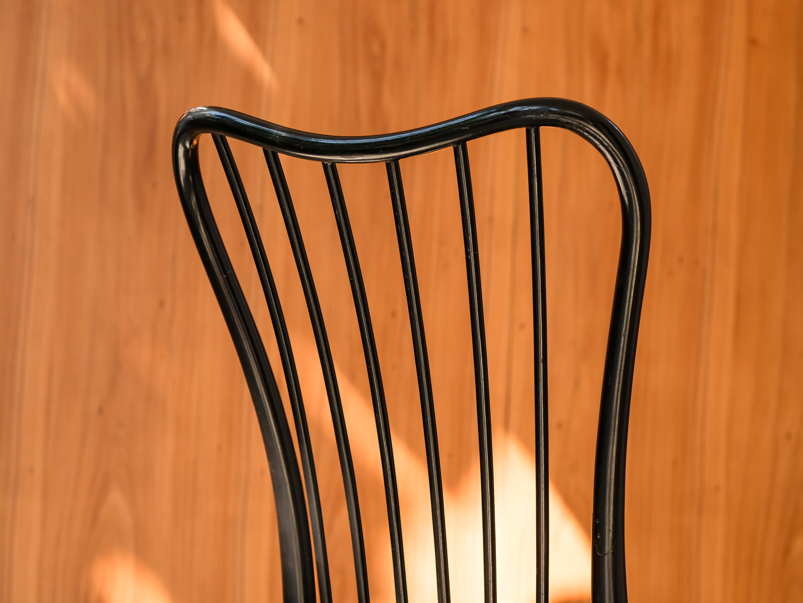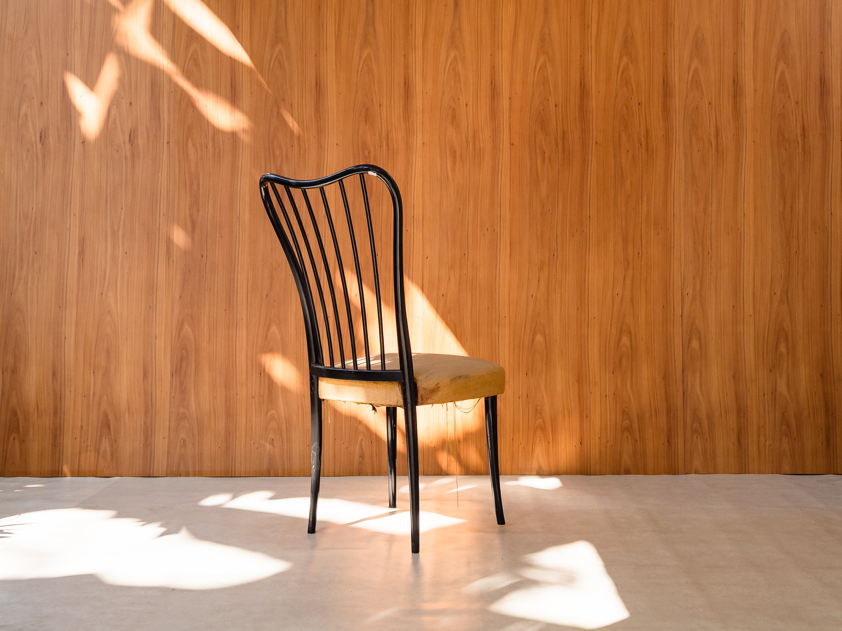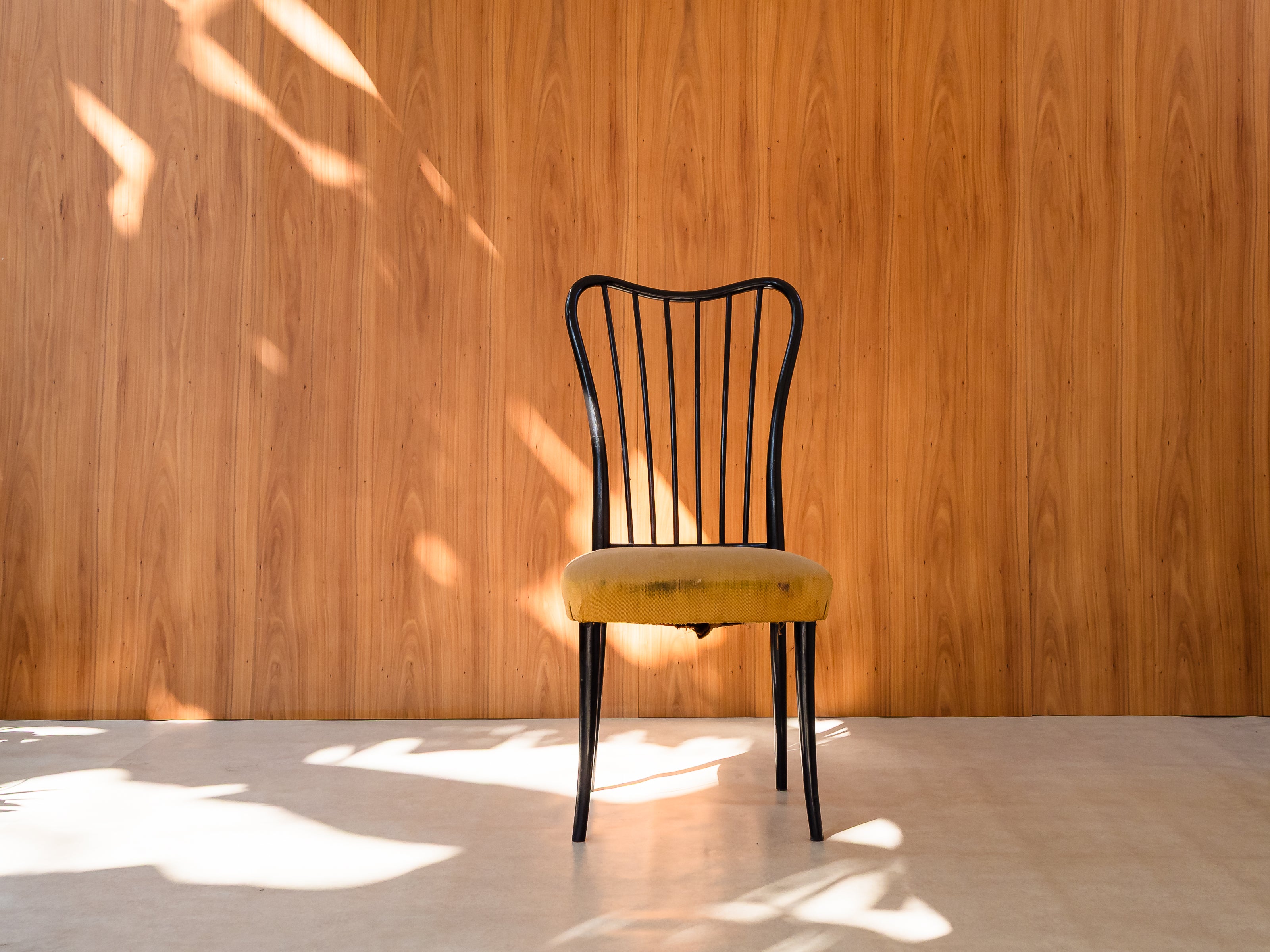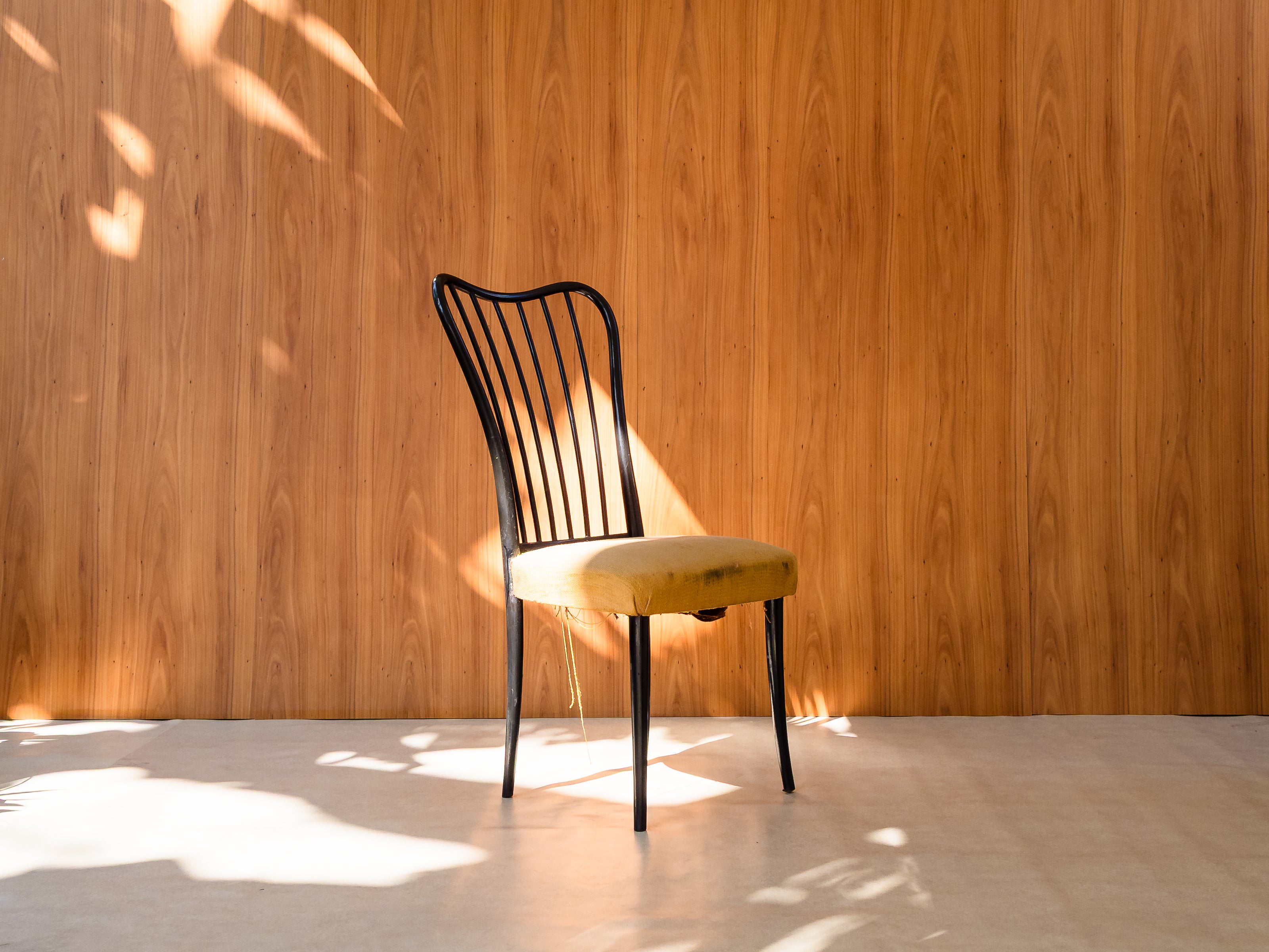 Cadeira produzida em madeira maciça com acabamento ebanizado, encosto ondulado composto por varetas verticais e assento estofado. Peça fotografada no estado atual, valor prevê restauro completo, com tecido fornecido pelo cliente.