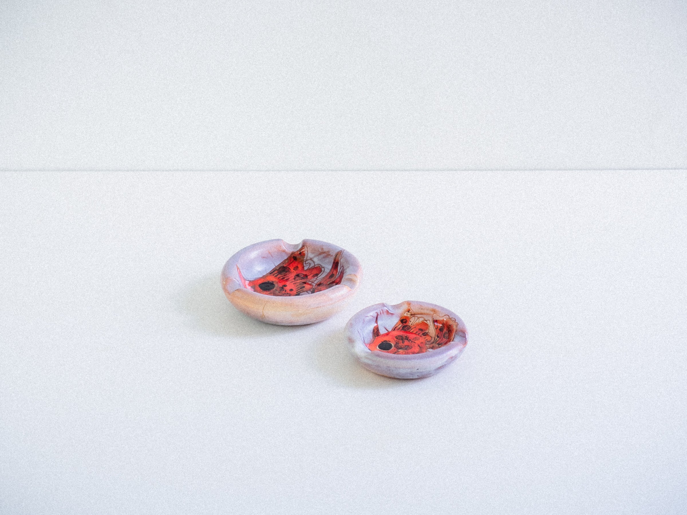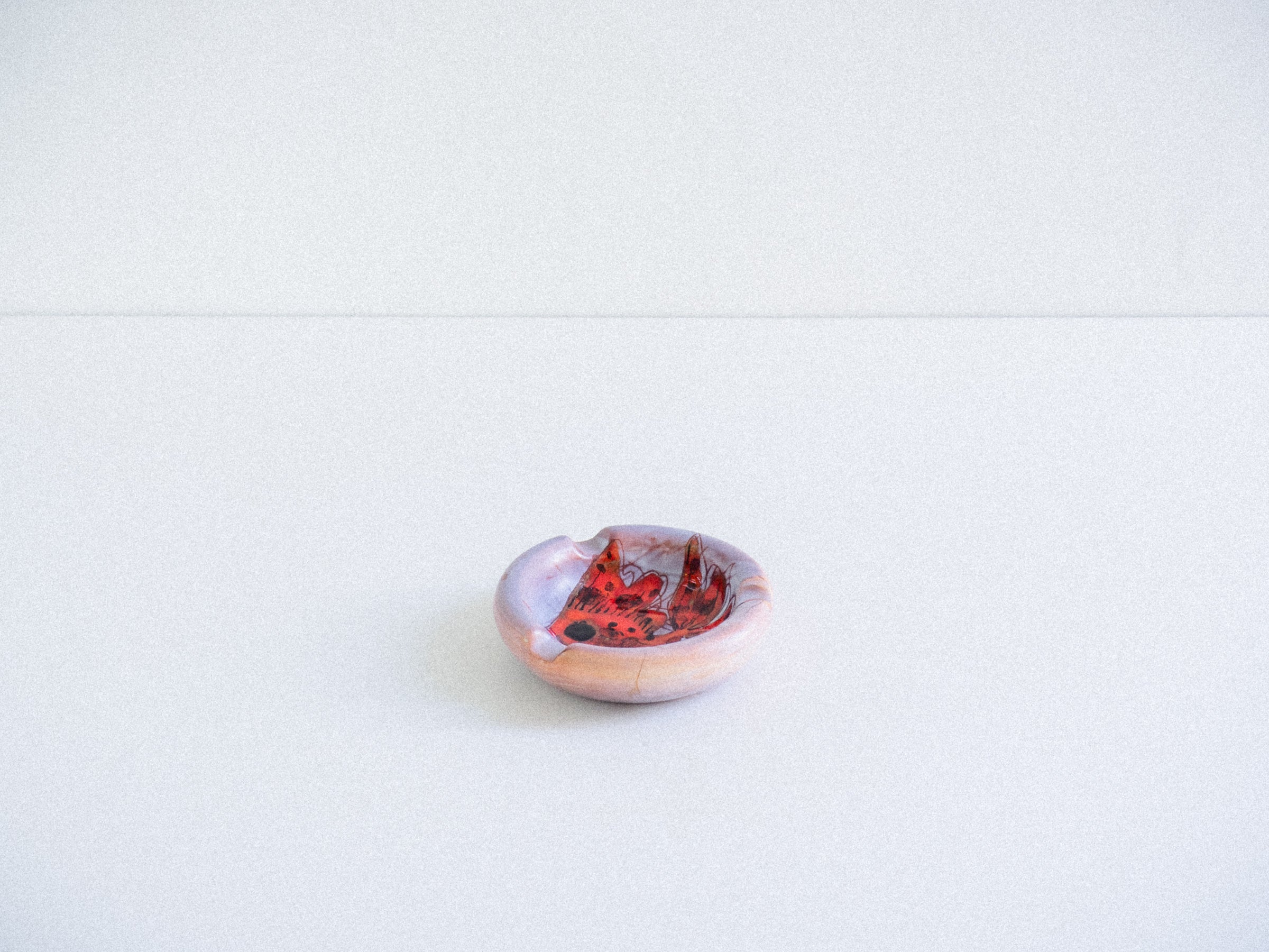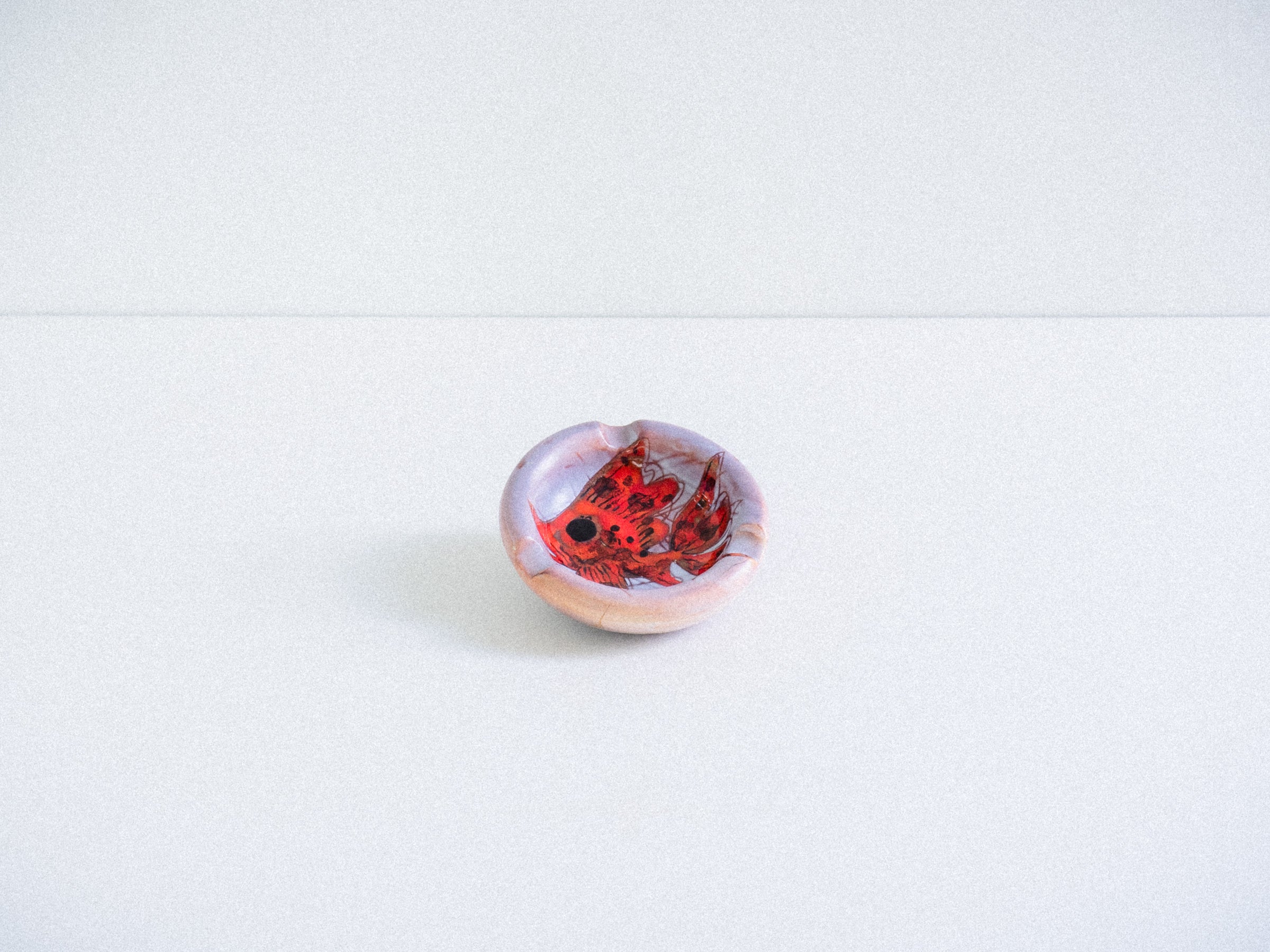 Cinzeiro de cerâmica produzido em Vallauris, cidade francesa reconhecida por sua tradição ceramista. A peça traz um desenho de peixe em tons de laranja e preto, pintado à mão. Peça com pequeno trincado, em ótimo estado de conservação, possui assinatura no fundo. Disponível á pronta entrega.