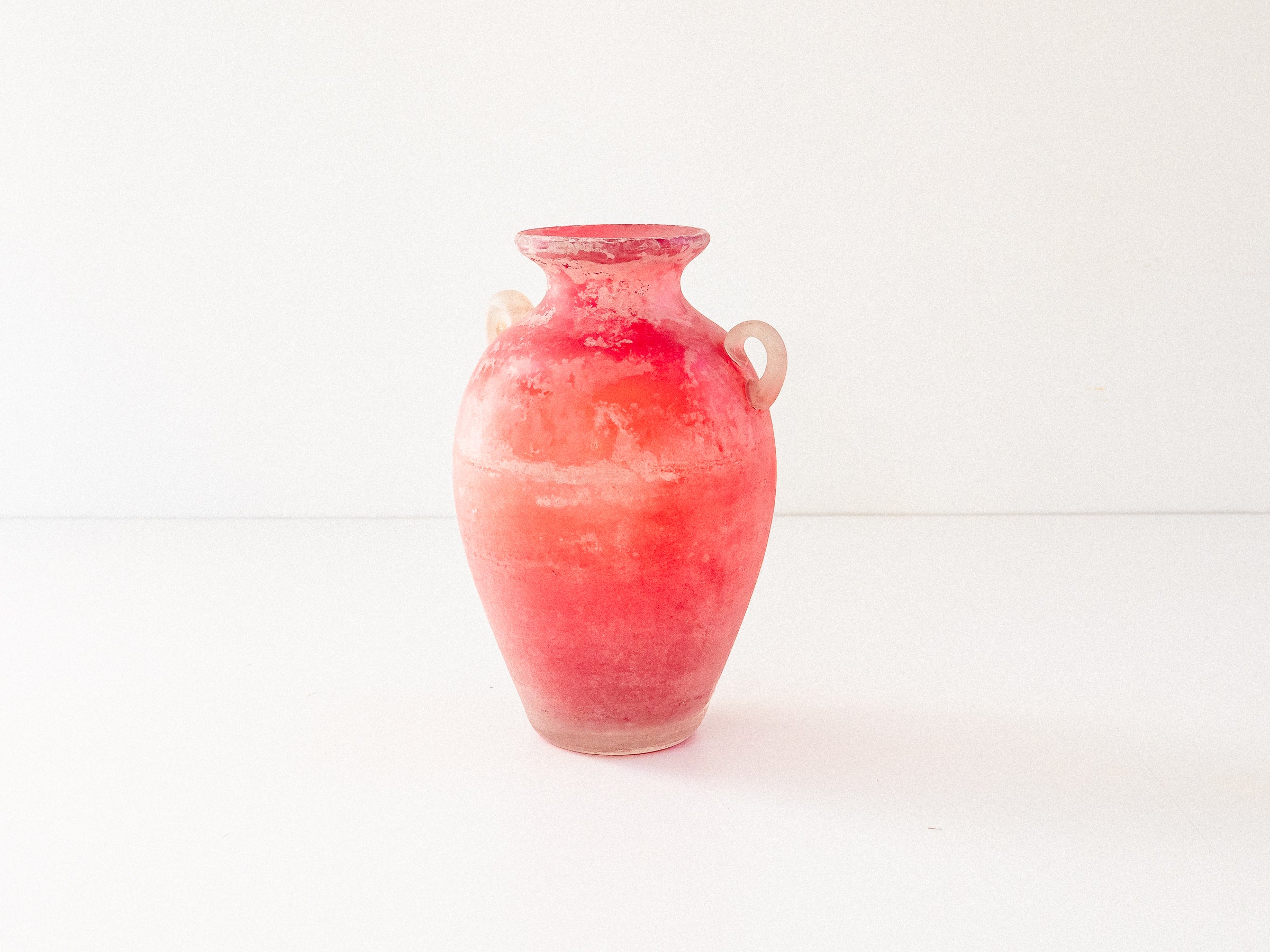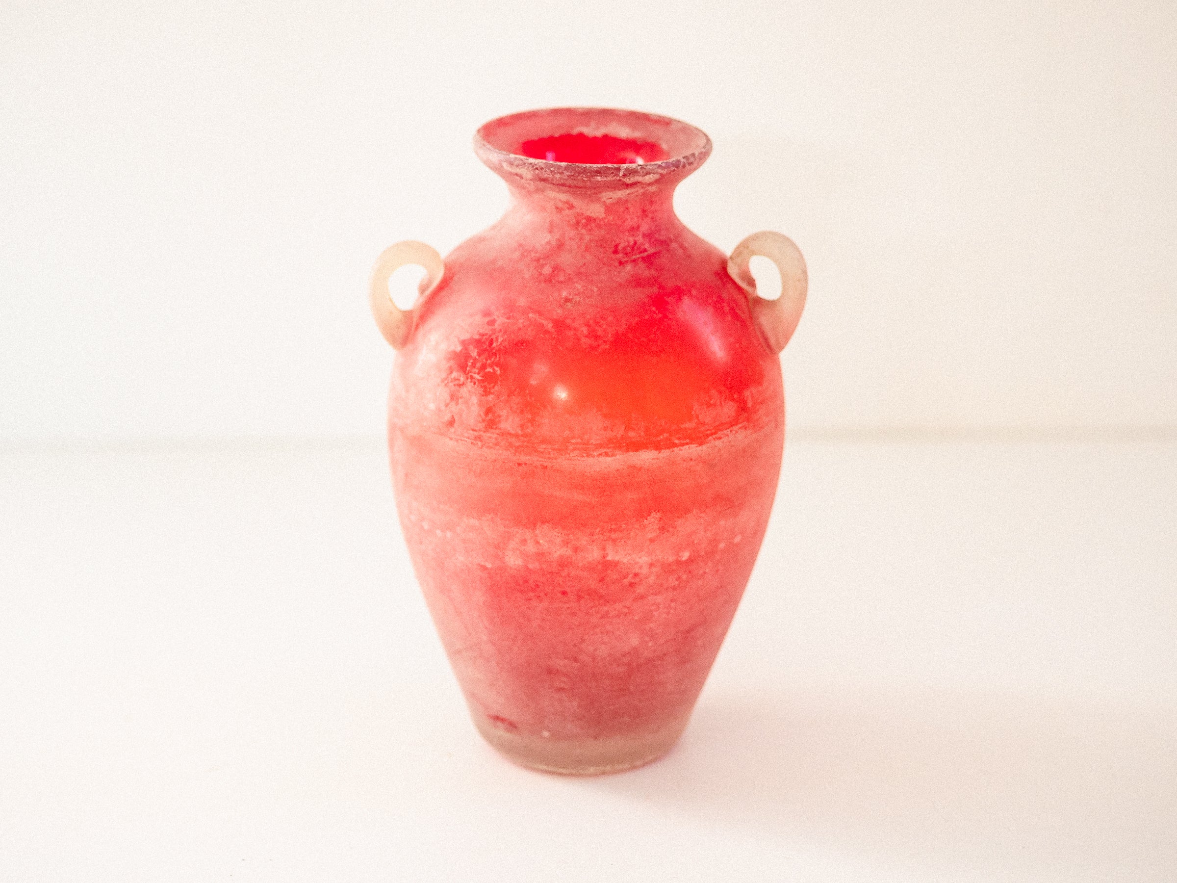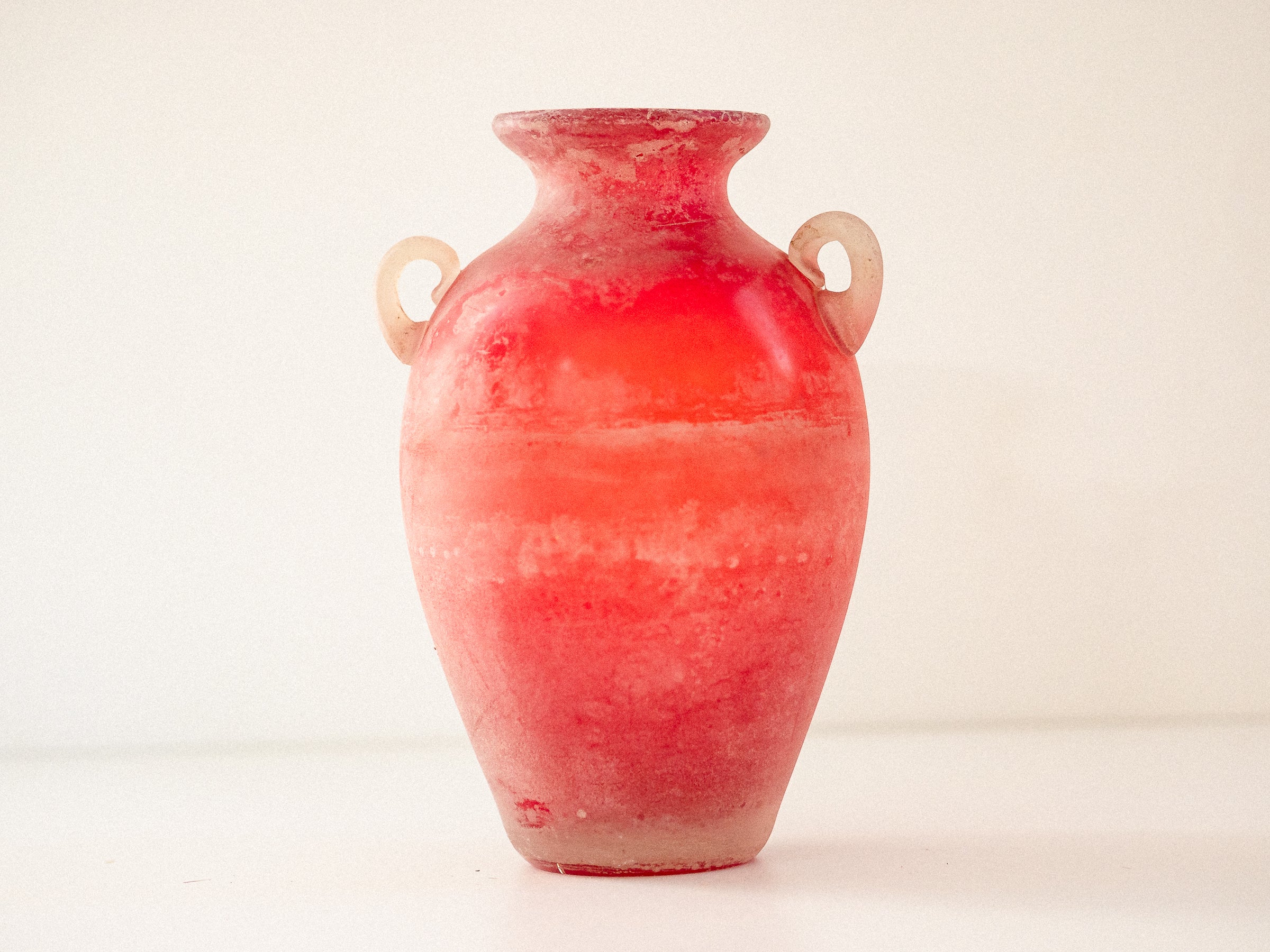 Ânfora em vidro soprado, Murano, década de 1960–70. Executada com a técnica Scavo, que confere à superfície um aspecto fosco e esbranquiçado, semelhante a um achado arqueológico. Corpo em tons de vermelho e laranja, com duas alças aplicadas em vidro translúcido. Base plana e polida.