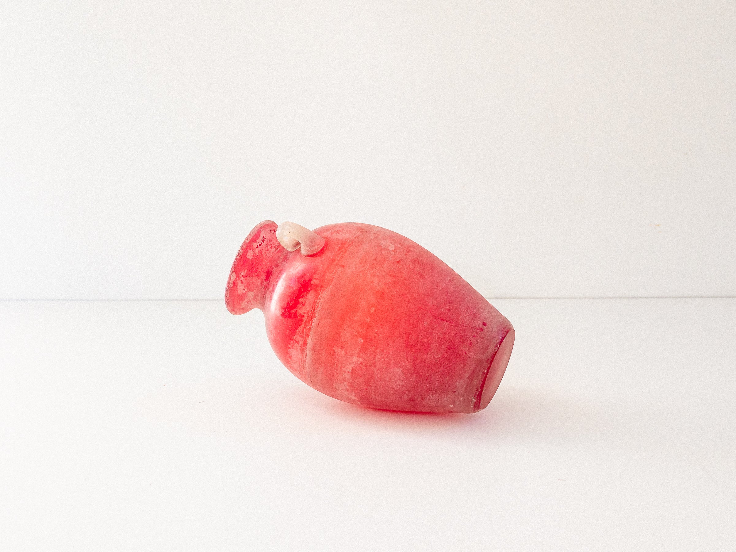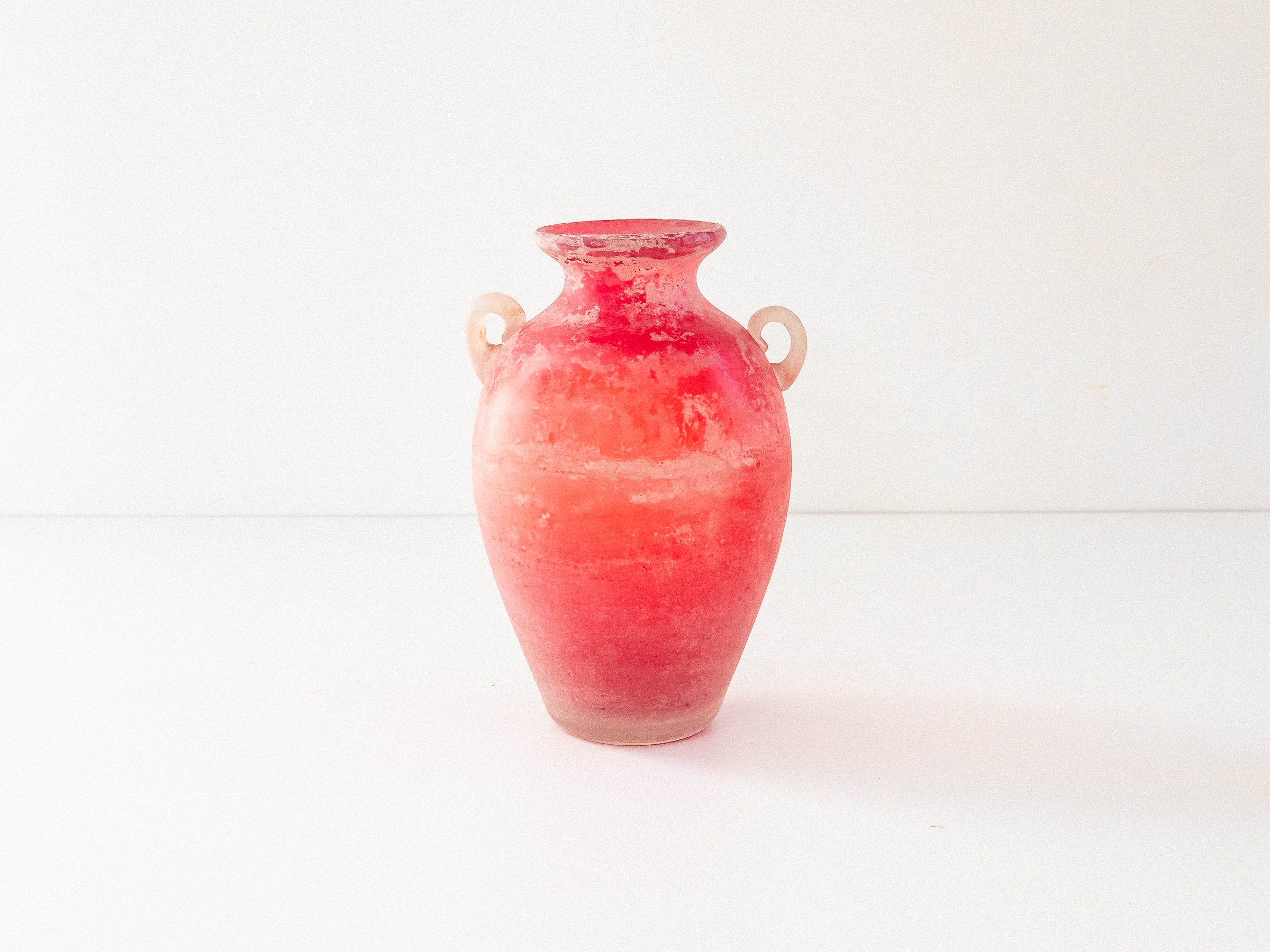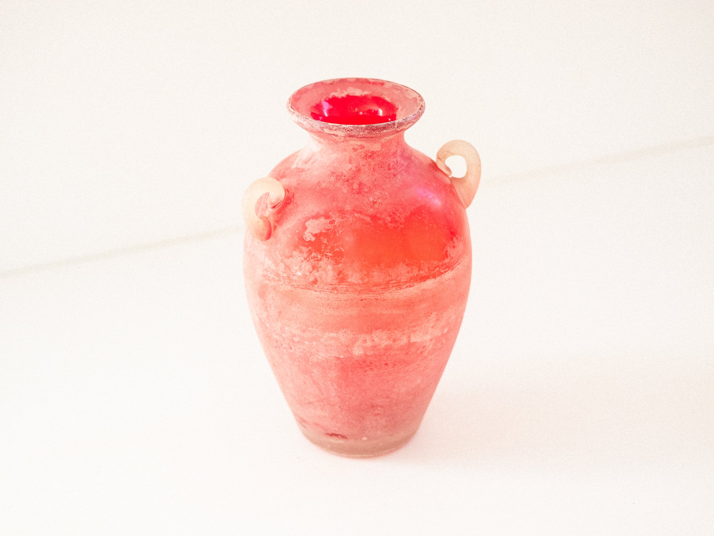 Ânfora em vidro soprado, Murano, década de 1960–70. Executada com a técnica Scavo, que confere à superfície um aspecto fosco e esbranquiçado, semelhante a um achado arqueológico. Corpo em tons de vermelho e laranja, com duas alças aplicadas em vidro translúcido. Base plana e polida.