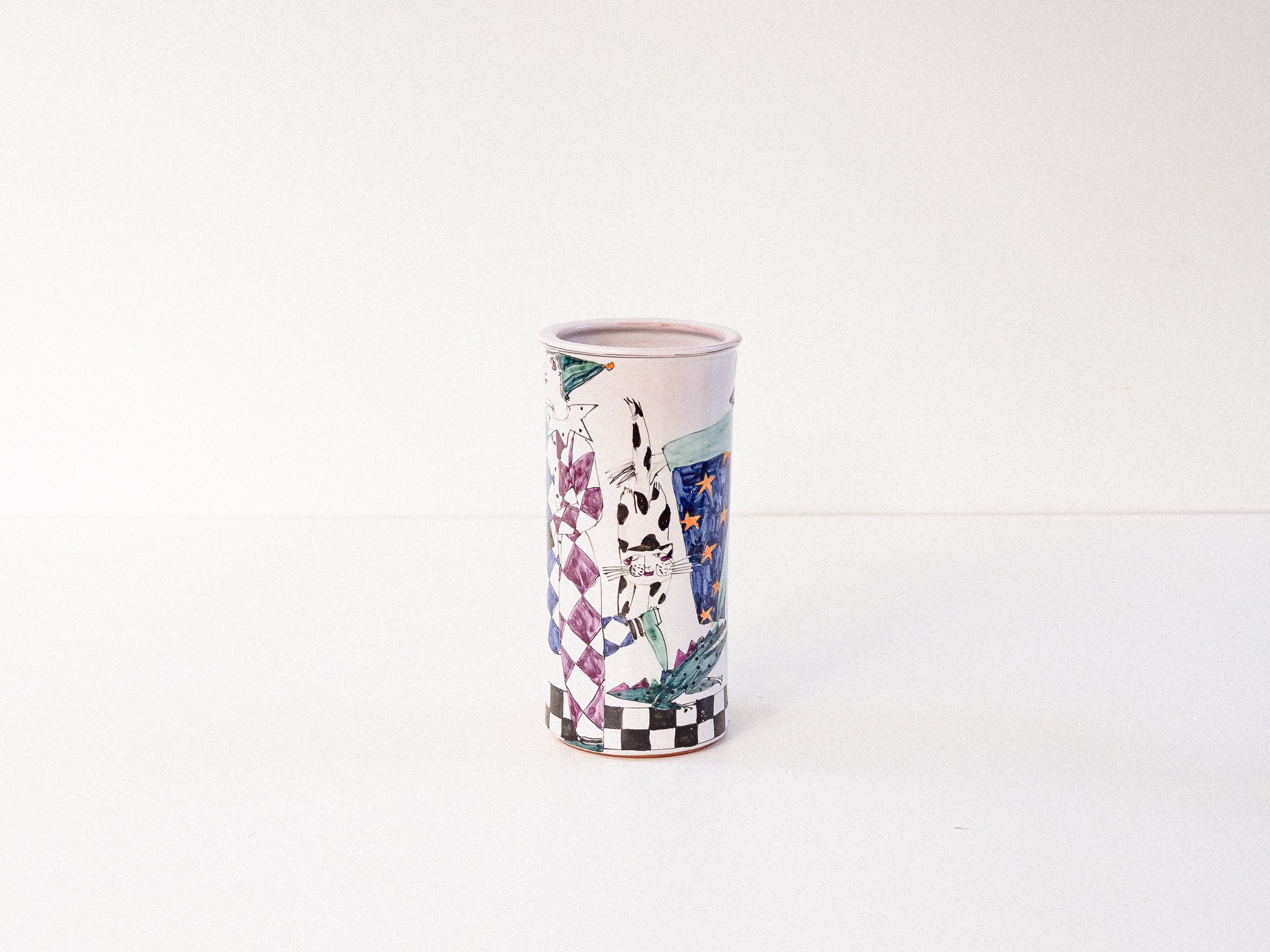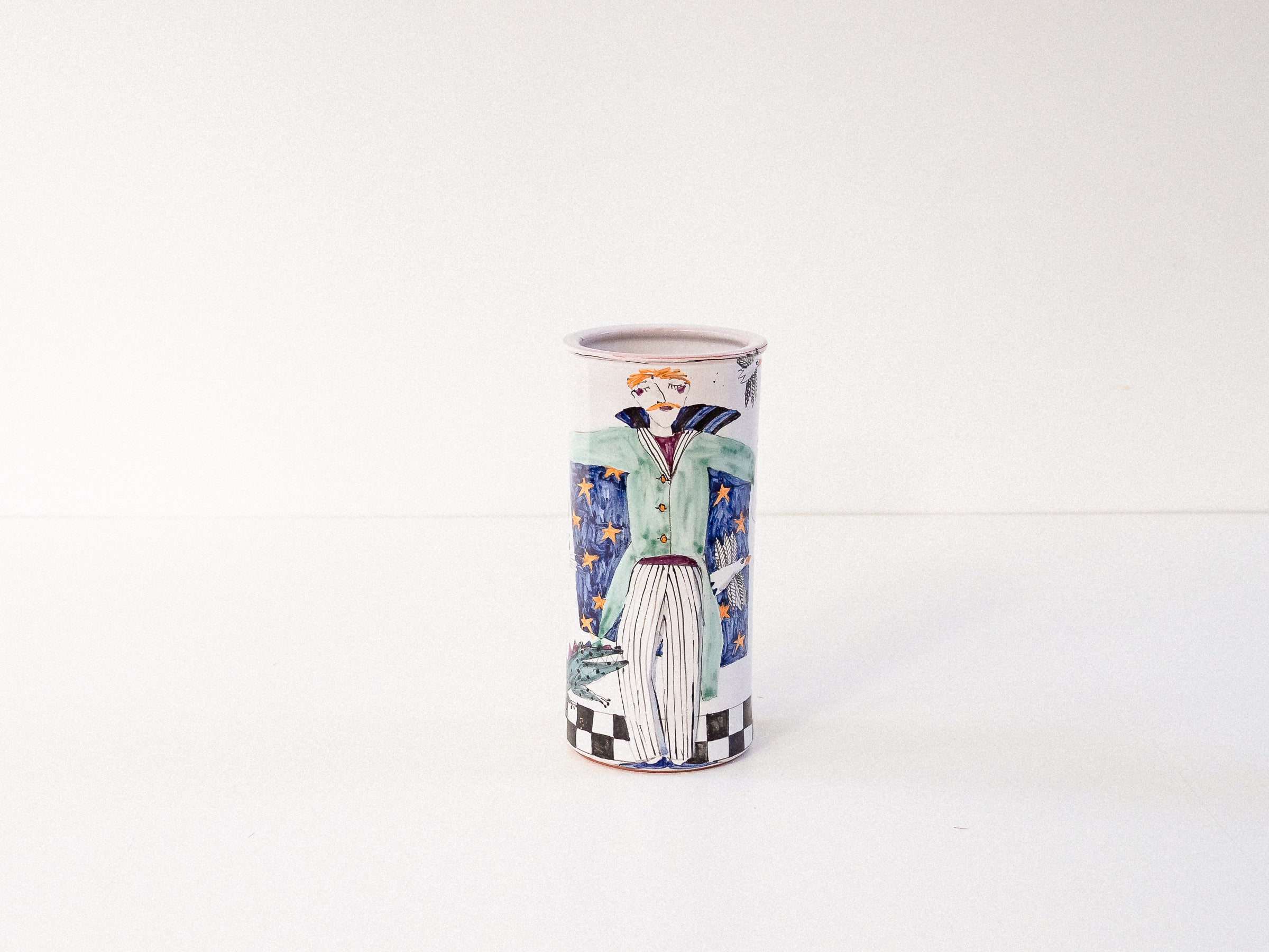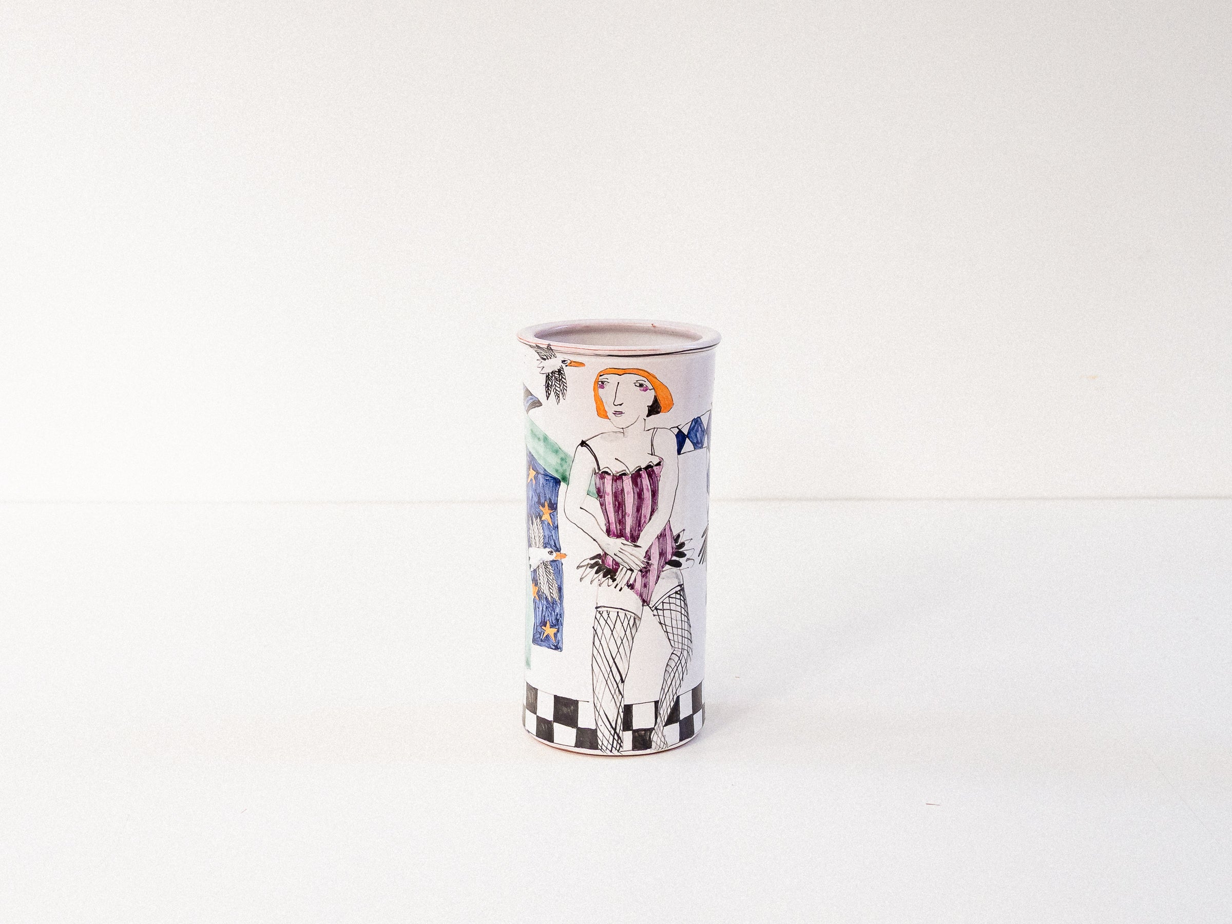 Vaso em porcelana com ilustração da artista Kathrin Grünke, produção Narrenkeramik nos anos 90. Peça moldada e pintada manualmente, trazendo marcação na base, em ótimo estado. Acompanha impressos com histórico do estúdio e da artista. Disponível à pronta-entrega.