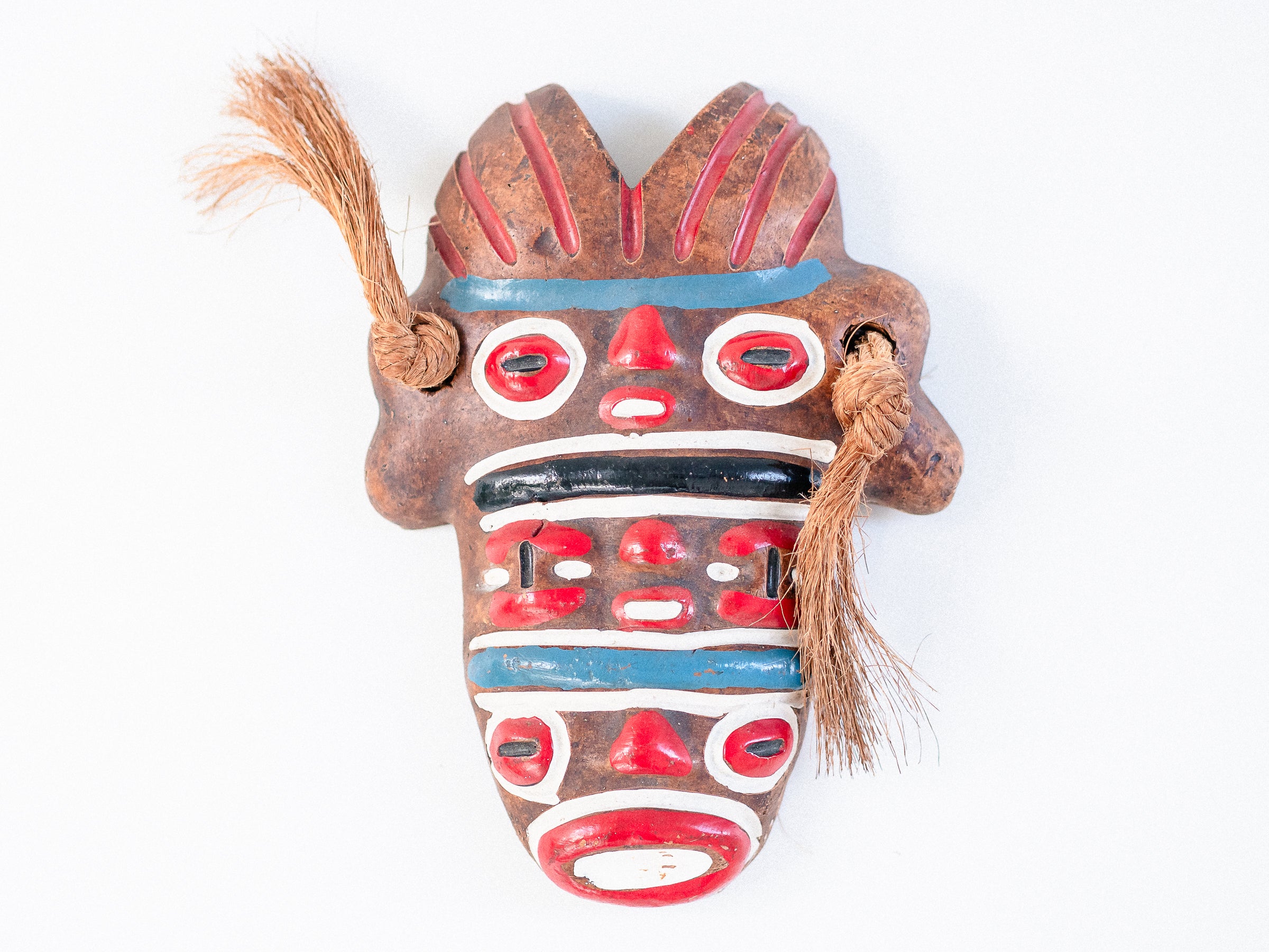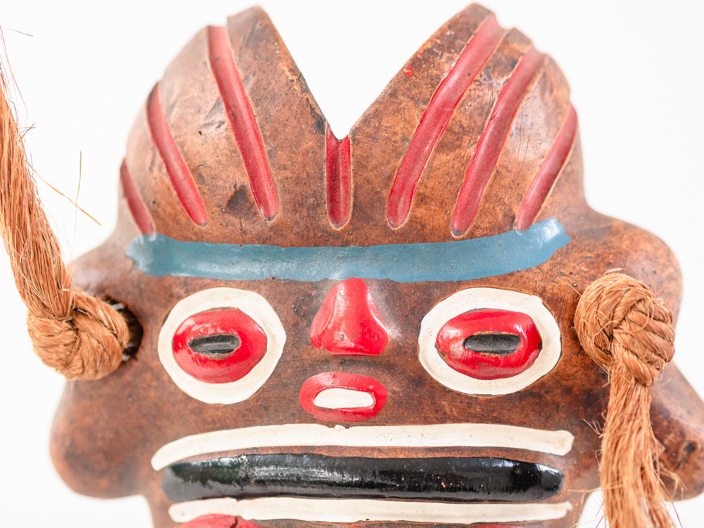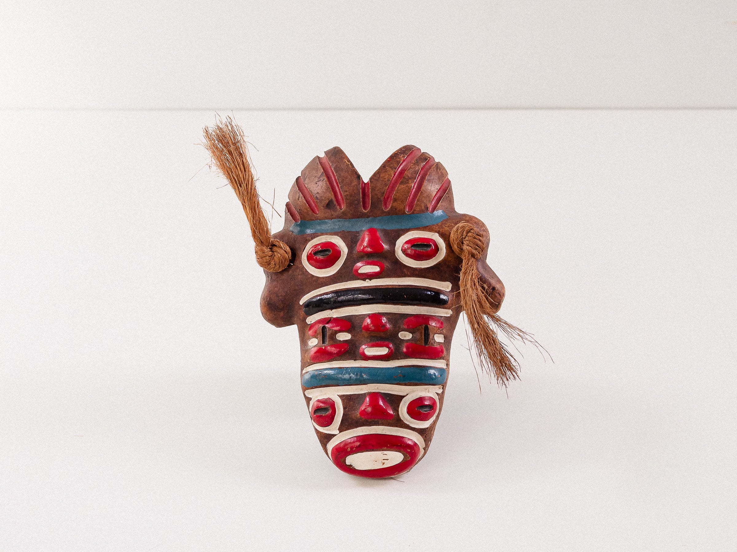 Máscara marajoara em cerâmica policromada, com acabamento em sisal, permitindo sua fixação na parede. Peça assinada "OLGA", trazendo a origem "ICOARACI - PARÁ".