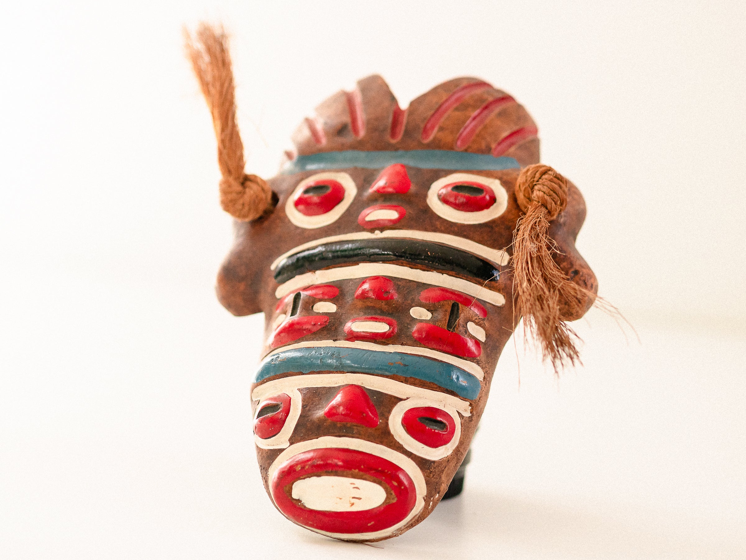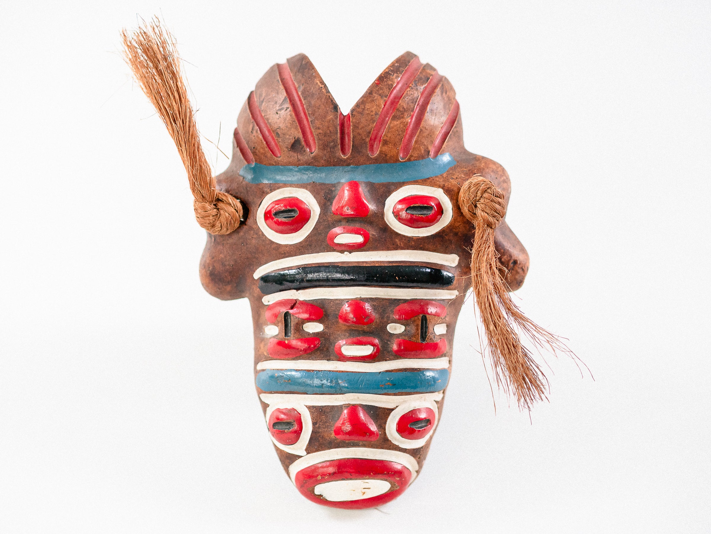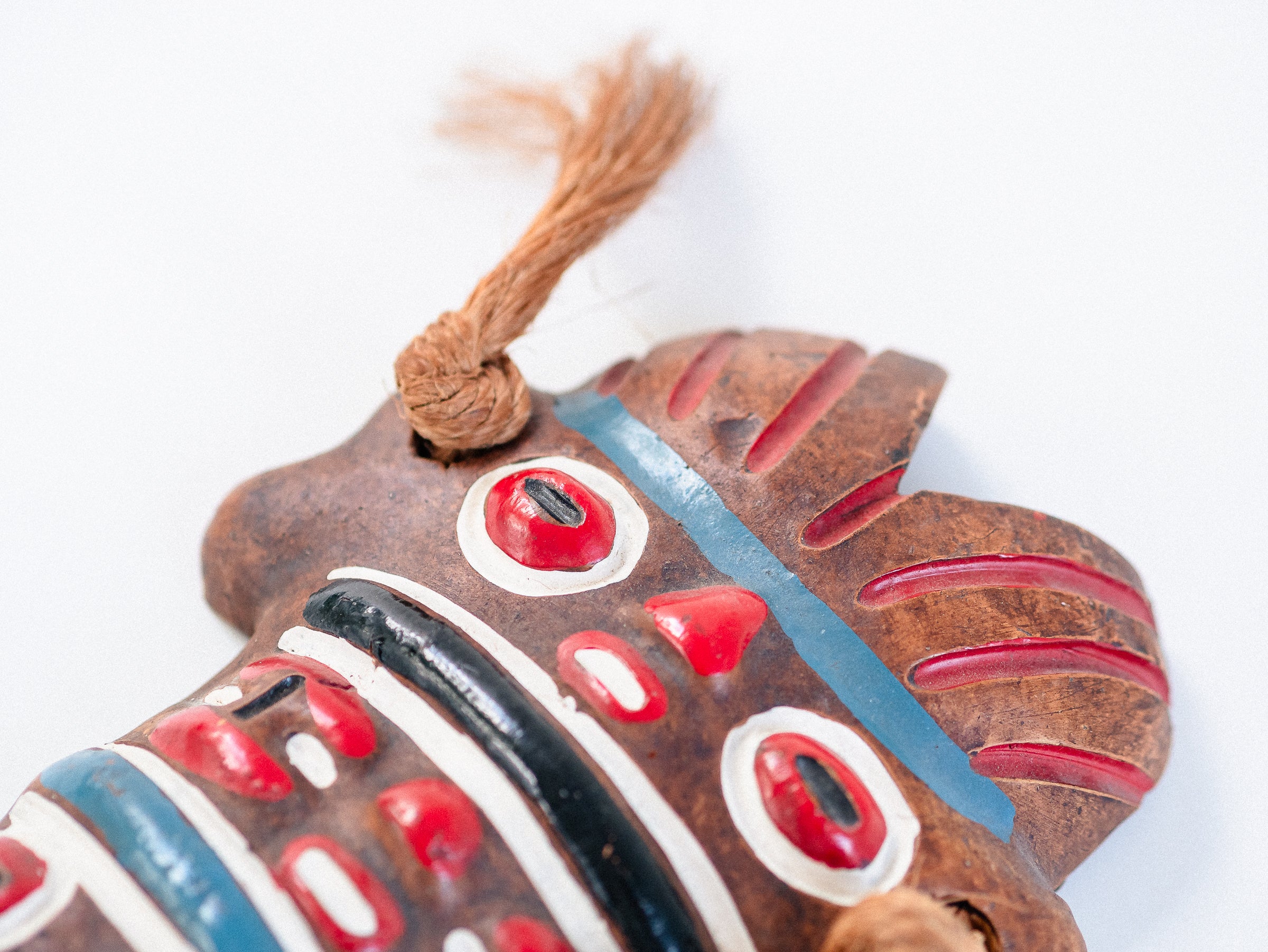 Máscara marajoara em cerâmica policromada, com acabamento em sisal, permitindo sua fixação na parede. Peça assinada "OLGA", trazendo a origem "ICOARACI - PARÁ".