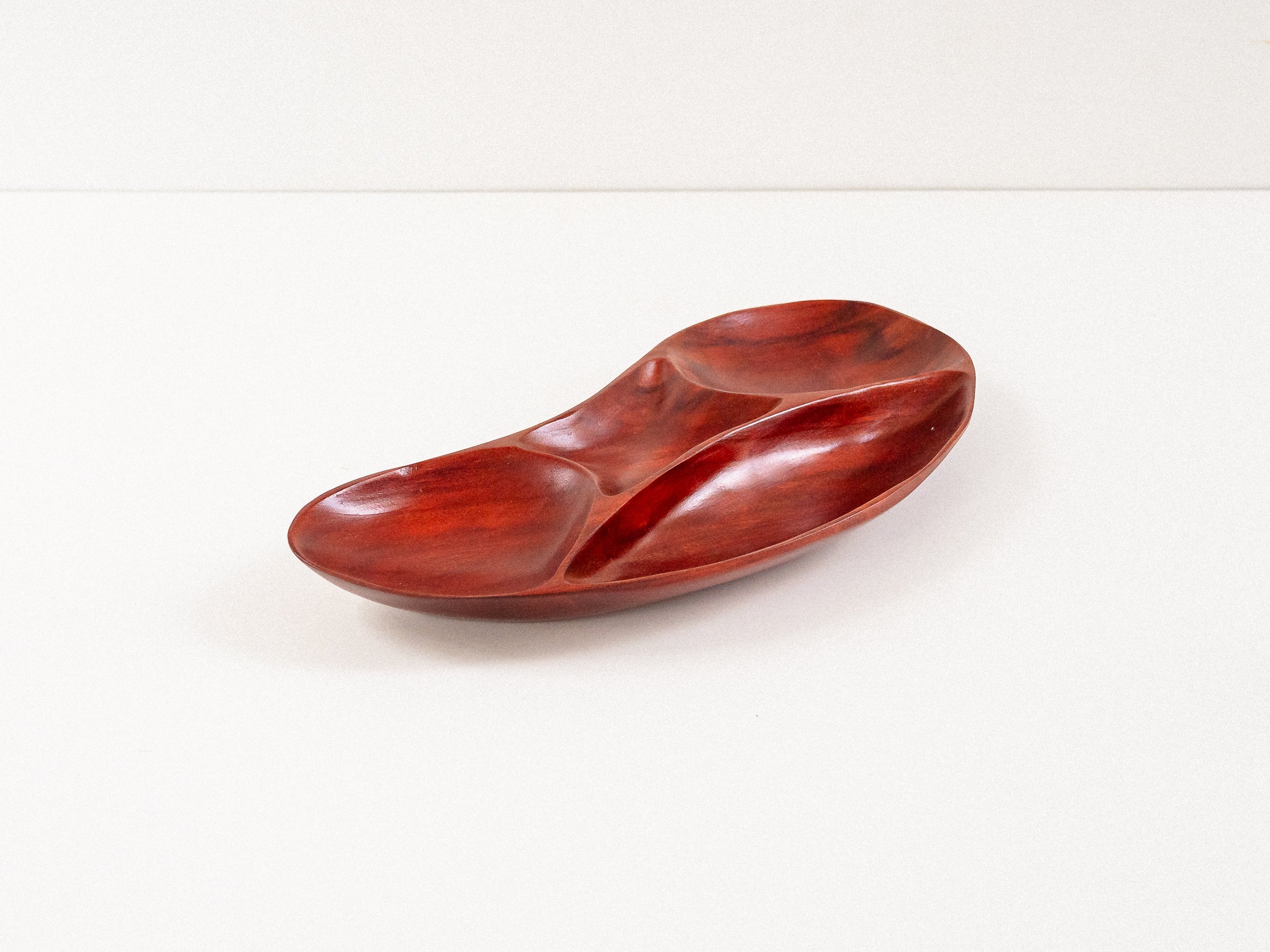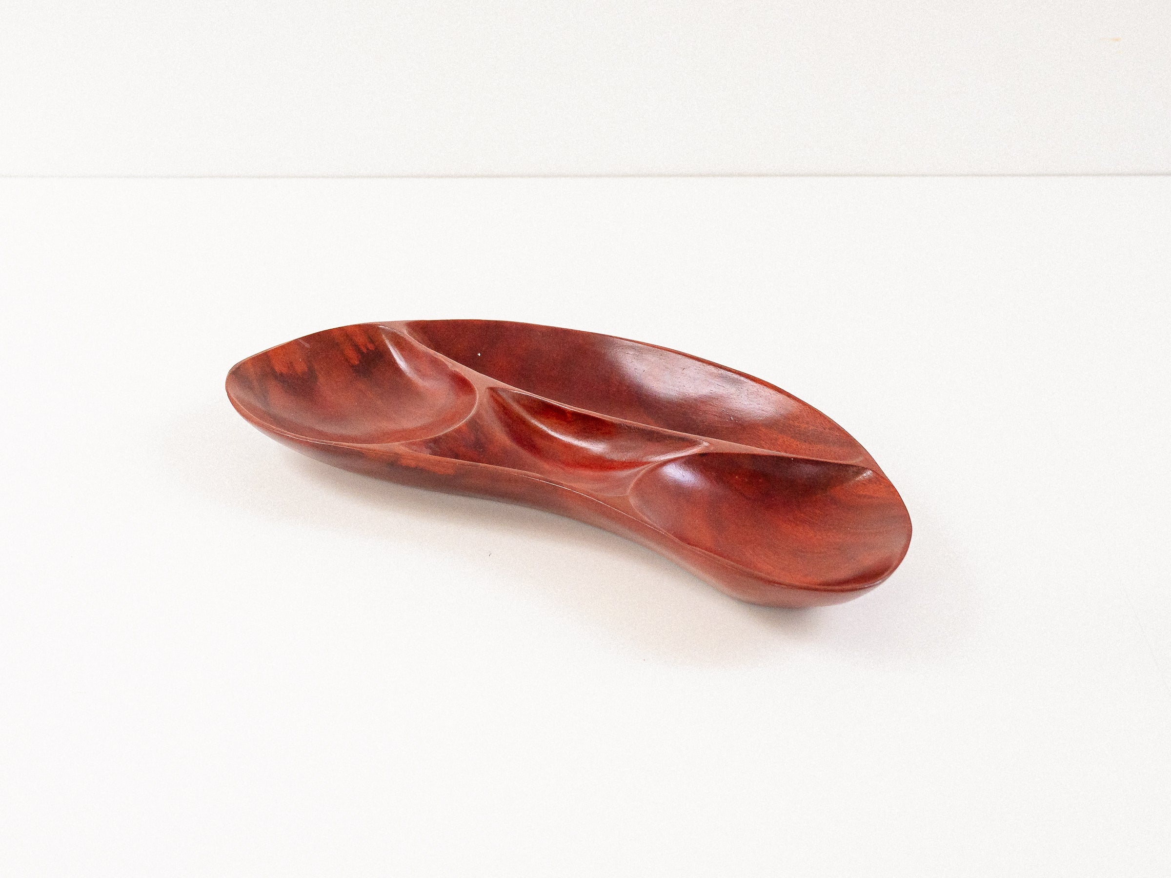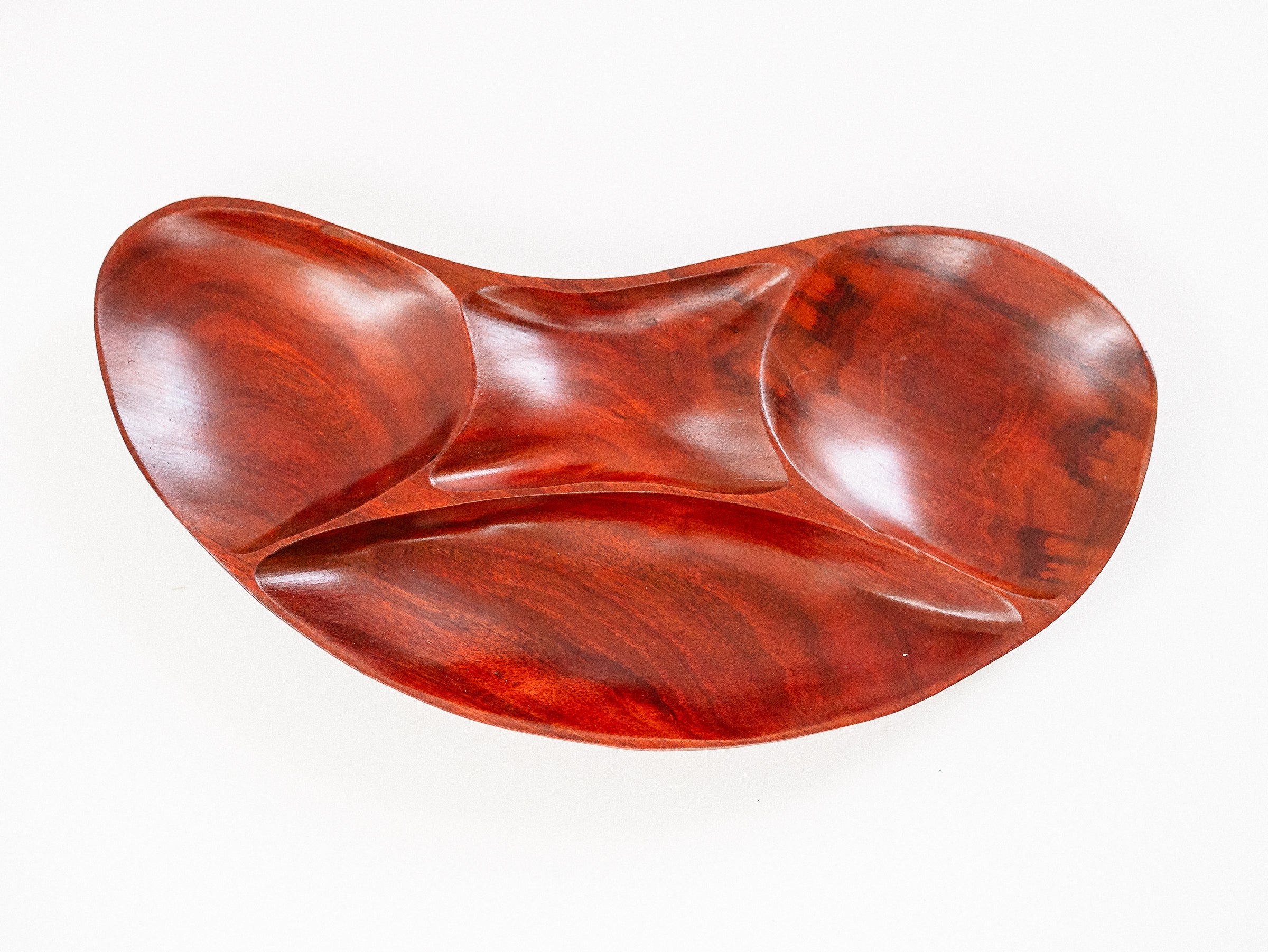 Petisqueira em formato orgânico esculpida em madeira, com quatro divisões internas. Peça totalmente restaurada.