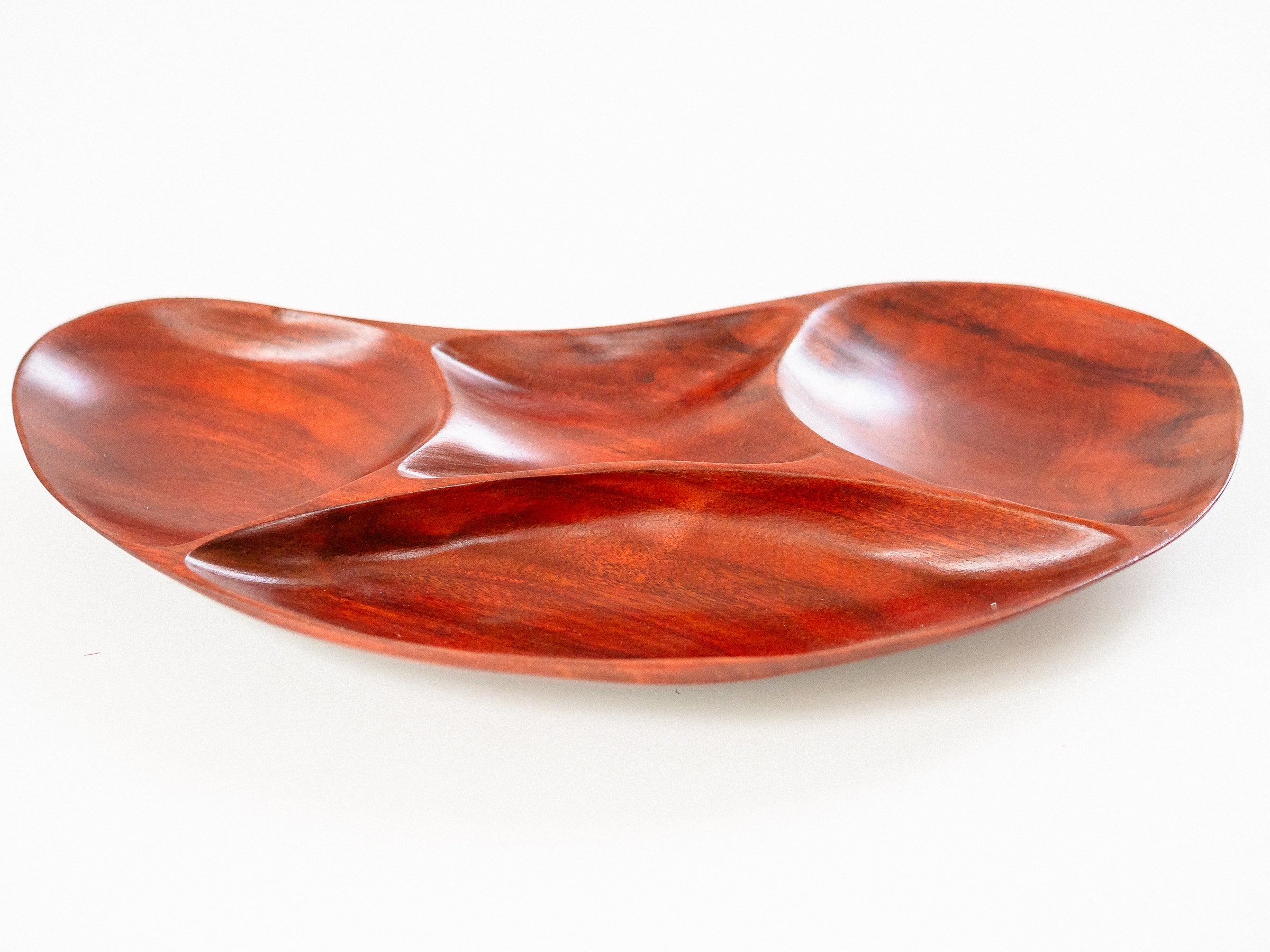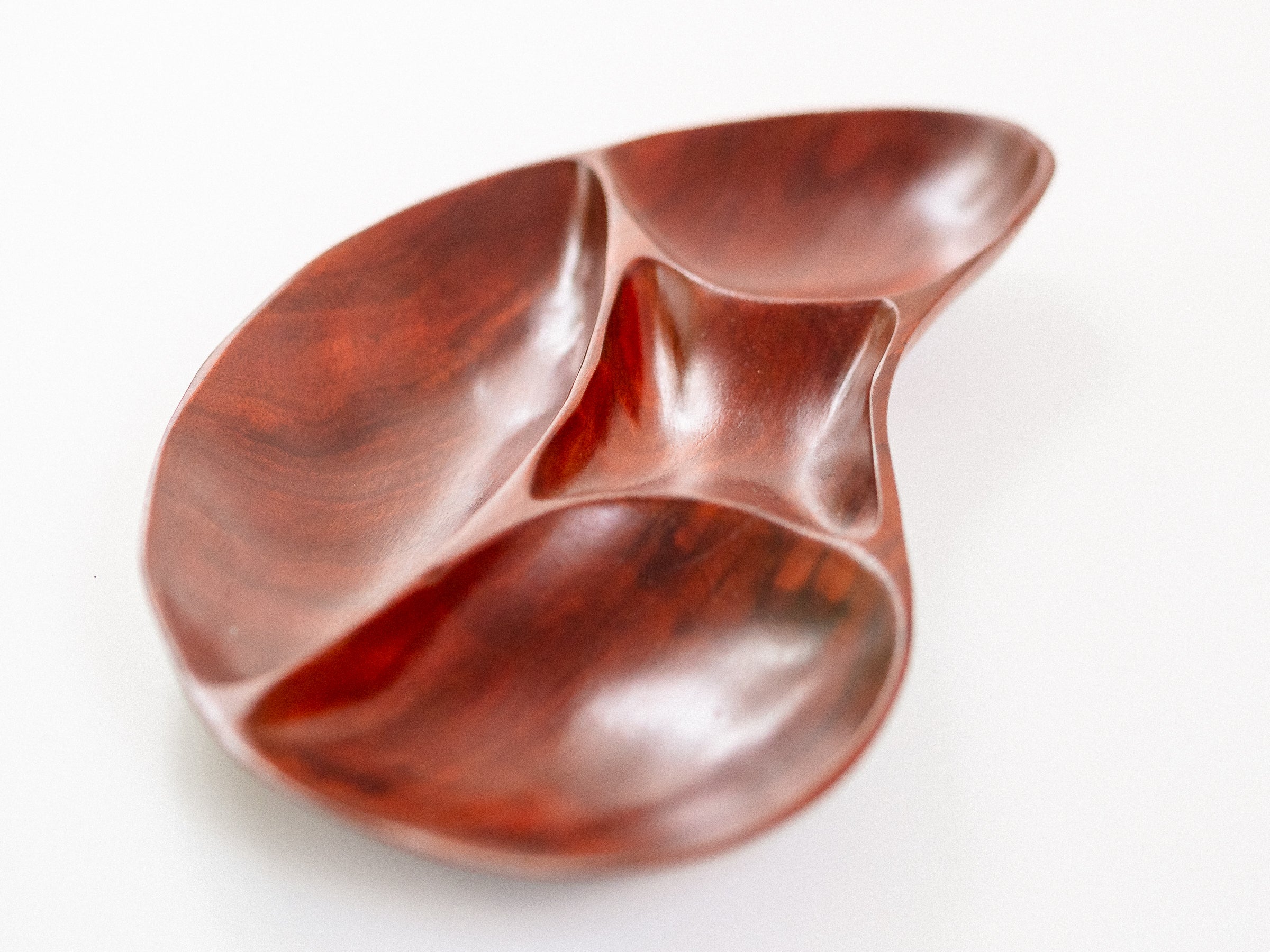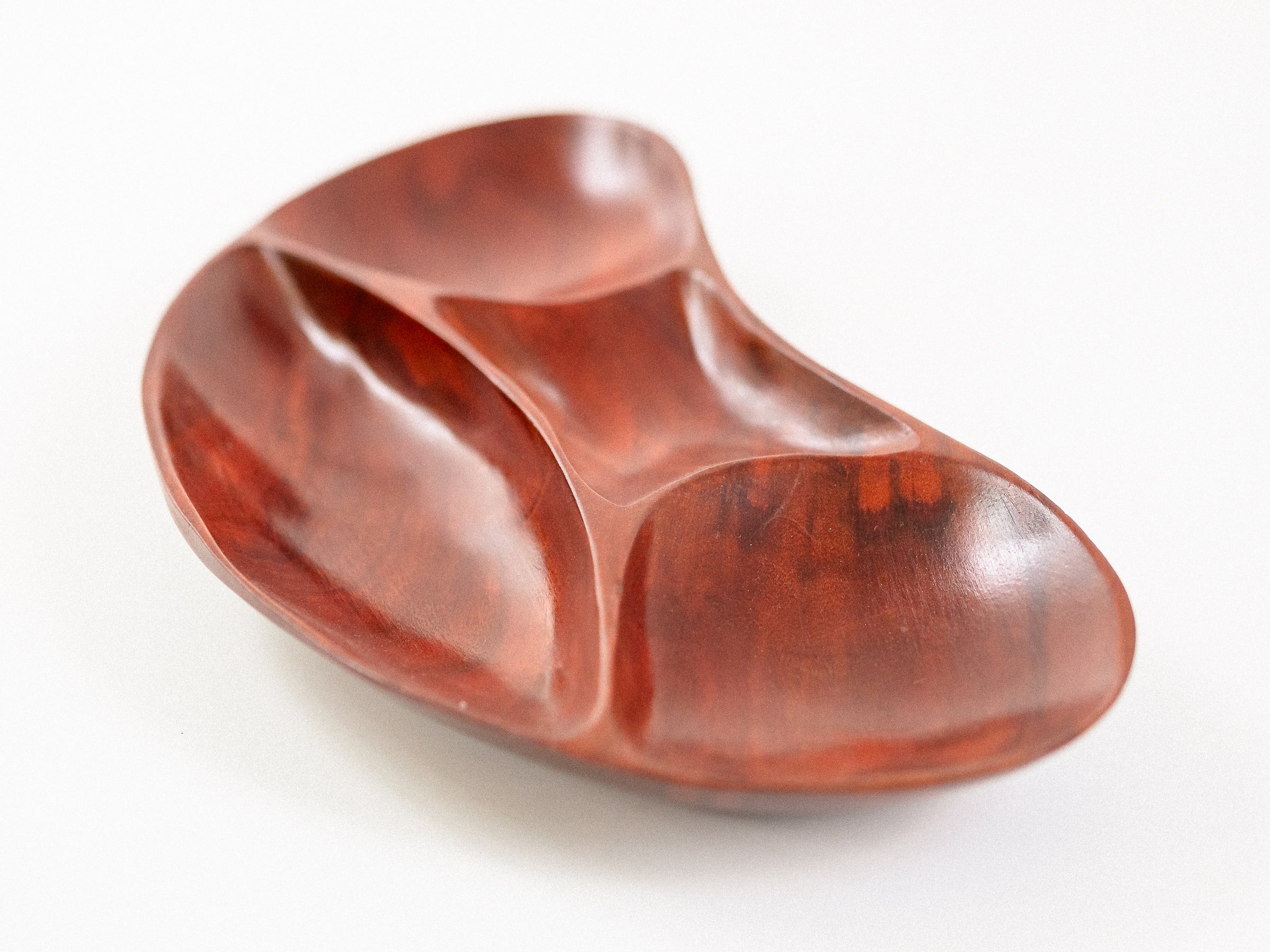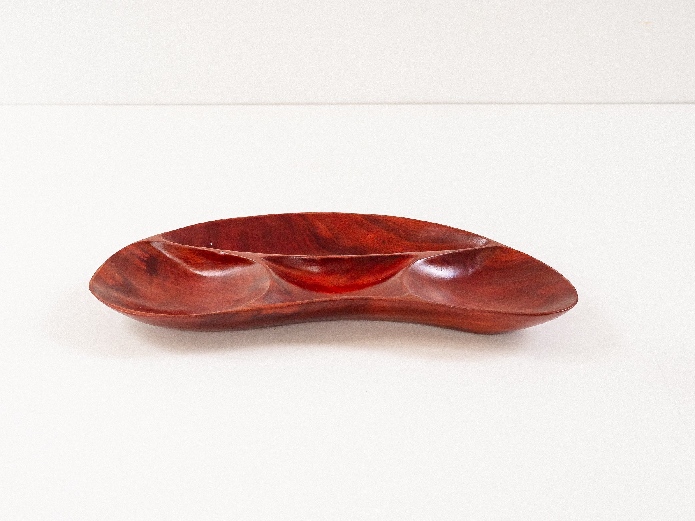Petisqueira em formato orgânico esculpida em madeira, com quatro divisões internas. Peça totalmente restaurada.