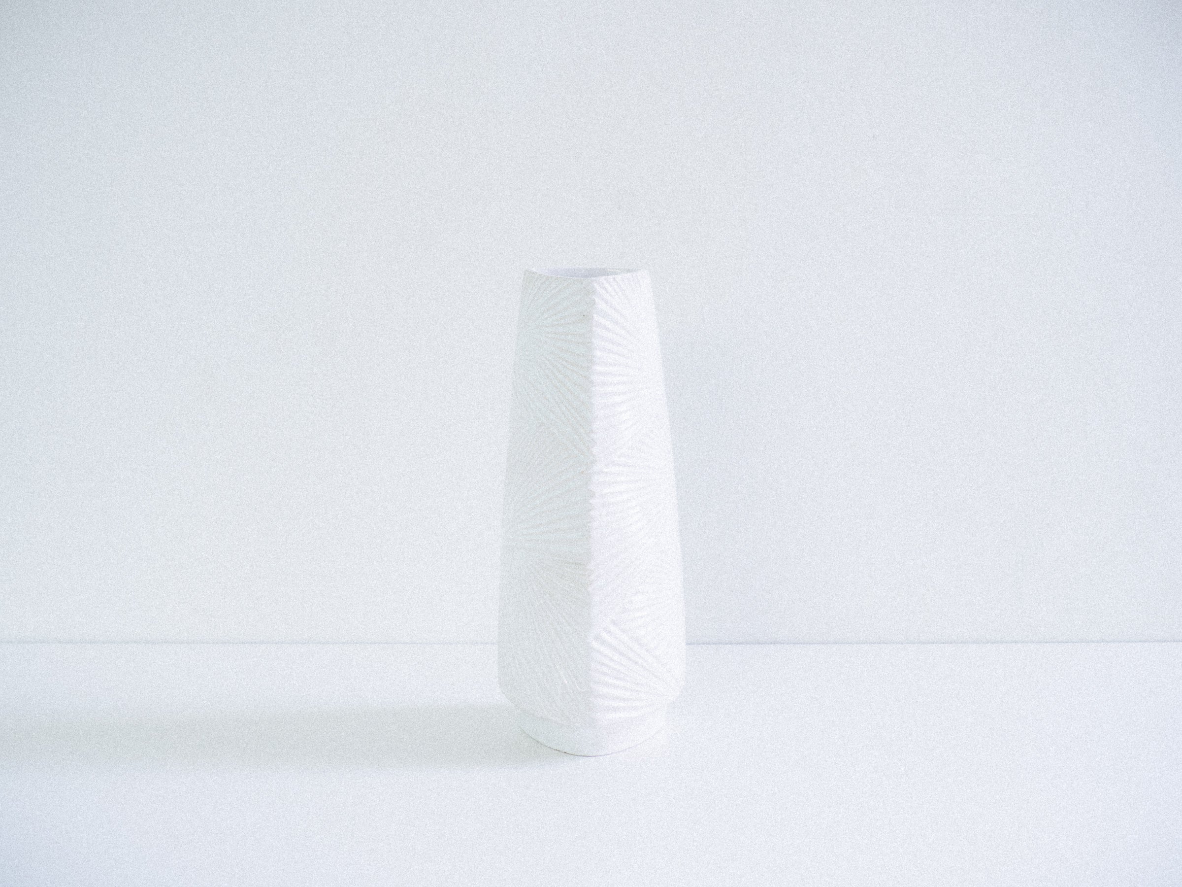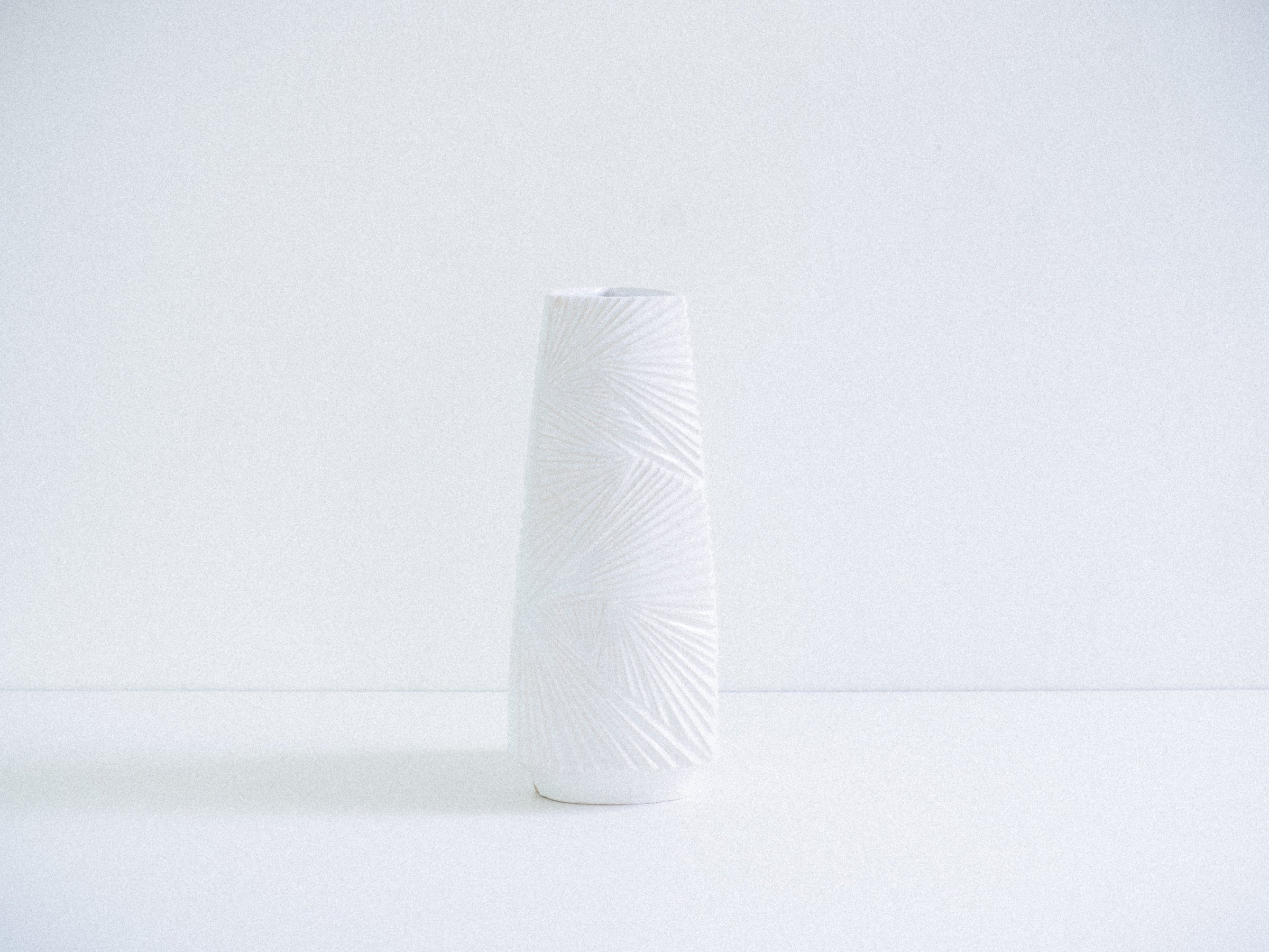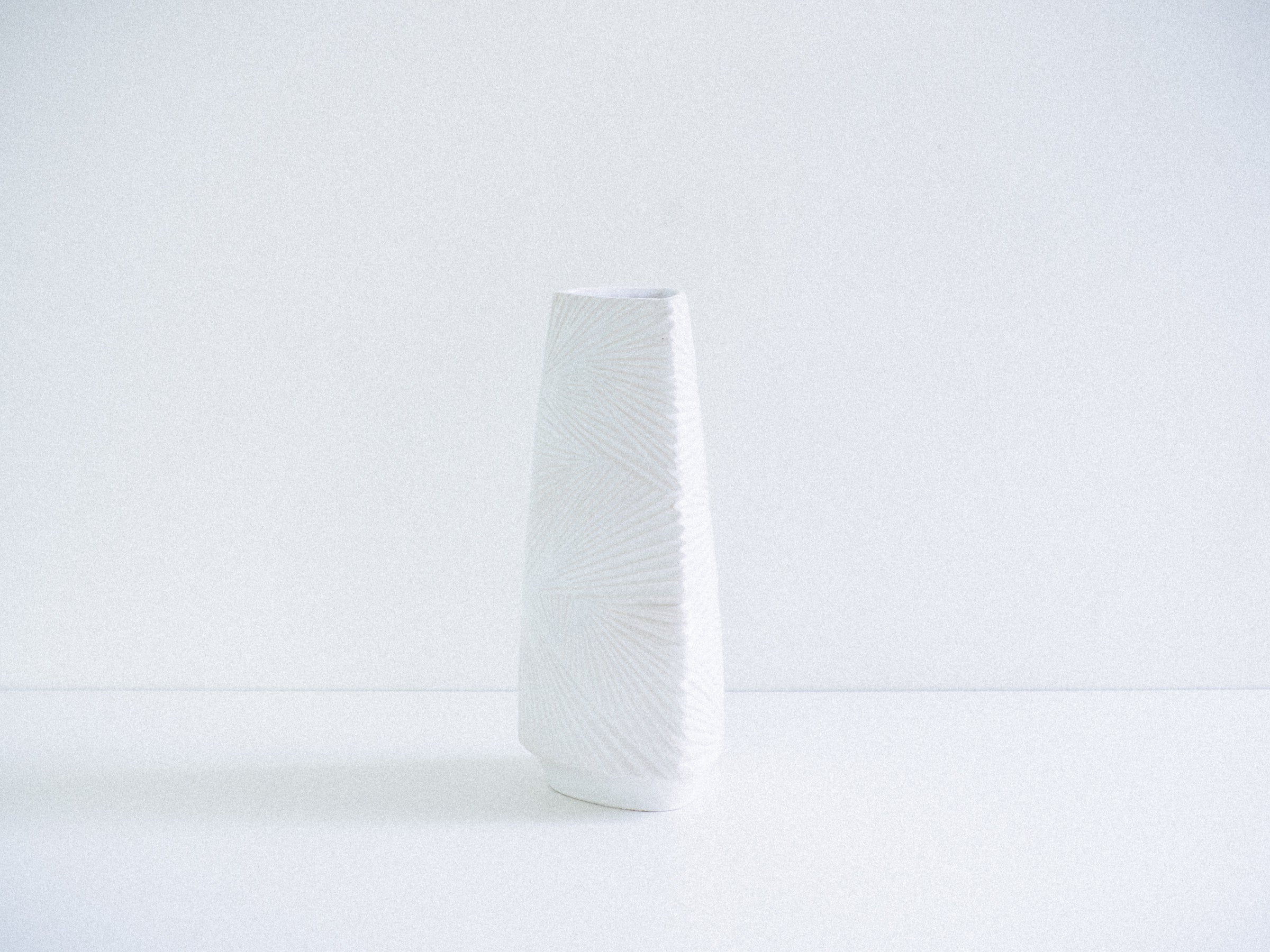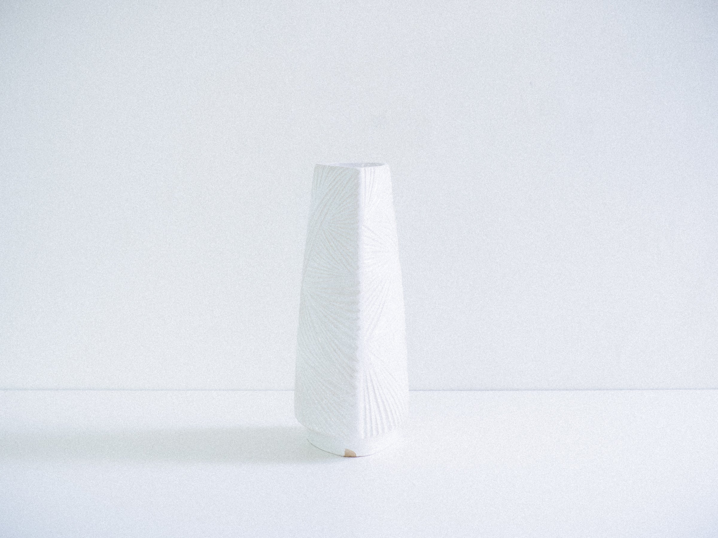 Vaso de cerâmica em formato alongado, produzida por Ü Keramik, a superfície possui textura em relevo com linhas diagonais que criam um padrão geométrico. O acabamento é esmaltado em tom claro.  A peça tem um pequeno bicado na base. disponível a pronta entrega.