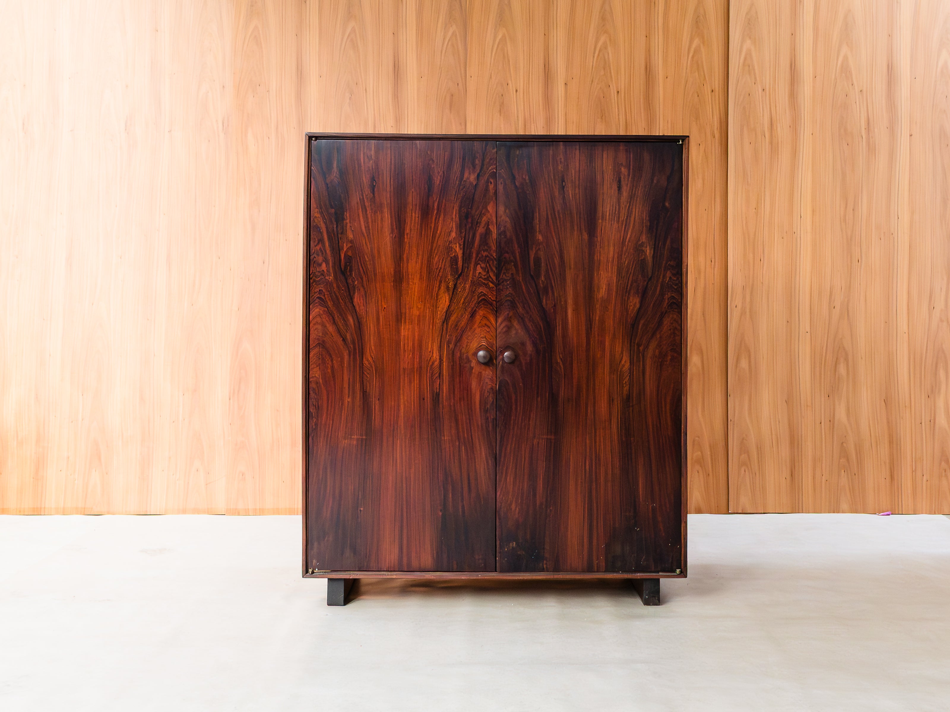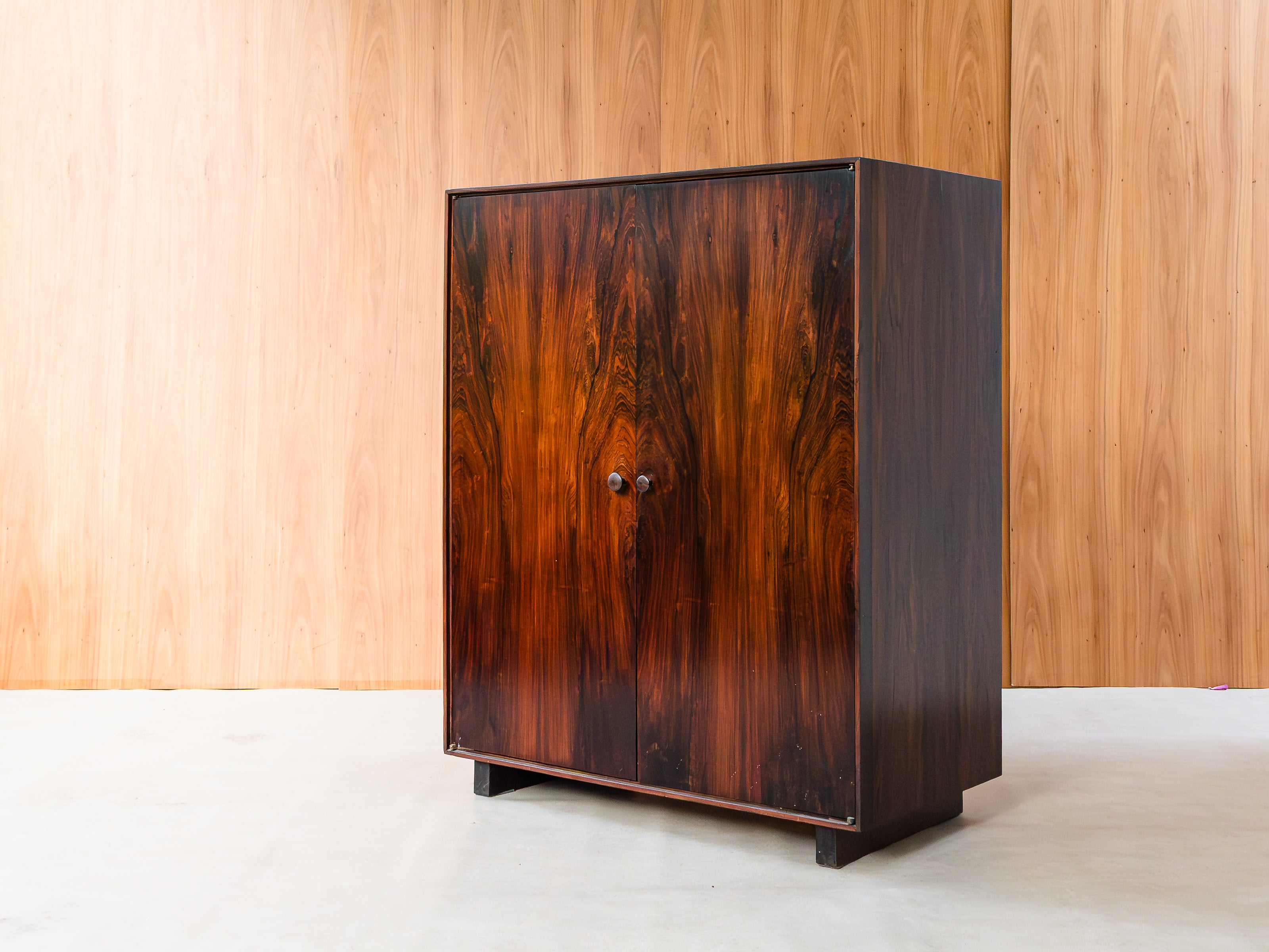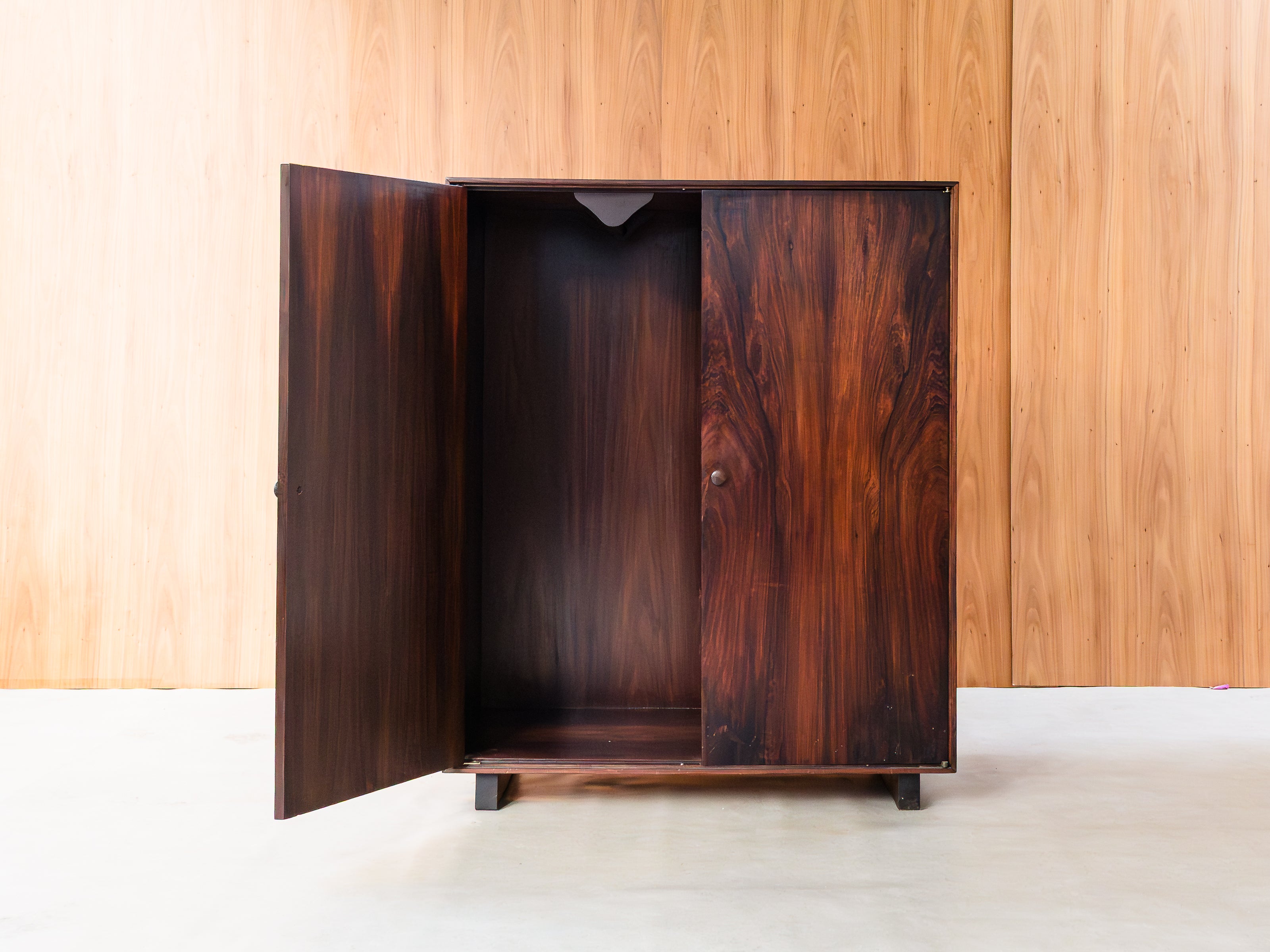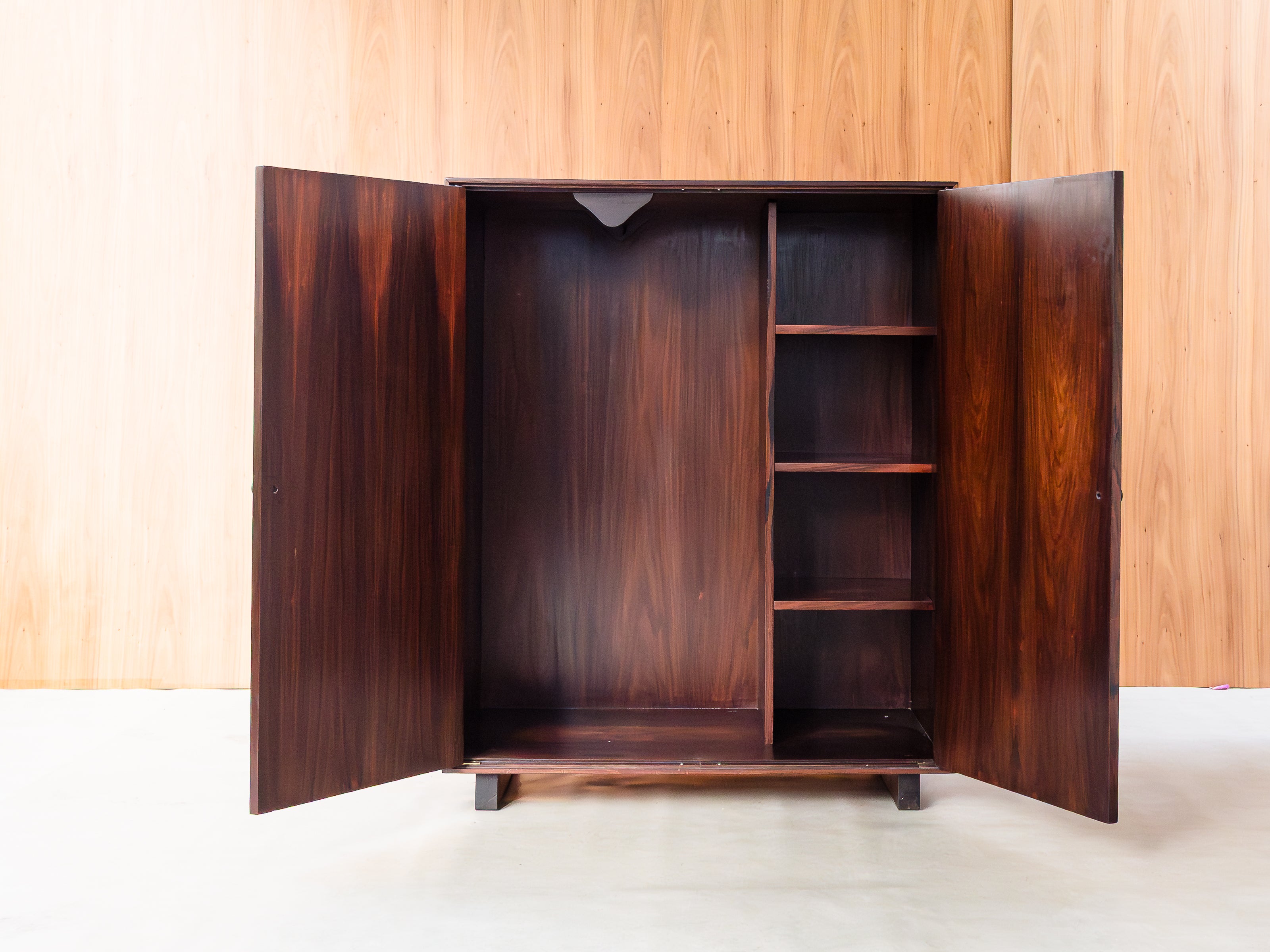 Armário folhado em jacarandá, com duas portas, apresentando quatro nichos internos (à direita) e estrutura para pendurar cabides (à esquerda). Peça totalmente restaurada, disponível à pronta entrega.