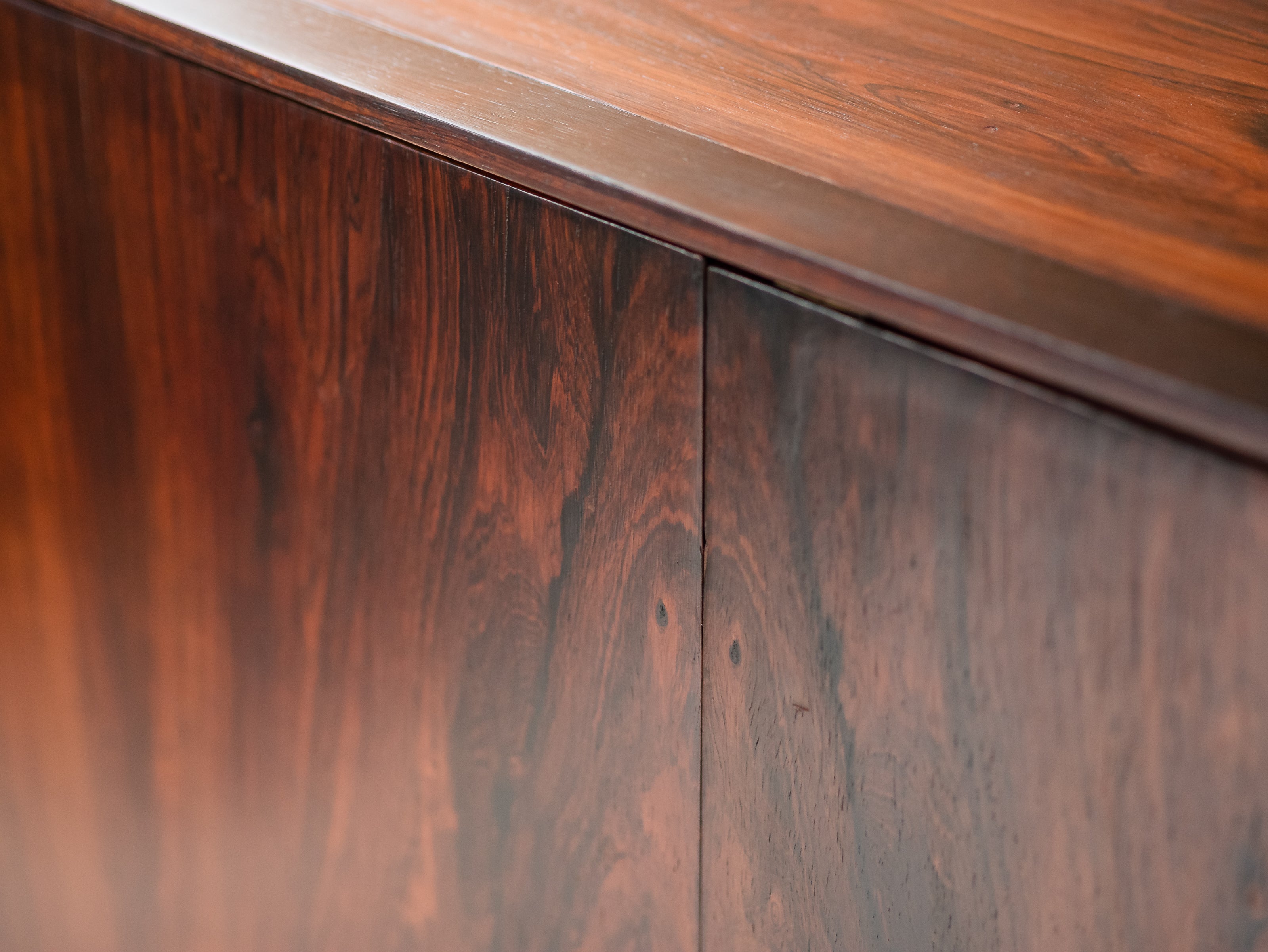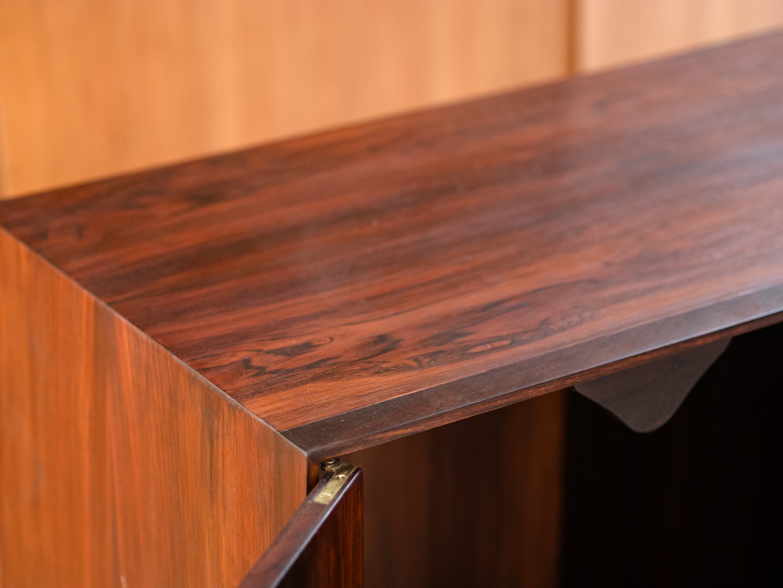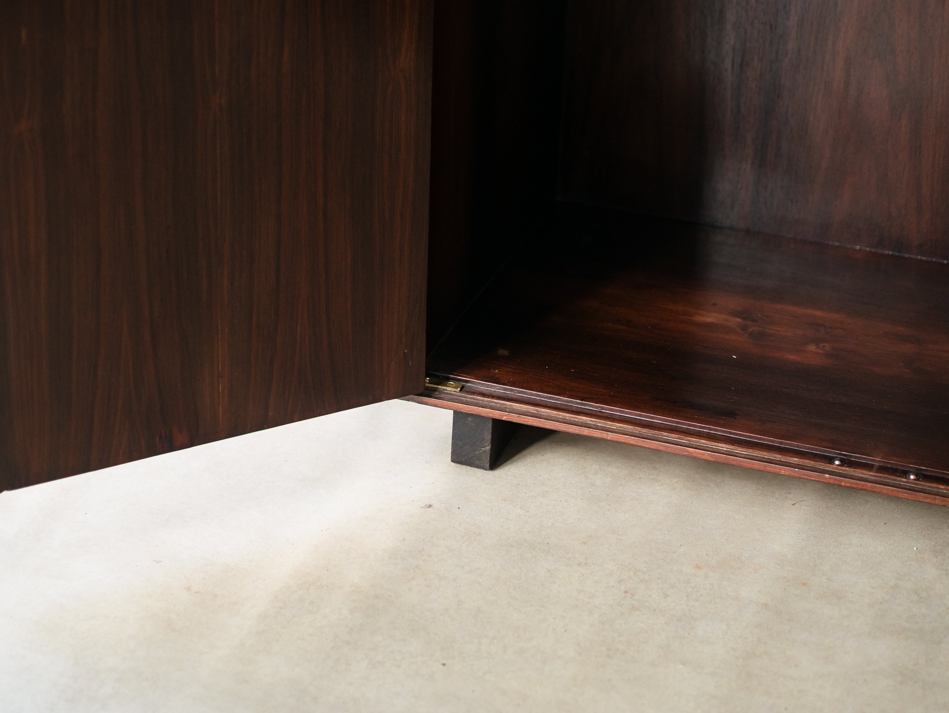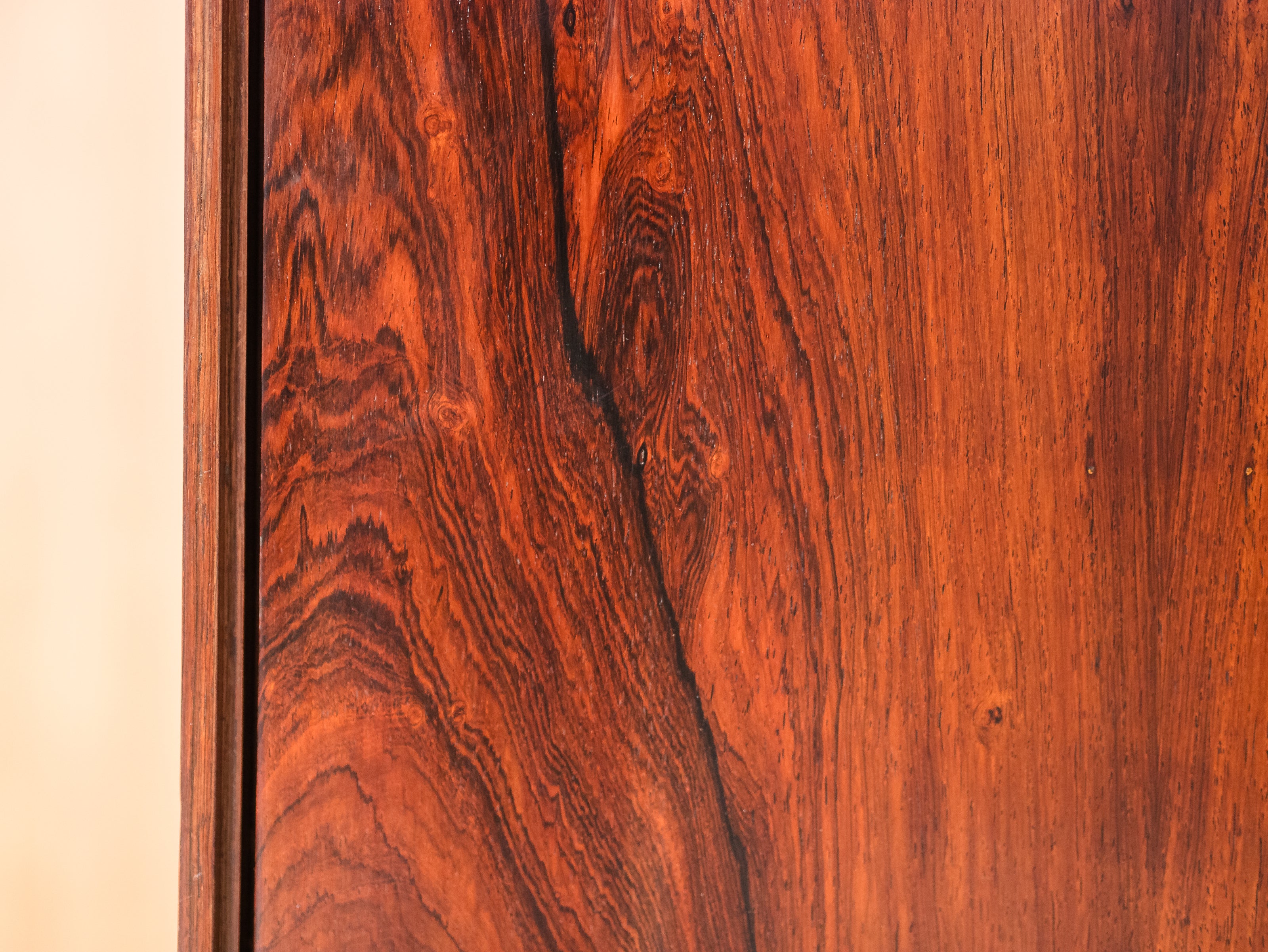 Armário folhado em jacarandá, com duas portas, apresentando quatro nichos internos (à direita) e estrutura para pendurar cabides (à esquerda). Peça totalmente restaurada, disponível à pronta entrega.