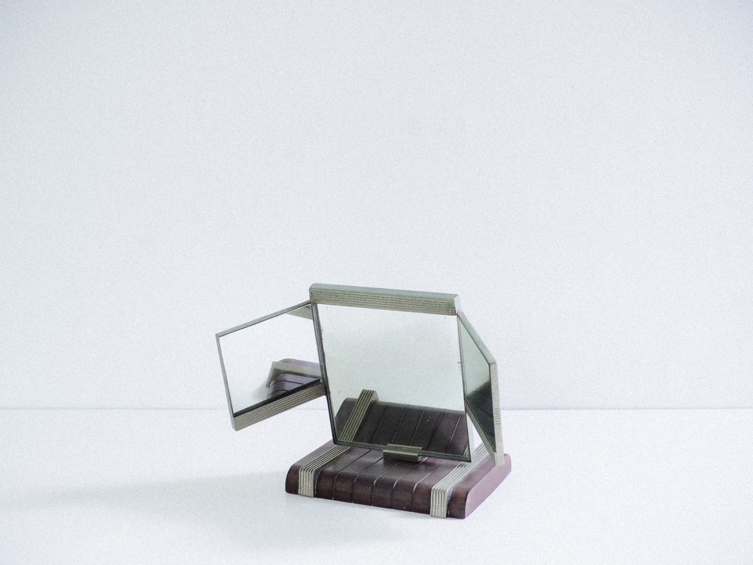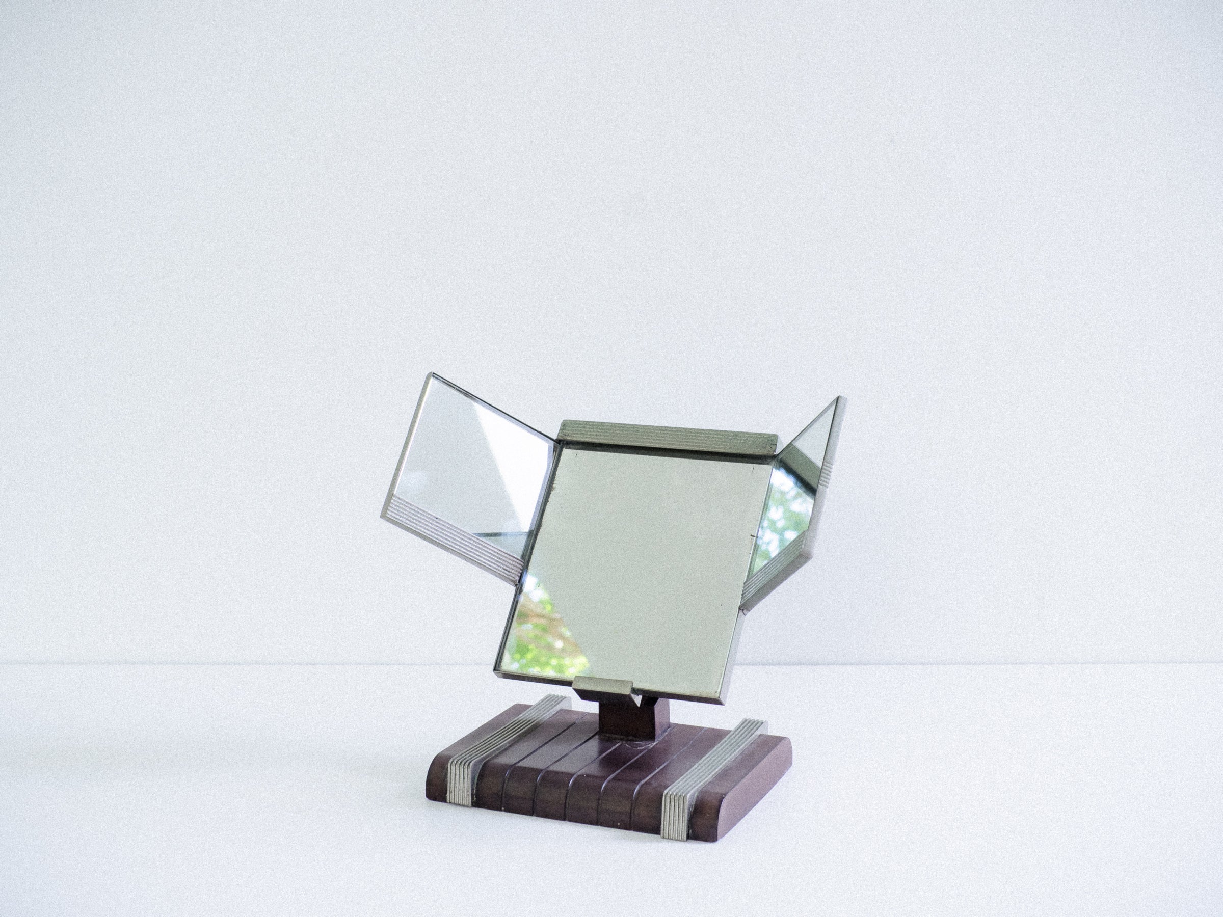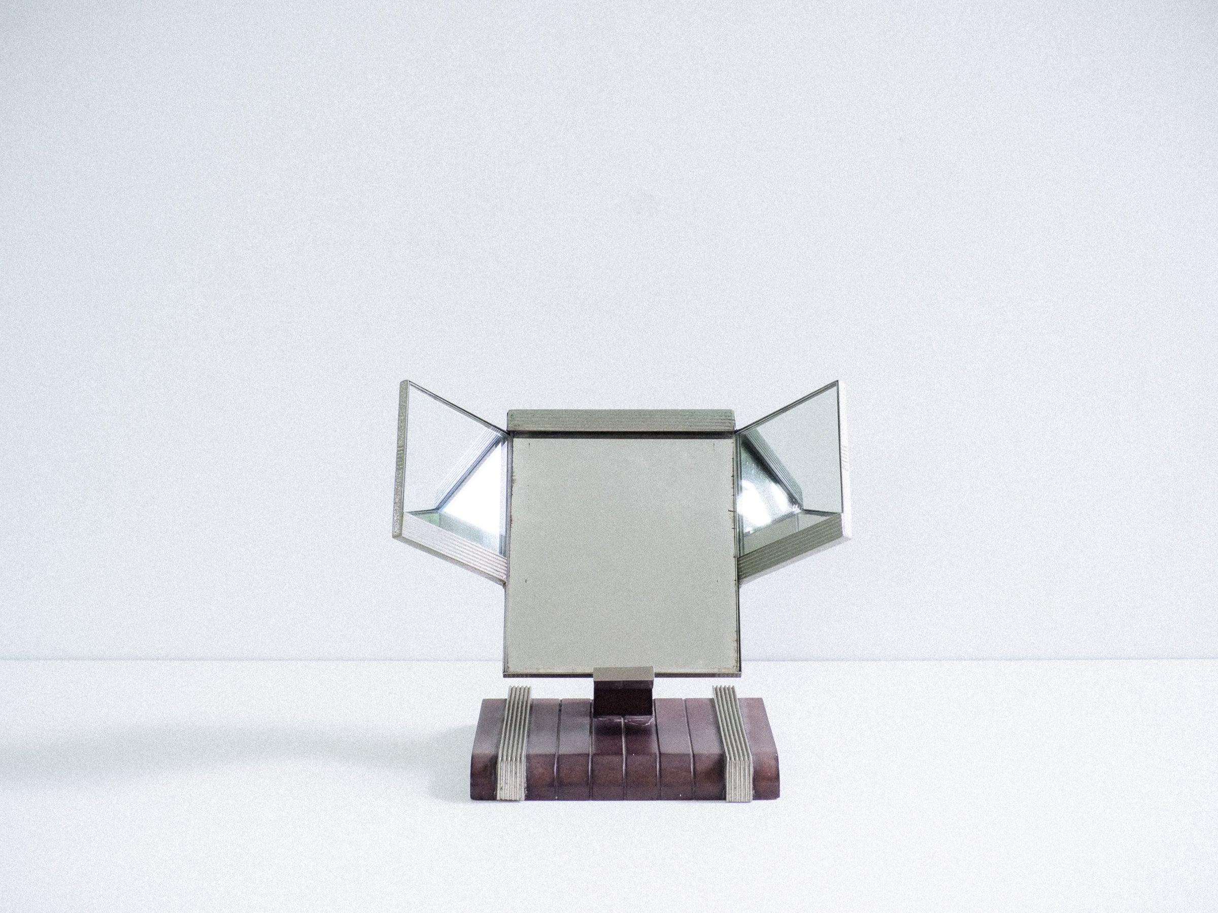 Espelho triplo de mesa com base articulada, confeccionado em cromo e aço pintado. Possui três espelhos fixos, dois laterais e um central, montados em estrutura rígida. Peça em bom estado de conservação, disponível à pronta entrega.