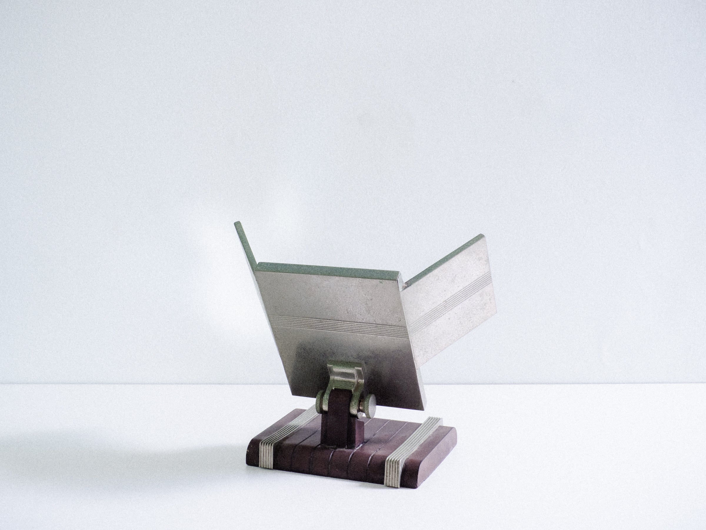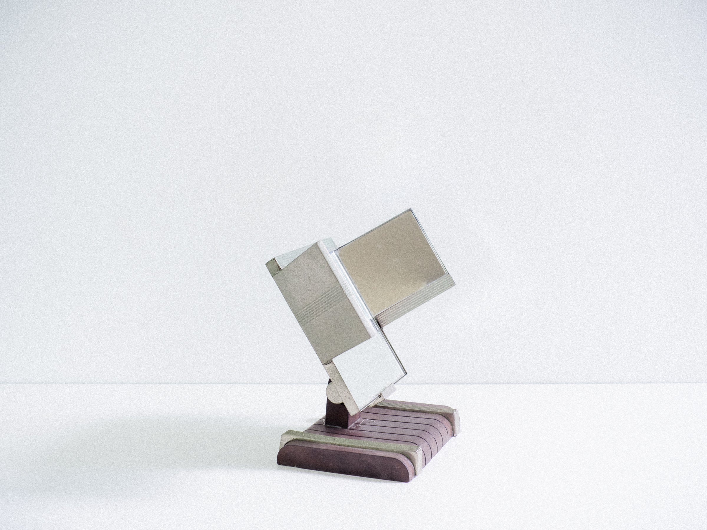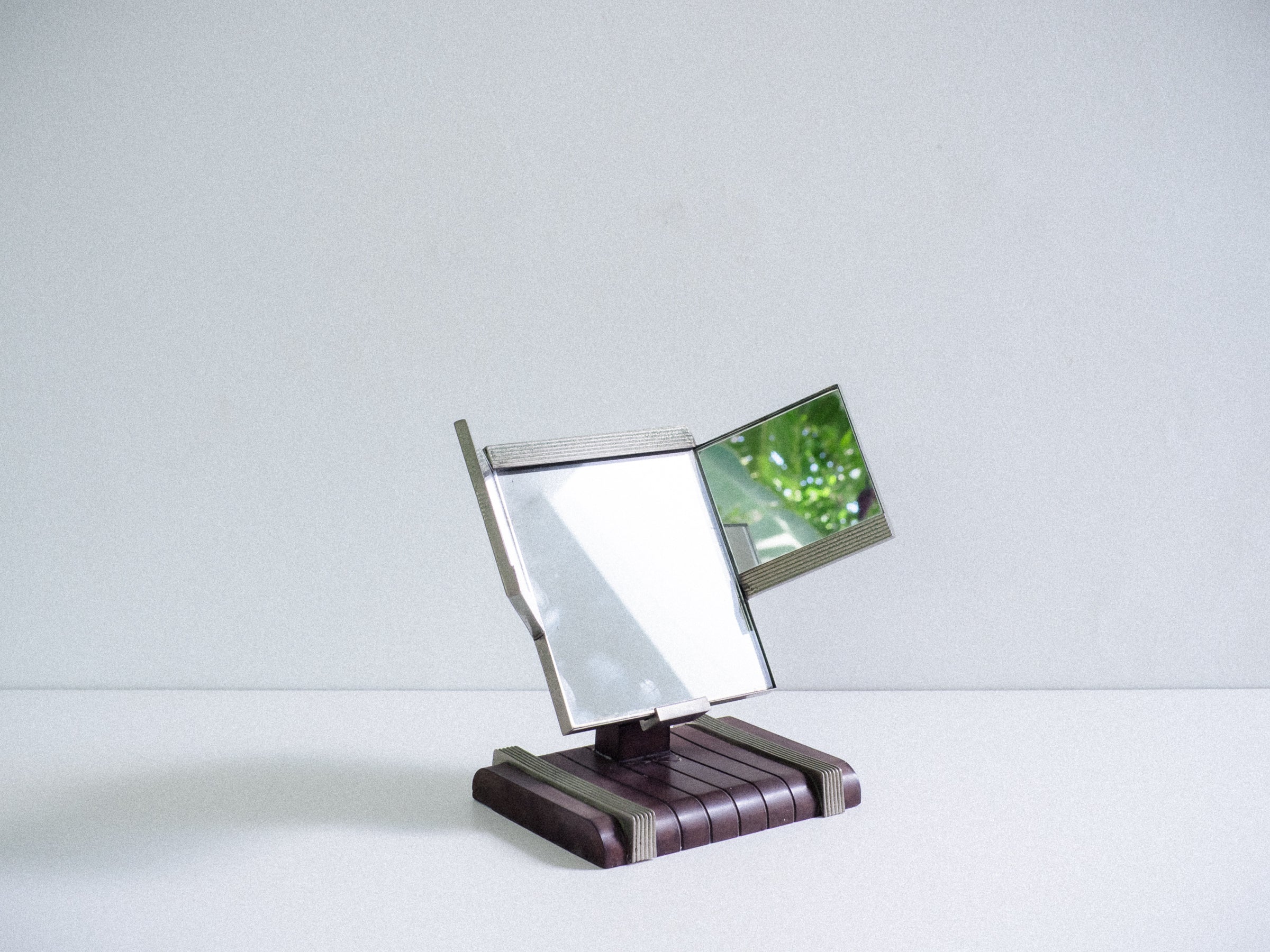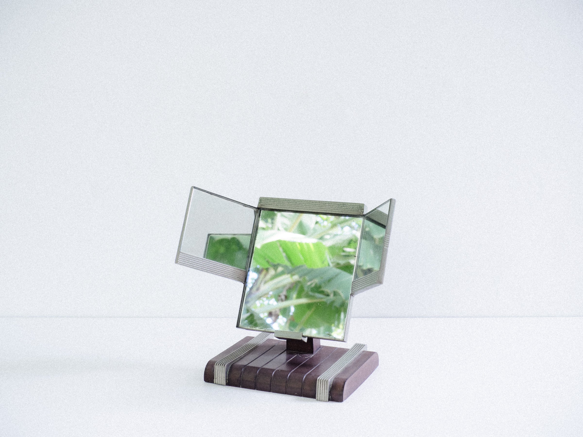 Espelho triplo de mesa com base articulada, confeccionado em cromo e aço pintado. Possui três espelhos fixos, dois laterais e um central, montados em estrutura rígida. Peça em bom estado de conservação, disponível à pronta entrega.