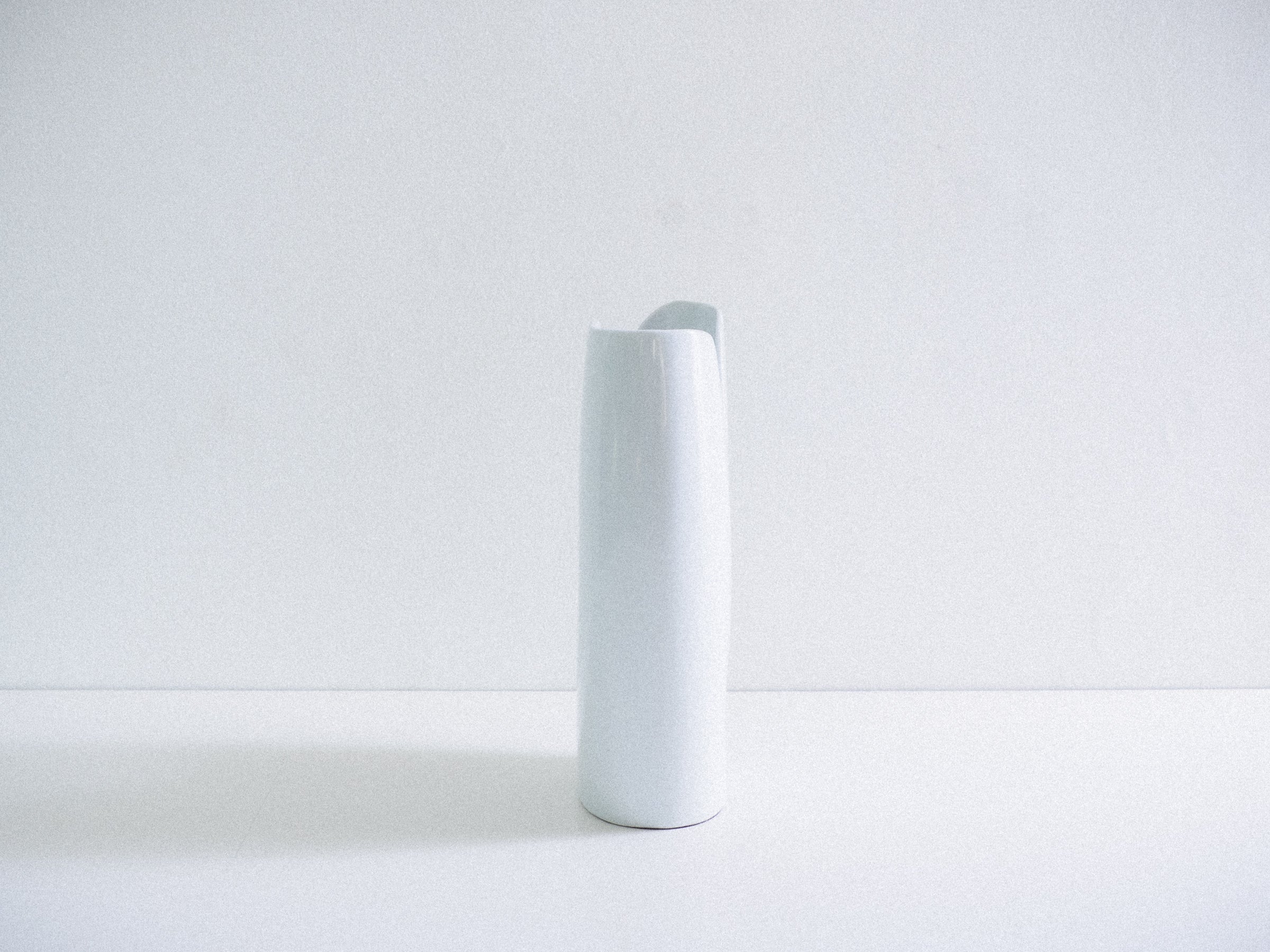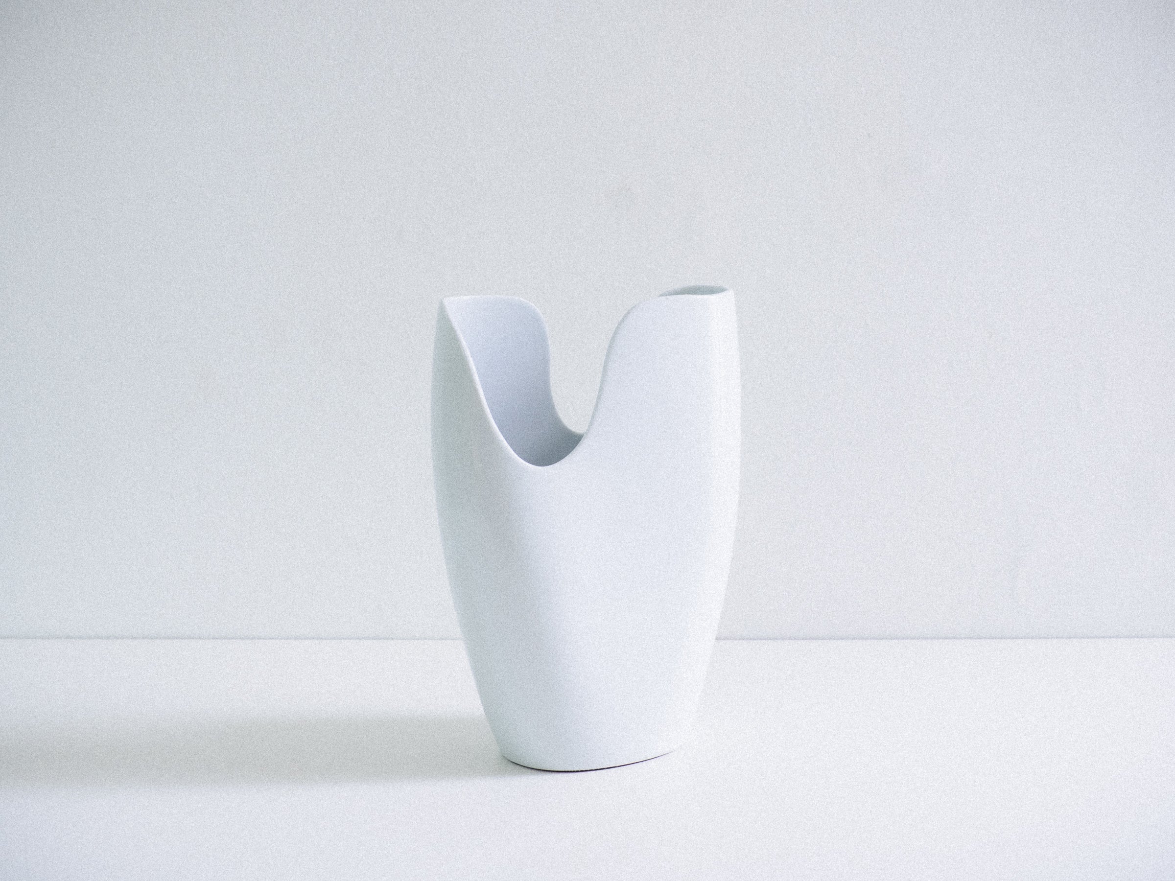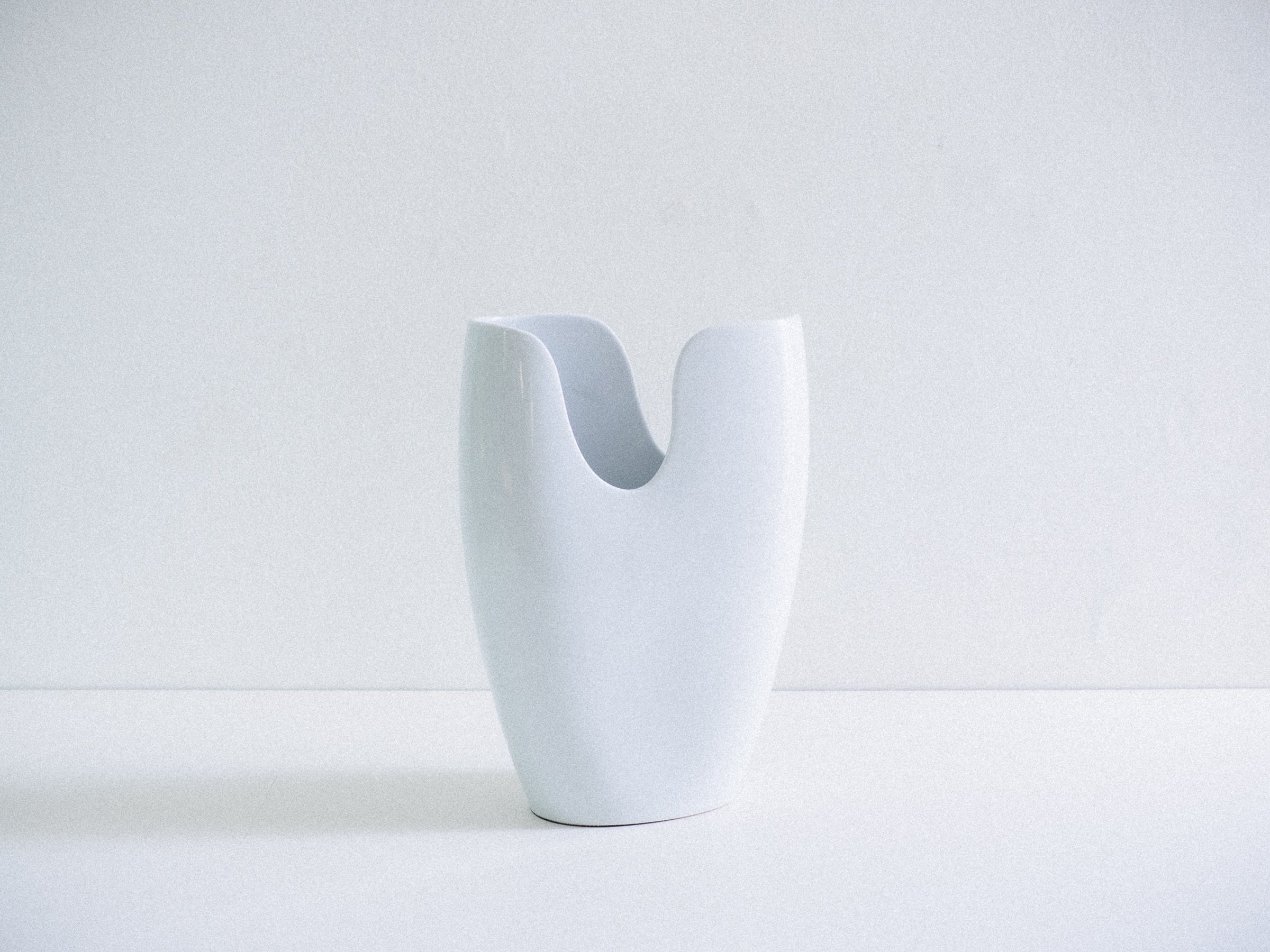 Vaso branco em cerâmica, com duas aberturas na parte superior que formam curvas suaves, acabamento brilhante. Temos uma unidade, disponível à pronta entrega.